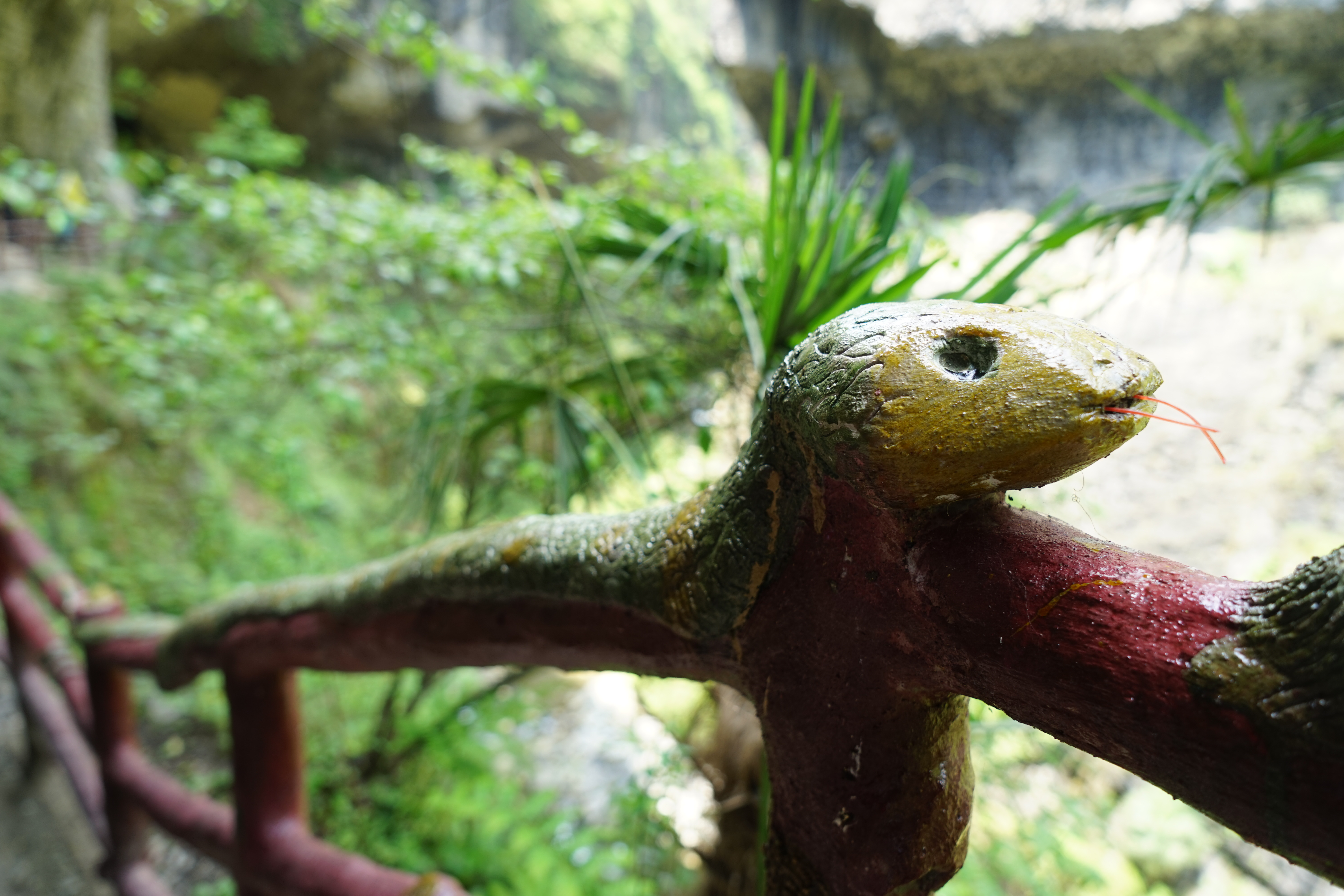 参观完鹿饮潭之后,我们前往地缝。地缝,正如其名,是大地的缝隙。其形成与峡谷的形成,地质运动有关。而历经万年,这里也形成了奇特的景观,岩石一道道裂痕是时间的见证,还有一汪清澈的潭水........漫步在栈道中,我们一边感叹大自然的神奇,栈道上也留下了修建栈道工人的创作,用泥水堆成的小人,蛇,乌龟等.....沿着栈道,我们往上回到了华仔农家.......