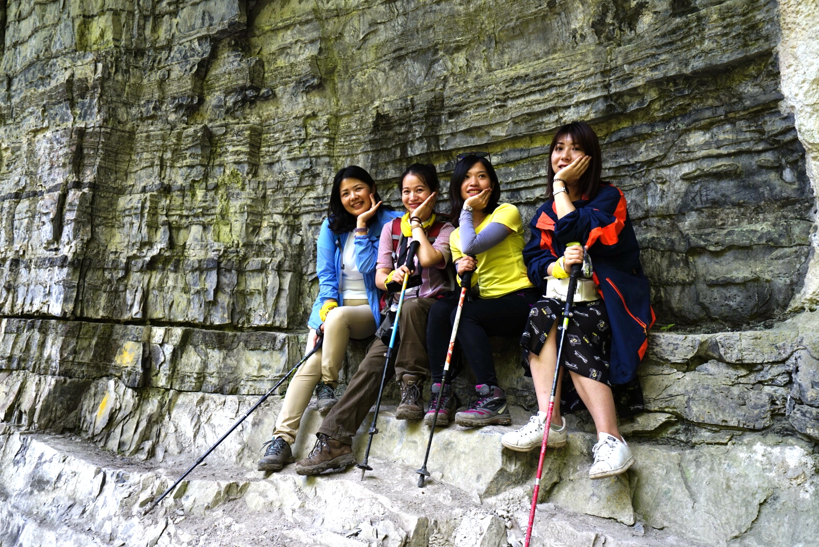 刚出发时,天气特别晴朗,大家的心情也特别的好,小政政一直紧随八戒主队走在队伍的前头,我们一遍唱着“大王派我来巡山”大步迈进,沿途的风景也特别美丽。走进山里,开始爬上坡路时我们开始体会到雨后的山路是如此的泥泞和滑,因此八戒在和团队交代了注意事项之后,团队成员在登山杖和手的帮助下,一步一个脚印的向上攀爬。下坡的路比起上坡的路就更难走了,很容易受重心的作用就往下滑,几乎每个人都摔了几次。在途中,突然下起了大雨,大家互相帮助地把背包的防雨罩盖上和穿上雨衣。当时我们顶着大雨,穿着雨衣,一只手拿着登山杖,一只手扶着石头,脚下是泥泞的山路和石头,到最后大家的手和鞋子都是脏兮兮的、沾满了泥,可想而知当时穿越的难度有多大,但是没有一个人埋怨。这就是户外人的精神吧,永不言弃和勇往直前,在互相帮助下走出困境,挑战不可能。