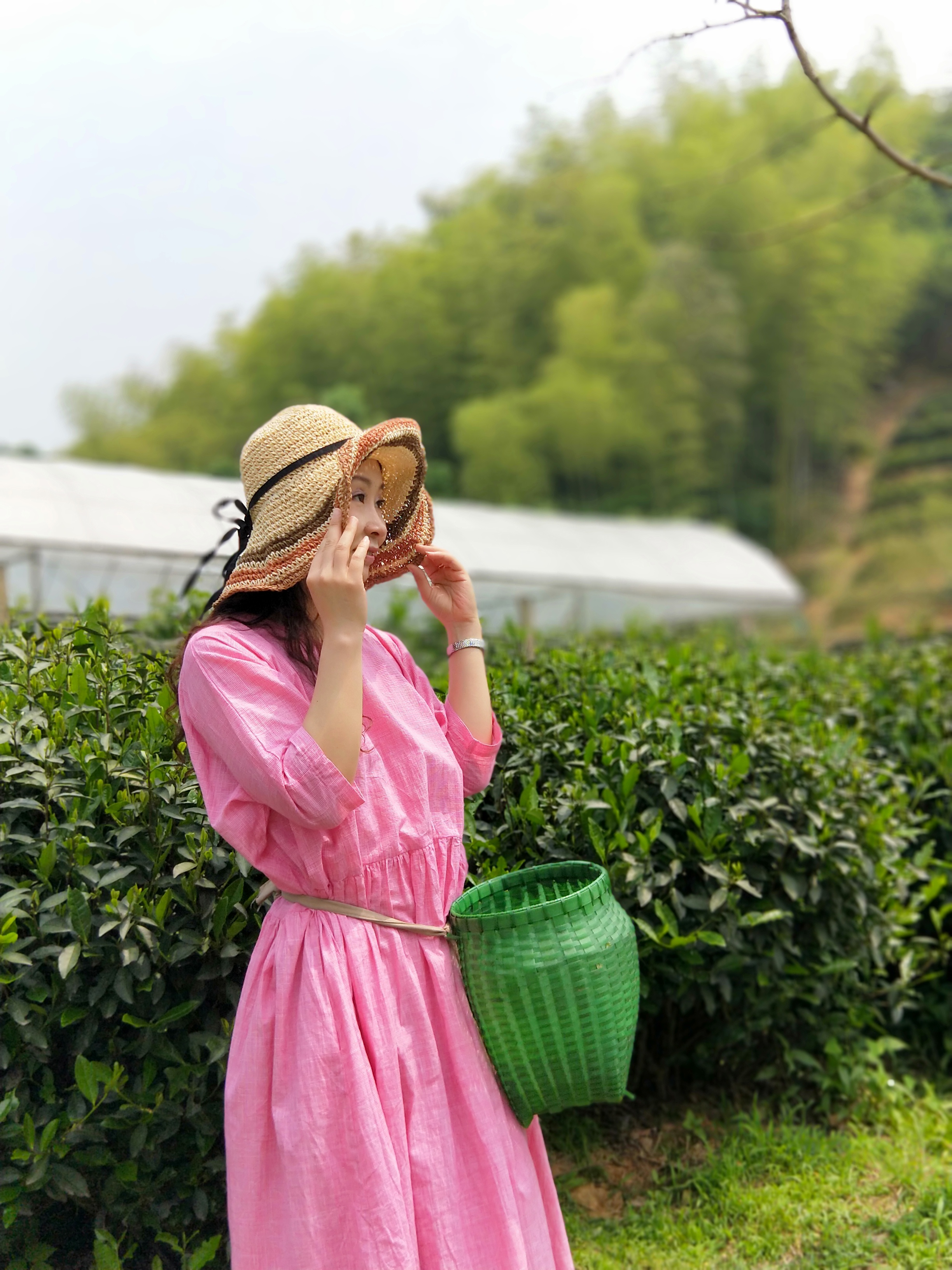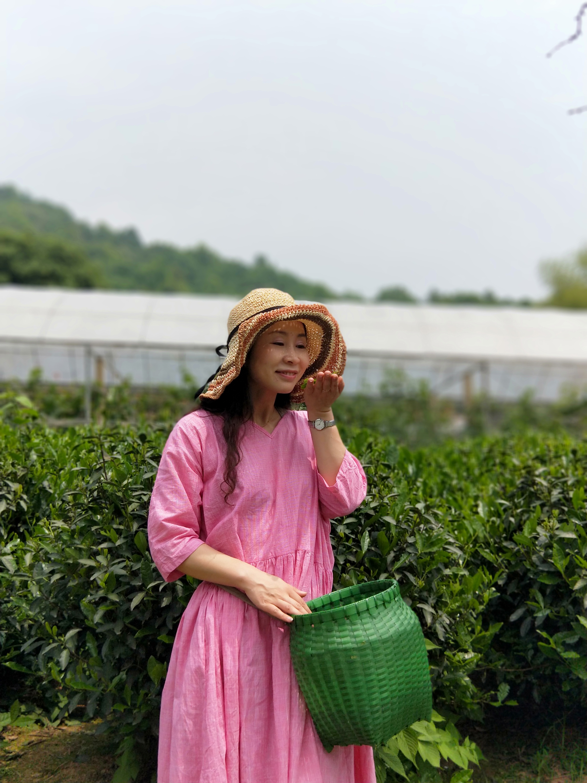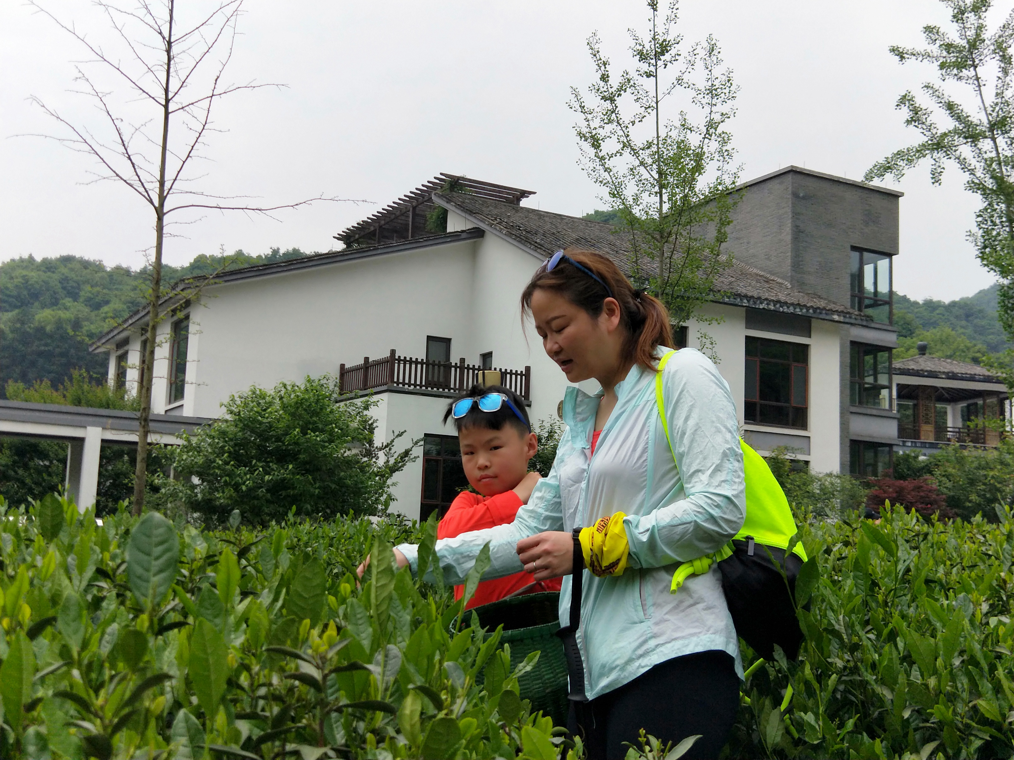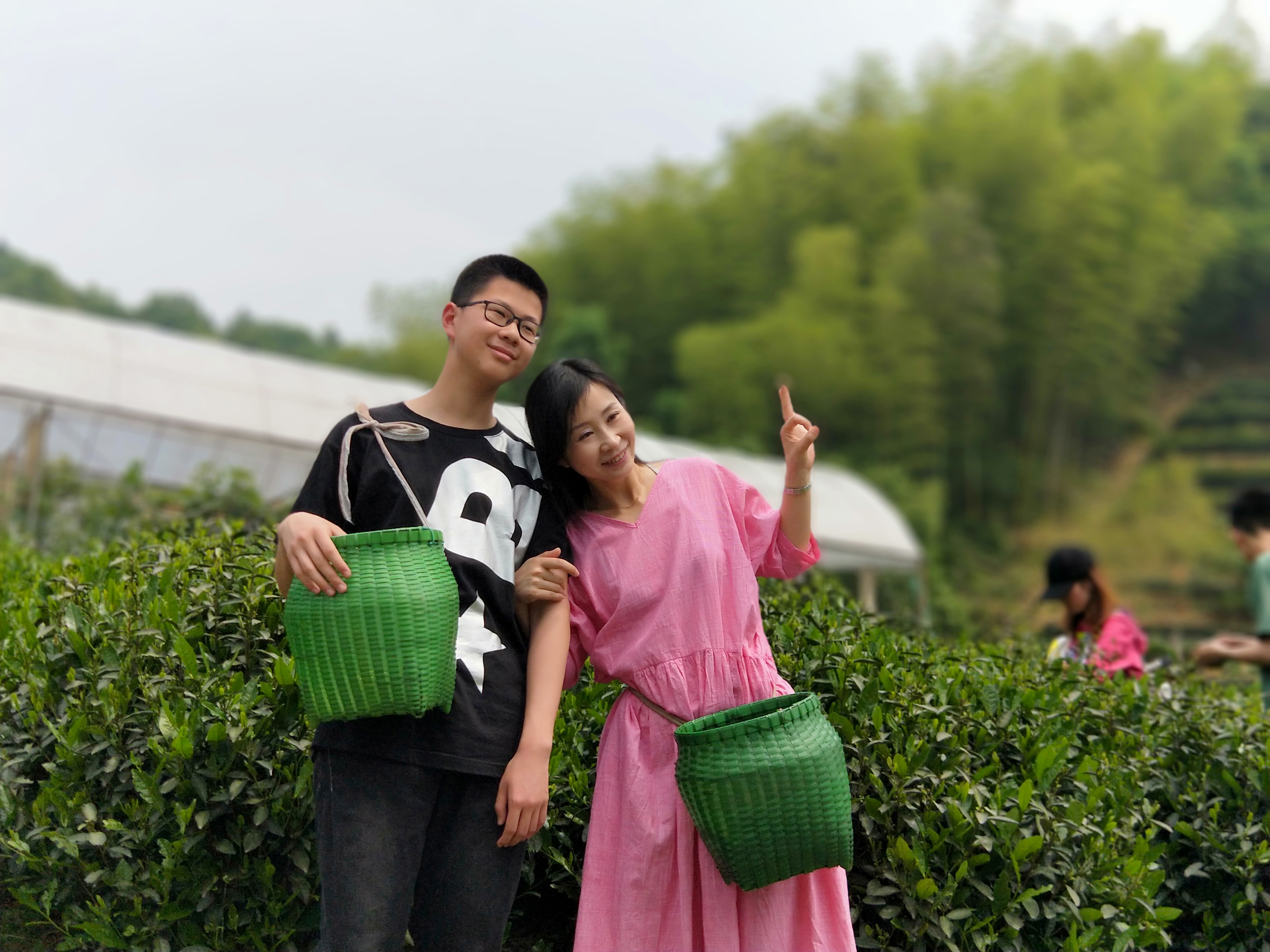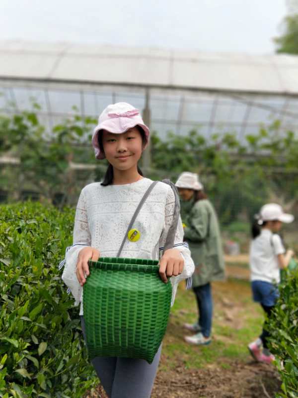 早上九点钟,我们准时从黄龙海鲜大排档集合发车,开往今天第一个目的地——富阳天地农庄,做半日小小茶农。大约十一点钟到达,为每一个家庭分发完茶篓后,便开始了采摘行动。