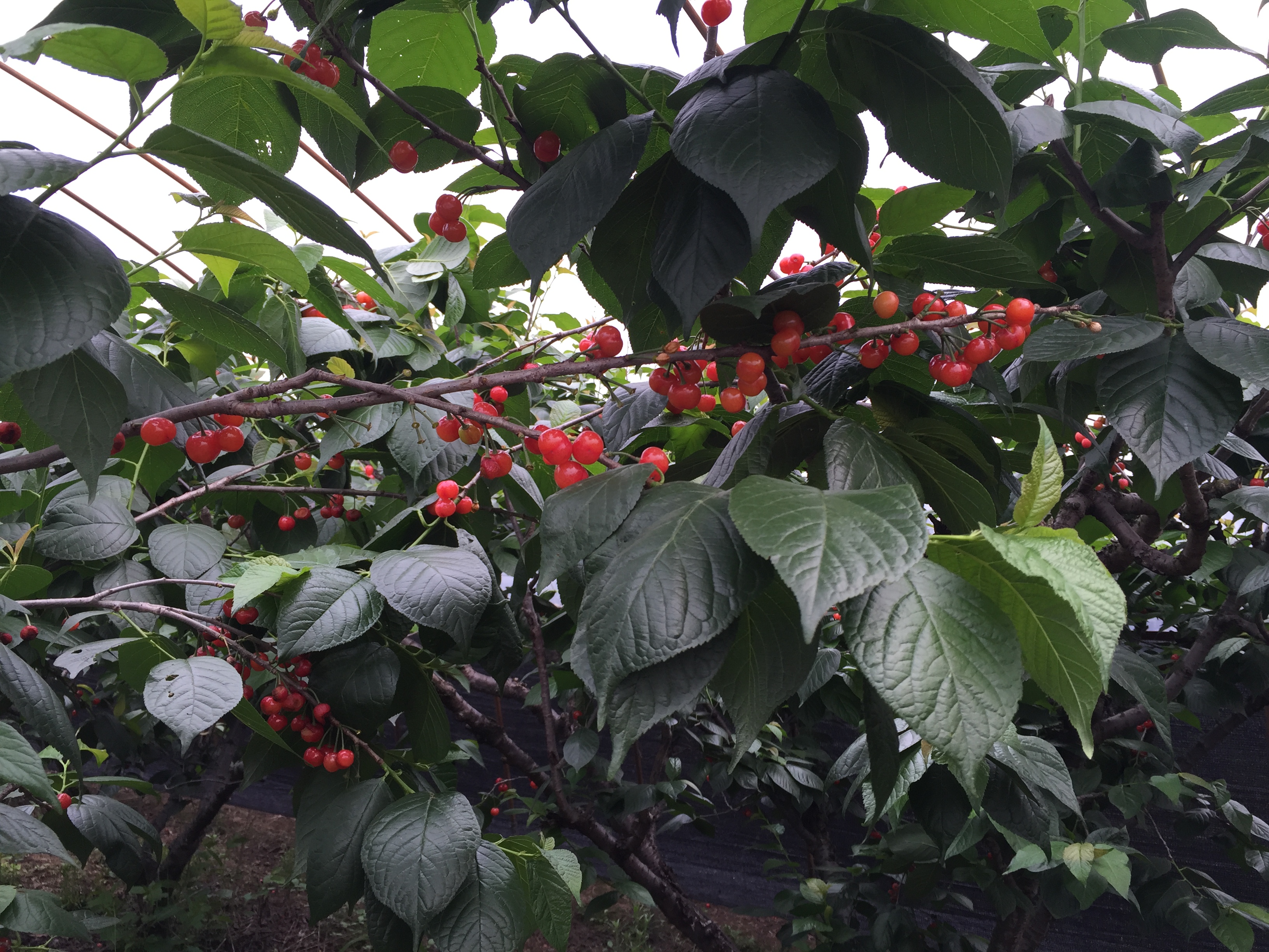 樱桃园院子很大,一排排的树都被压弯了腰。现在正值樱桃采摘季,不是很高的树木上挂满了红色宝石般的果实,稍微一碰就会掉落,反正人都进来了,大家不管三七二十一索性直接站在蹲在树下一次吃个够。