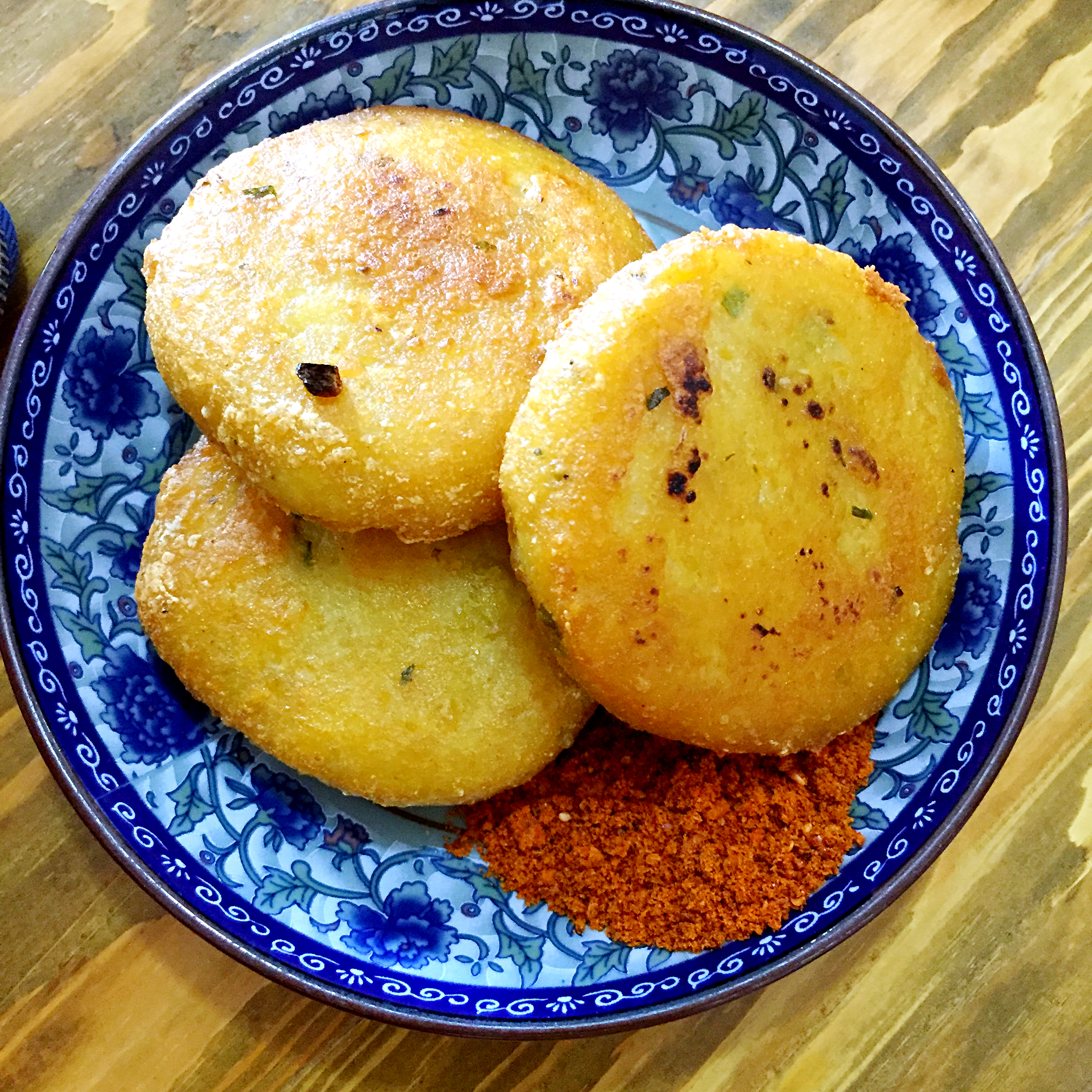在糍粑中放入豆沙馅,用油烹炸而成,具有色泽金黄、外酥内软、糯香爽口的特点。馅心咸鲜,老少皆宜。