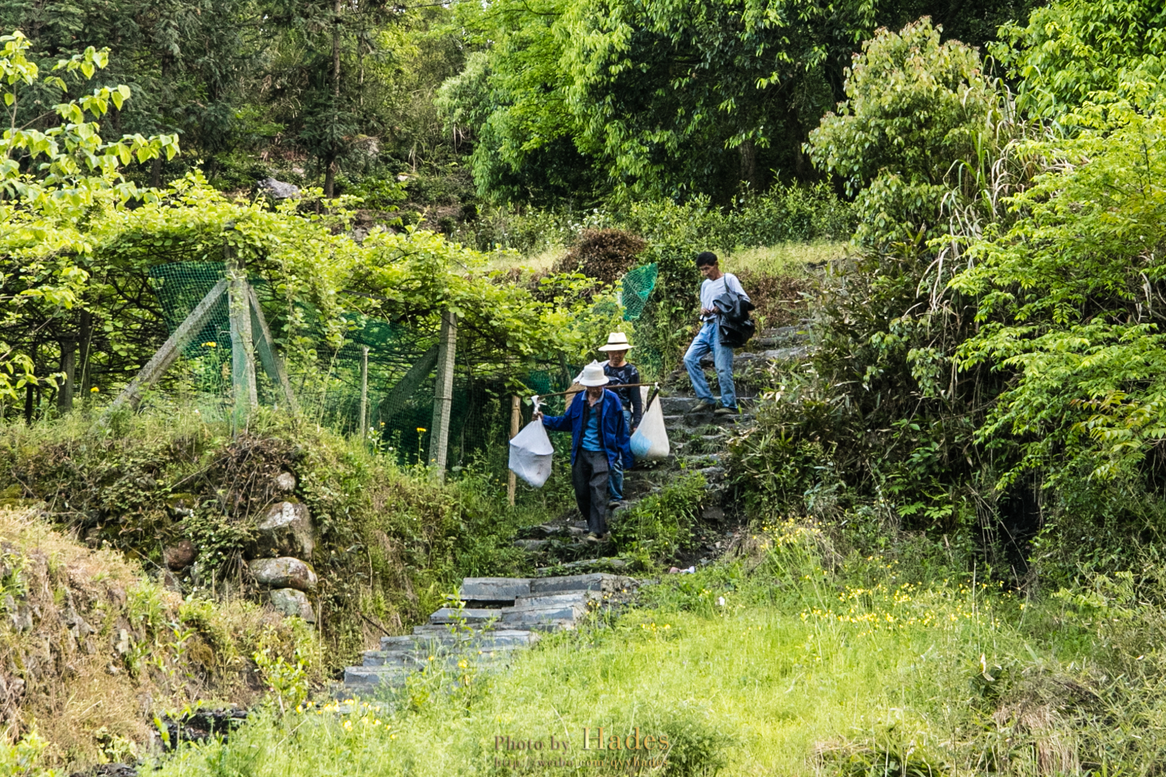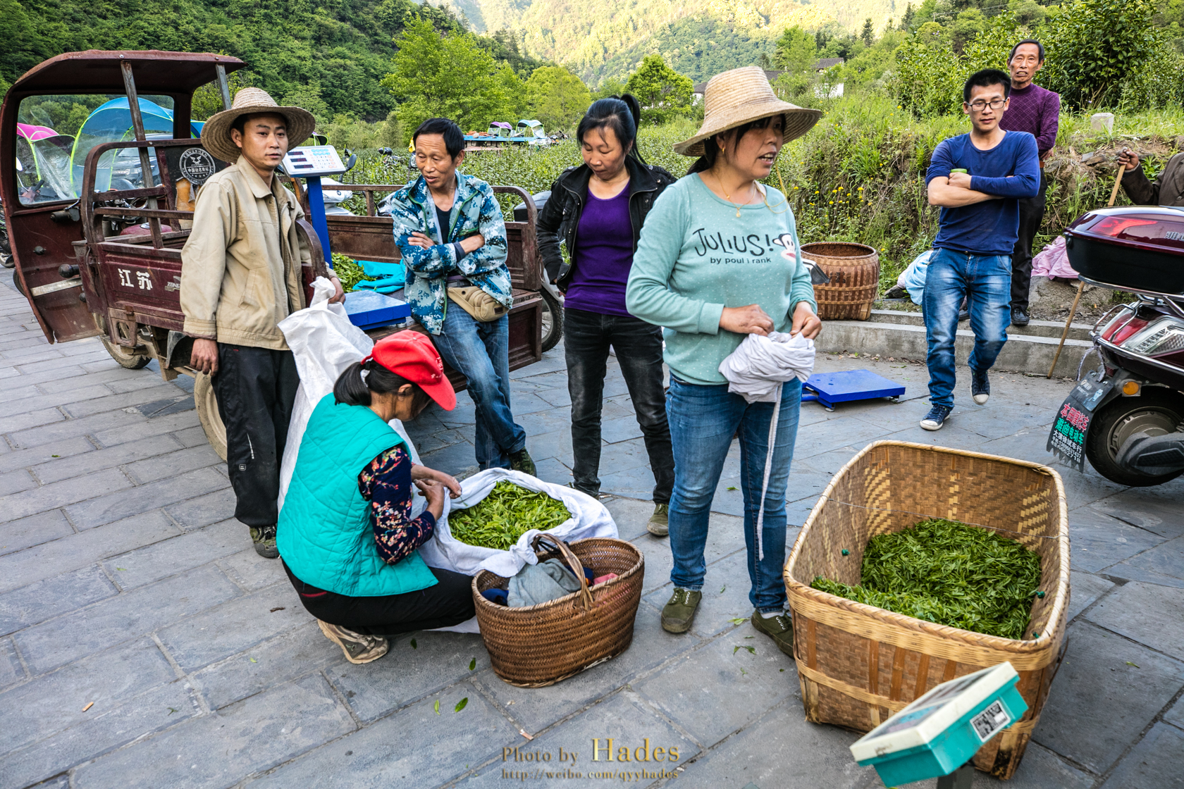 行到村口,渐渐听到一些喧闹的声音。远望山野,有采茶的乡民络绎归来。收购茶叶的小贩已在村口摆了秤案,第一时间收购这最新鲜的青茶。