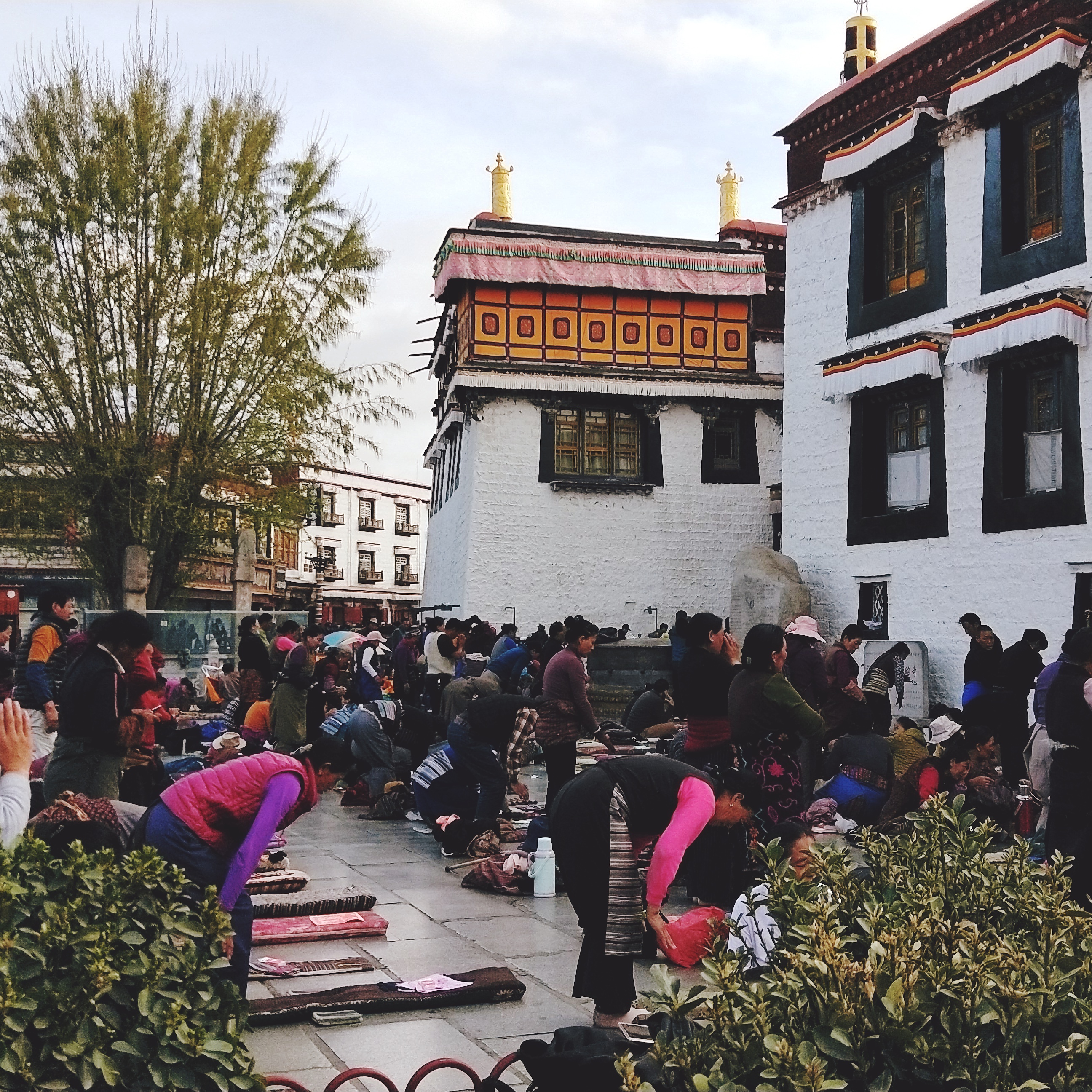 这张照片是我们在排队进大昭寺时拍下来的。一直都听闻西藏是个信仰度极高的地方,但是没亲眼看到都是不怎么相信的。在这里我看到很多步履蹒跚的老人和坐着轮椅也要来朝拜的老人,虔诚的绕着整个寺庙转,手里拿着转经筒,嘴里念念有词。还有的信徒就是以五体投地的形式来朝拜,不管男女老少。