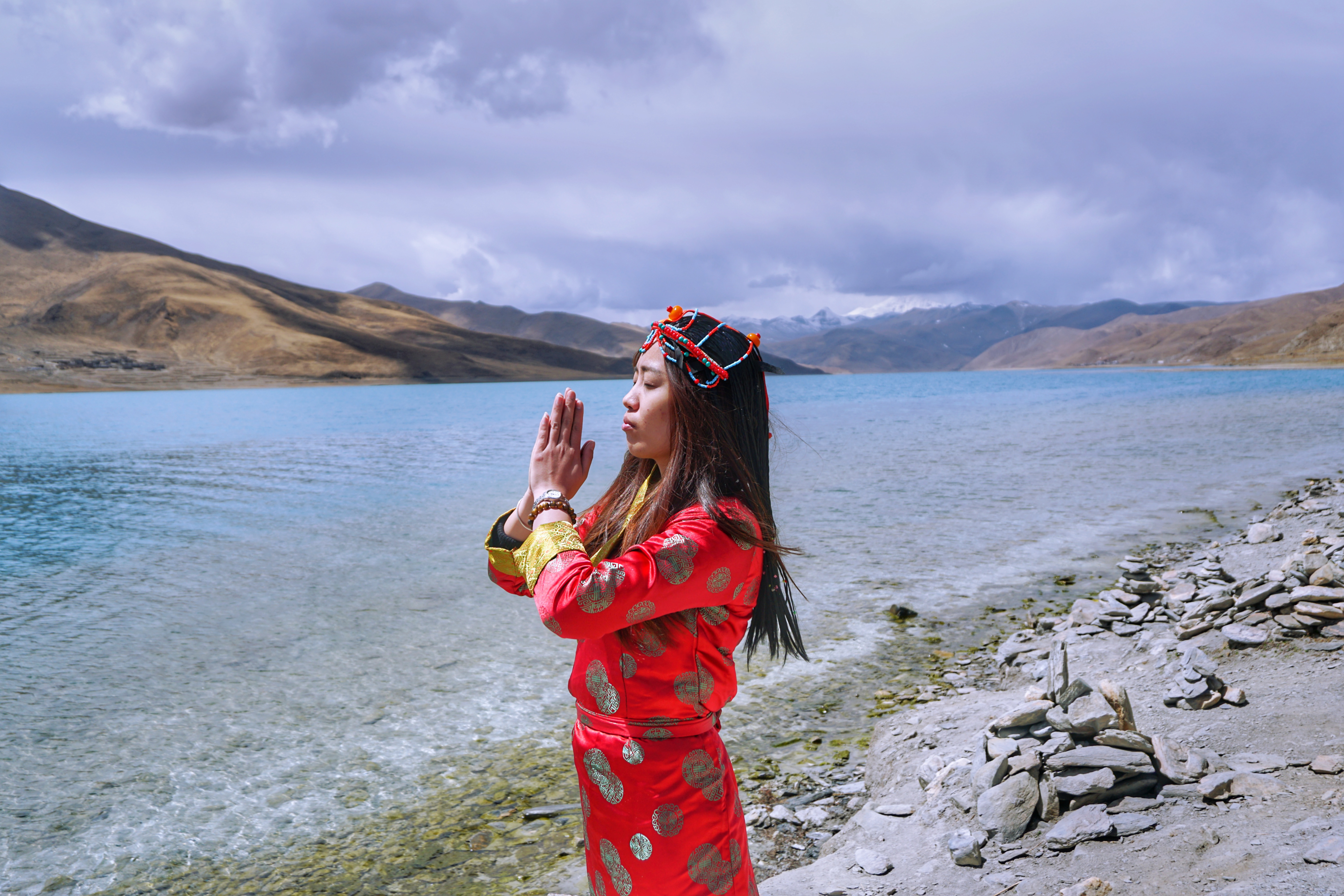 看完全景,我们开车到山下的湖边去挂经幡,然后在换上藏服拍几张比较有特色的照片。