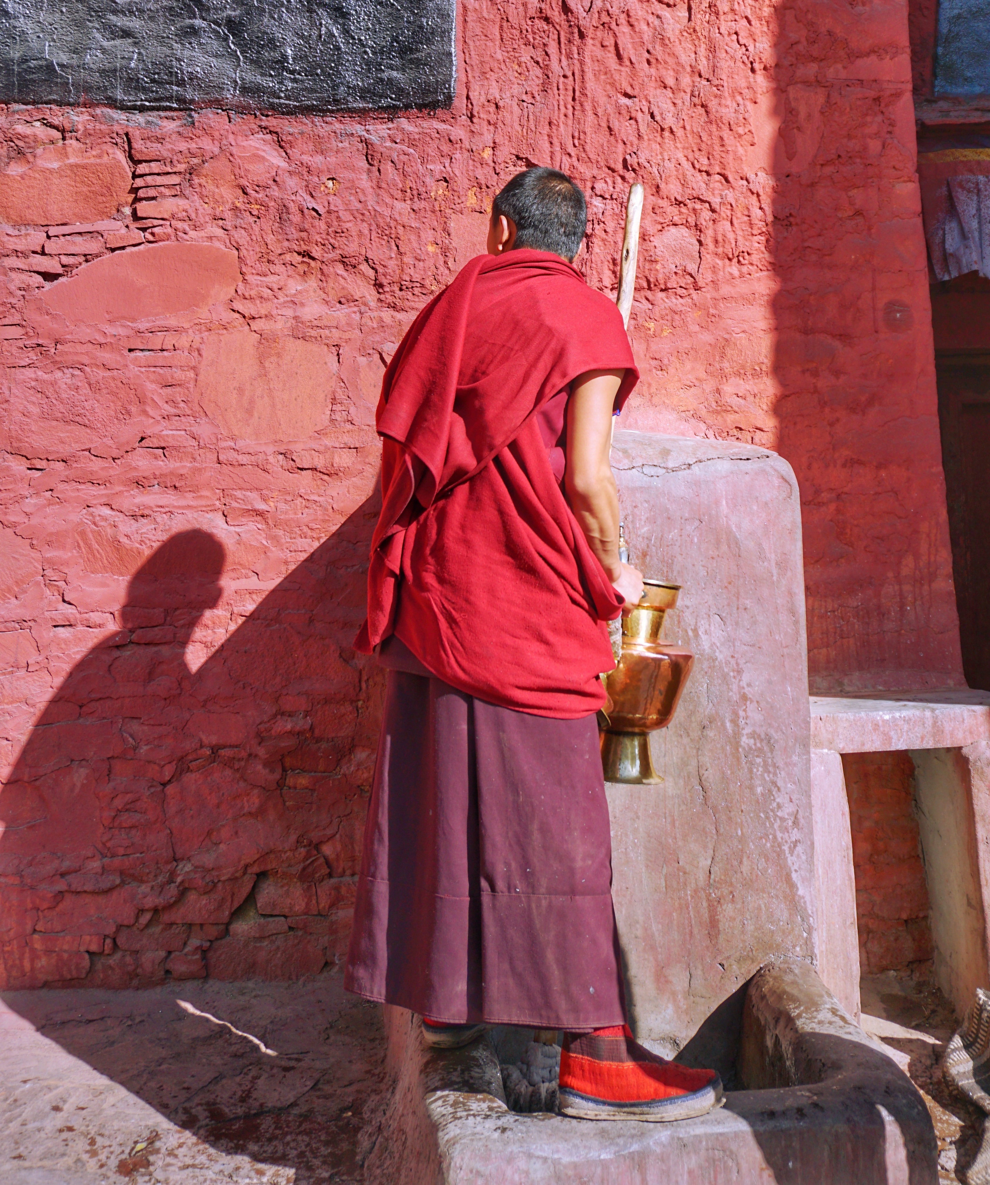 参观完出来看到有个小和尚在打水,不知道是用来干嘛的!听央导说扎什伦布寺是僧侣修行最严的地方,服装都是统一的,尤其是鞋子,只有这里还统一穿这样的僧鞋。