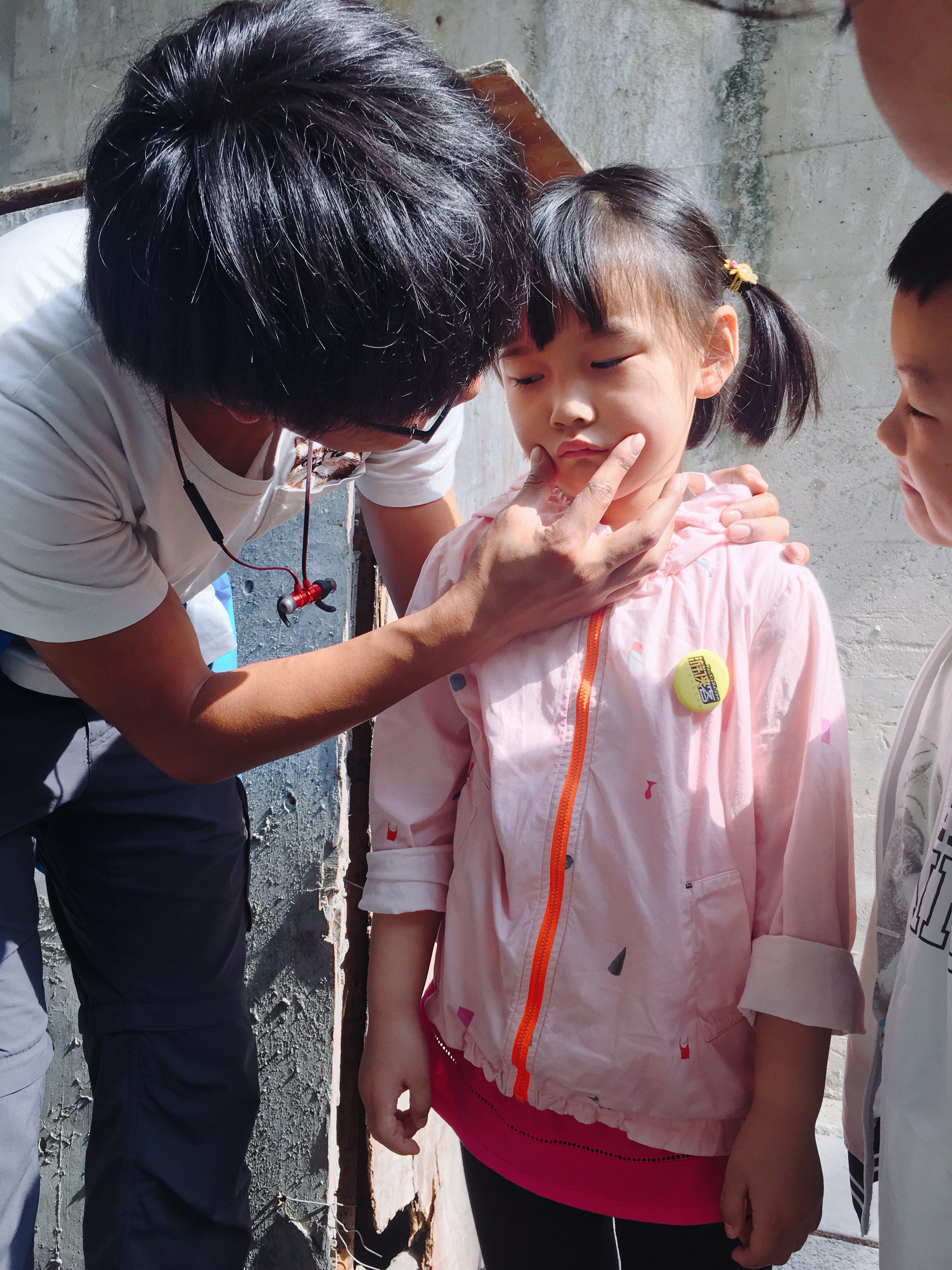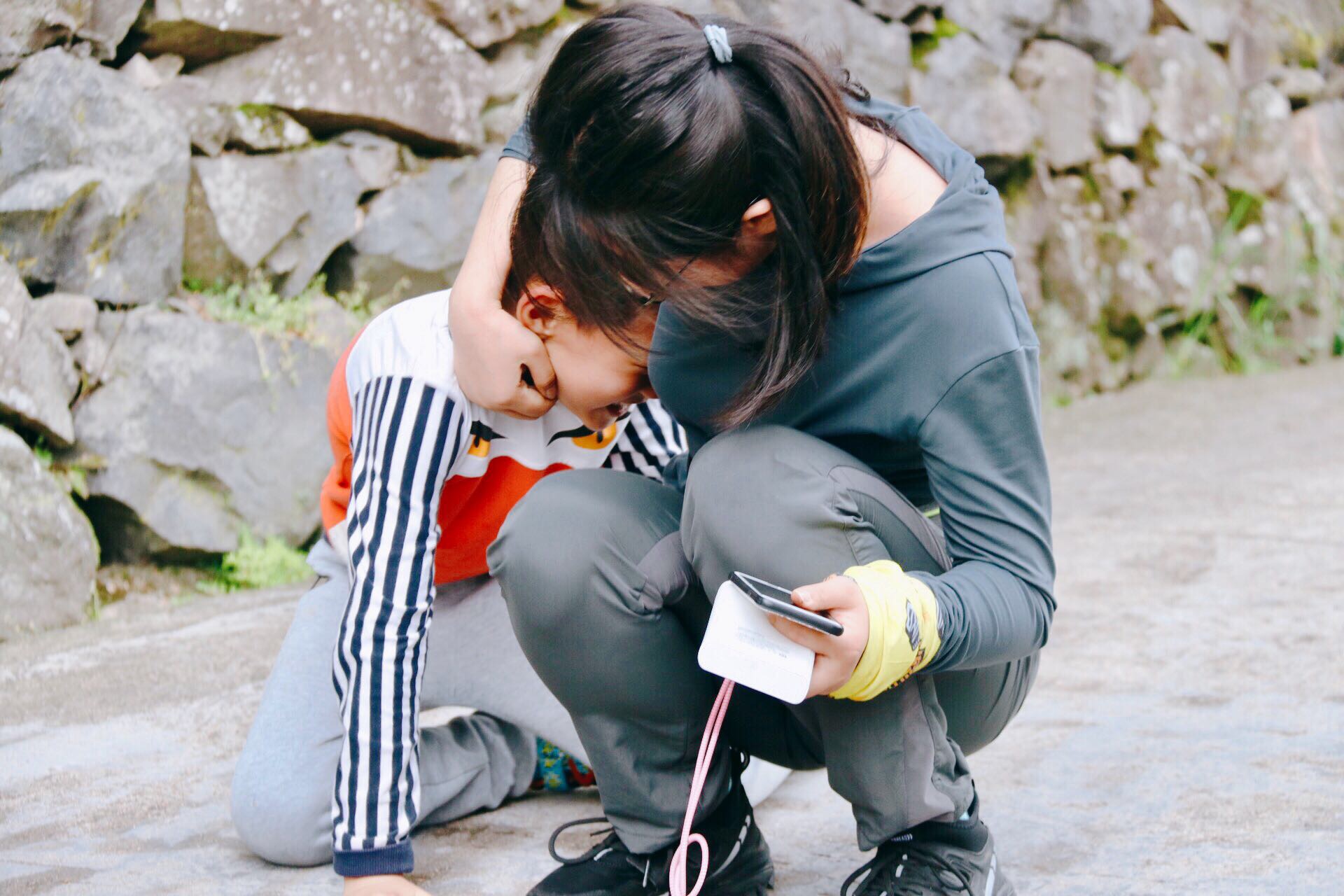 这两个宝贝儿一路上都粘着黑仔哥哥不放手