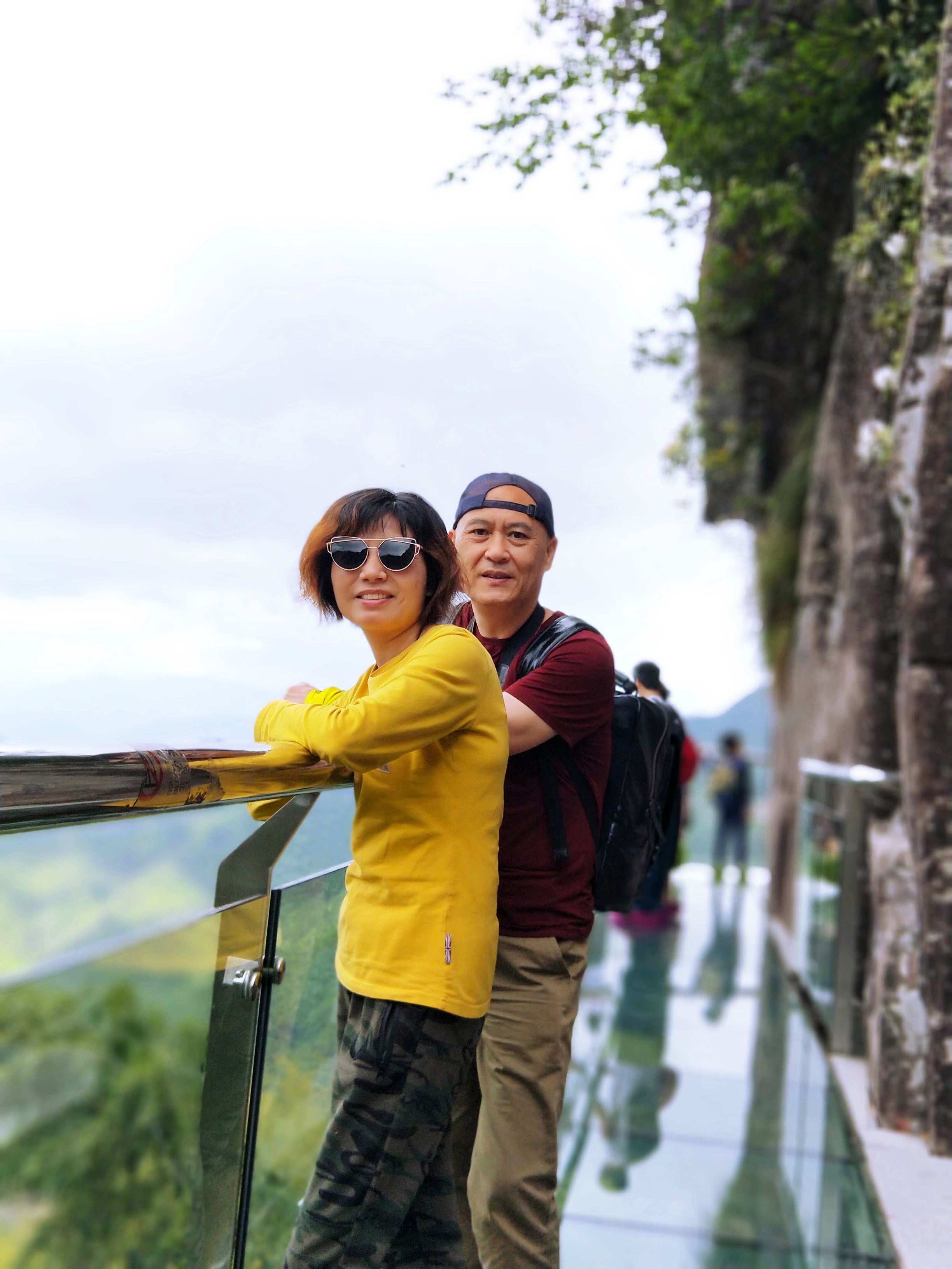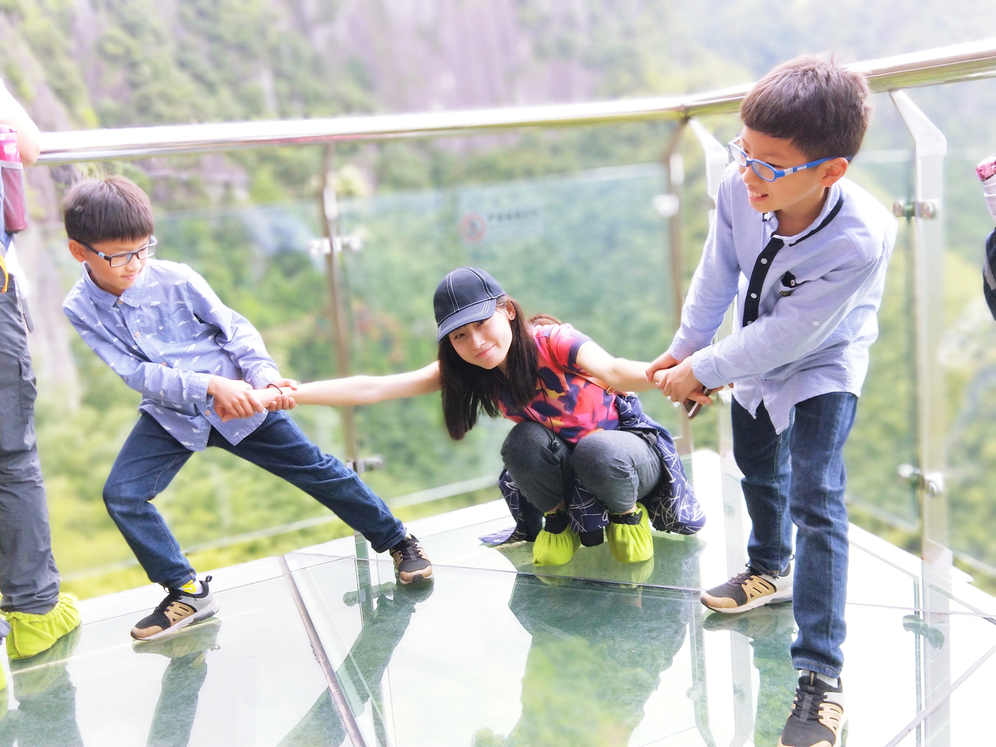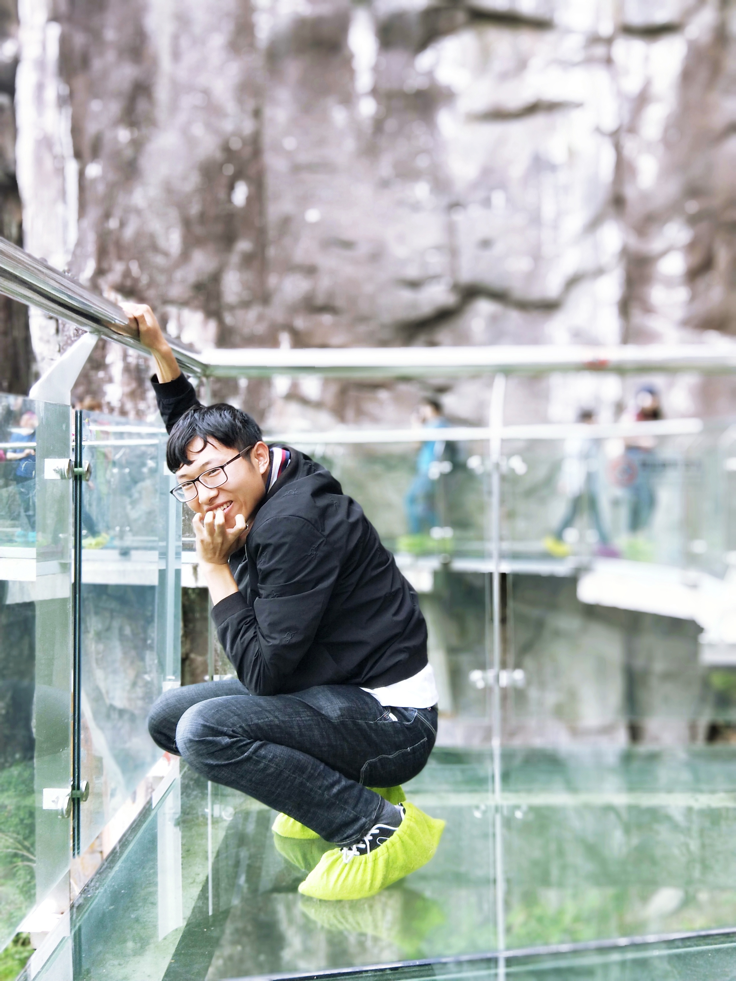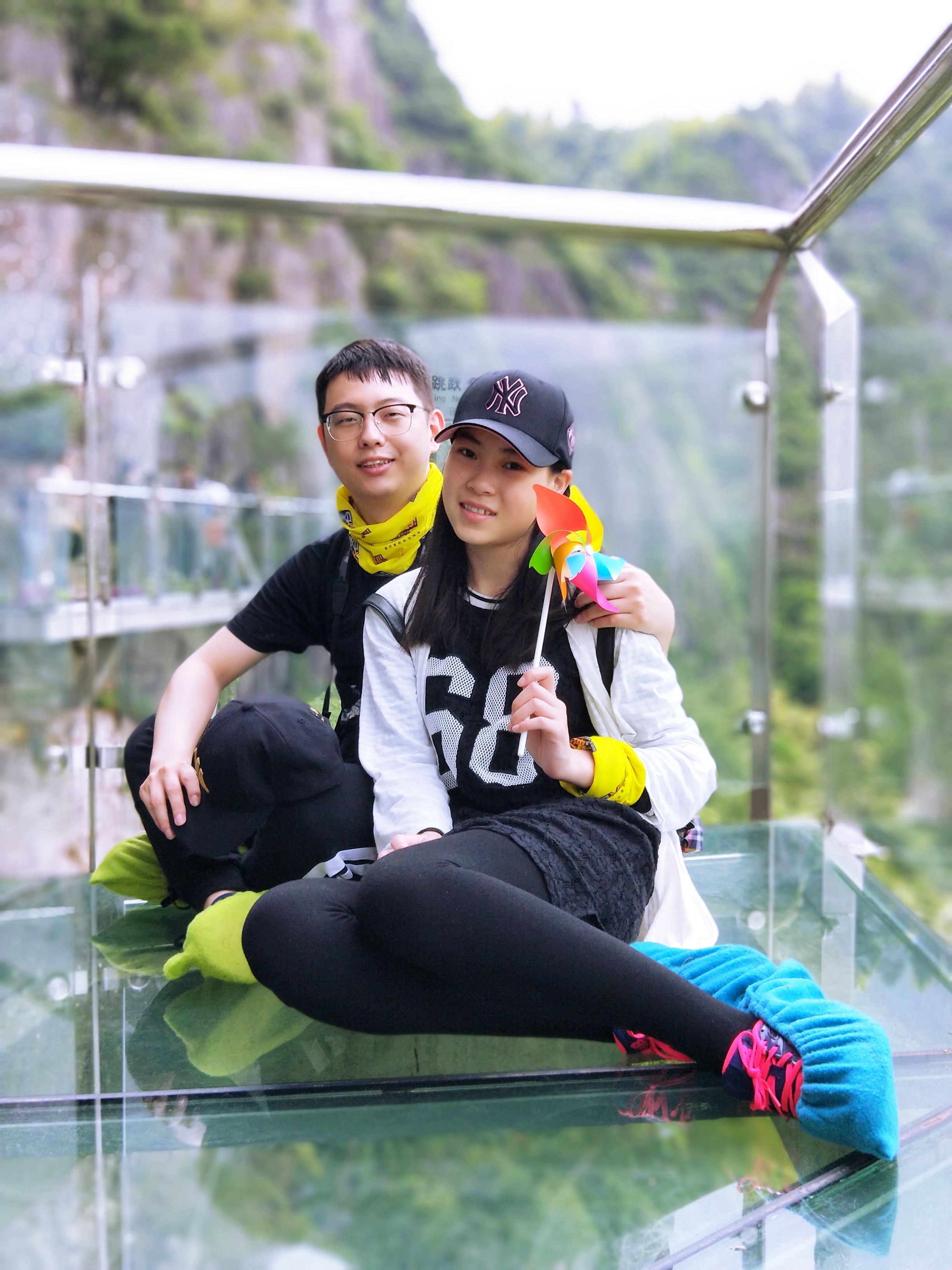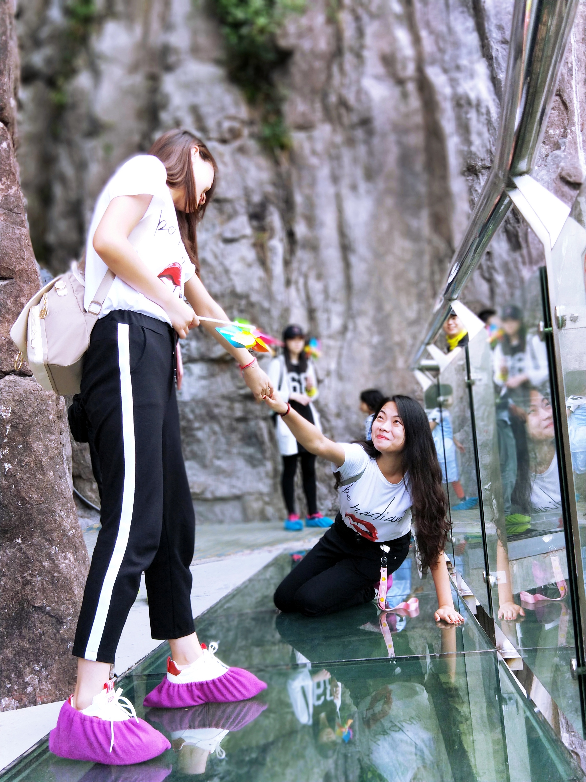 下坡时陡峭的阶梯,让人不禁有点腿软,一定要小心、小心、再小心。玻璃栈道,让恐高的你不敢移动,哈哈哈……上几张大家恐高的照片。
