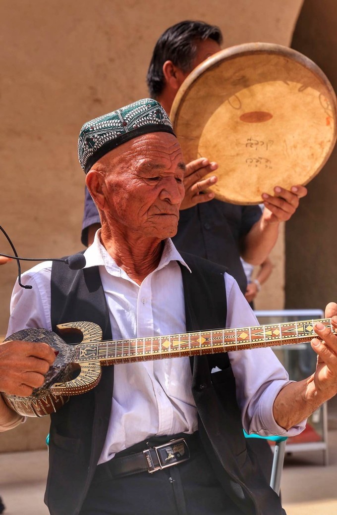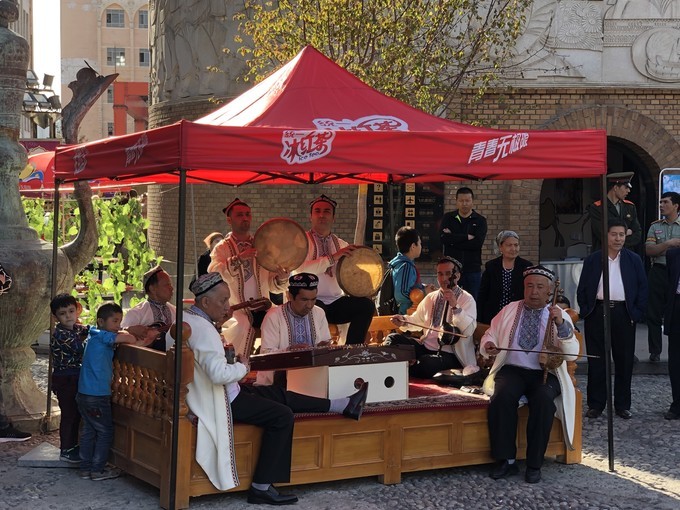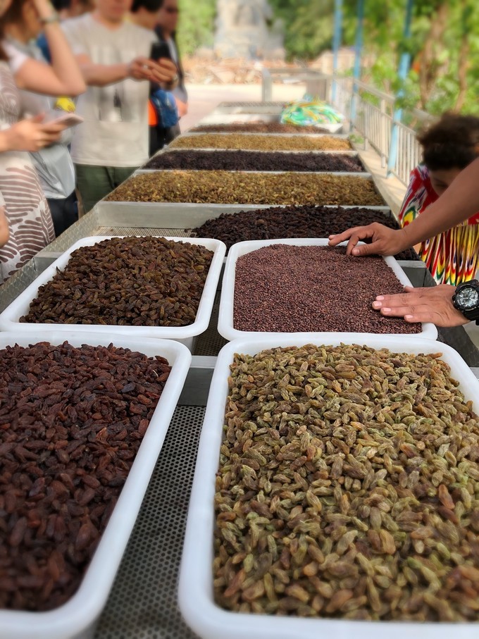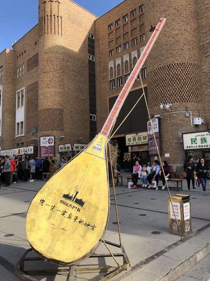 酒足饭饱!!赶去比较有名的市场大巴扎(巴扎就是市场的意思),市场上竖立一块胡琴雕塑,算是地标吧,上面写着“您一声一定要来的地方”。市场里有民族风情表演,就是一群老人围坐在遮阳伞下弹胡琴,还有卖各类纪念品,价格自己参考,我觉得蛮贵的…所以“纯”逛完之后,又去一个专门批发葡萄干等各类干果的市场——中环大市场,价格比大巴扎便宜好多,离大巴扎市场很近步行即可达到。
