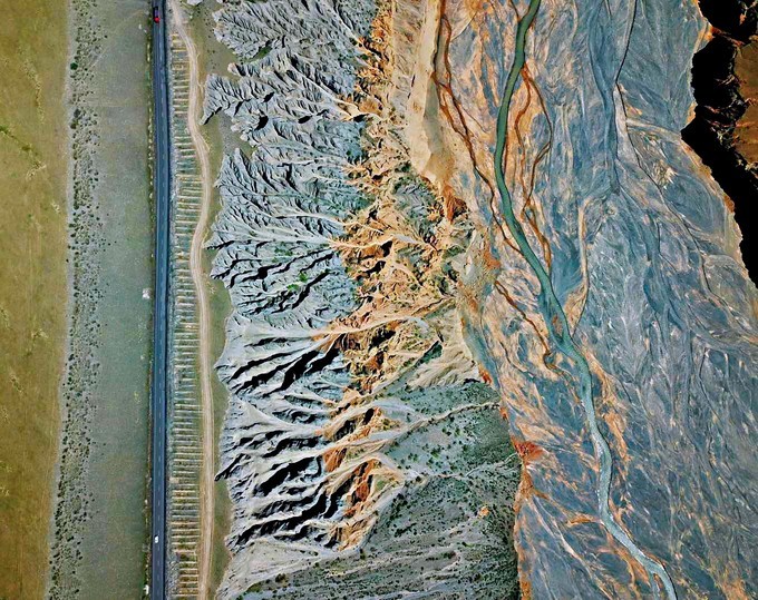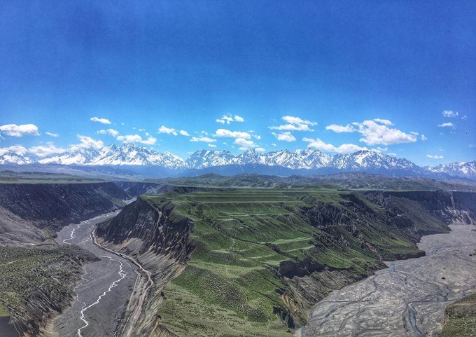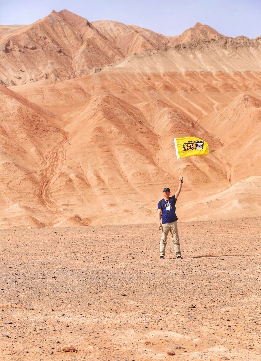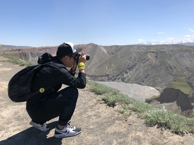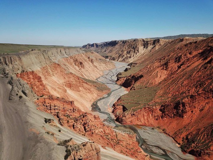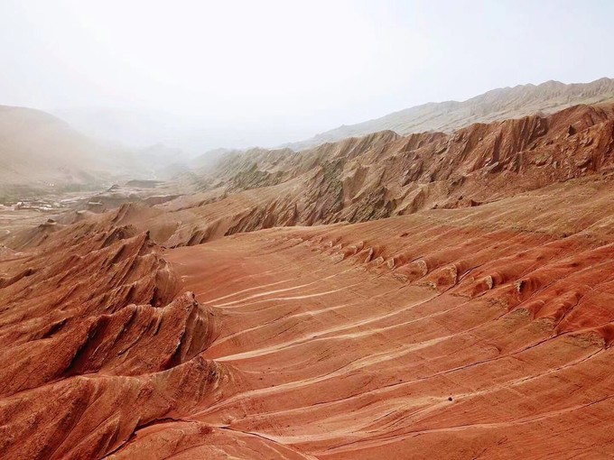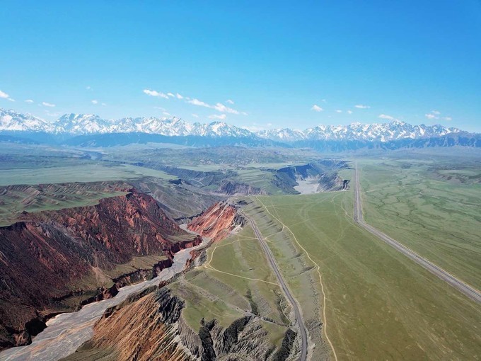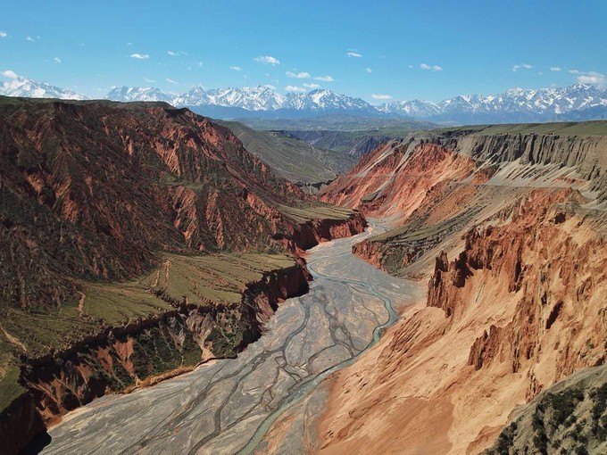 前文提到的地接大哥别克,土生土长的新疆人、会讲五种少数民族的语言。他说我们的运气真心不错,这次来到红山大峡谷算他七年以来第一次遇到雪山大晴天。山路崎岖,千沟万壑、层峦叠嶂,天山雪顶仿佛近在咫尺,触手可及,风声阴壑,在耳边呼呼作响,红色峡谷静静地盘卧着,好似一条正在休憩的巨龙,十分壮观。借用团友的大疆航拍照片更显半雅丹地貌。