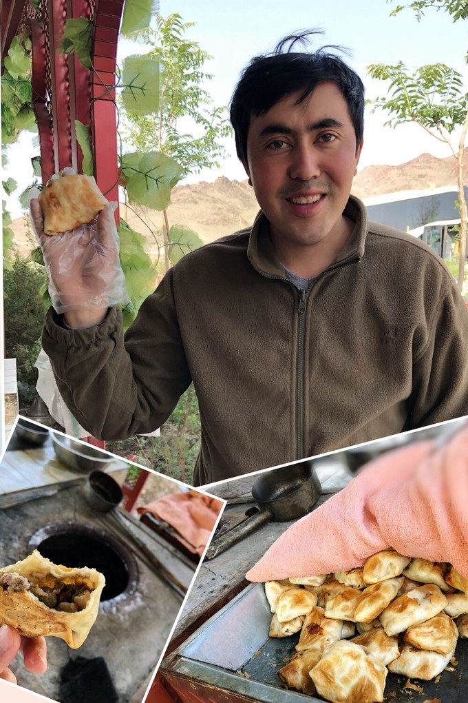 一定要安利一个可以跟红柳烤肉媲美的,号称“新疆的肯德基”:烤包子!走到了巩乃斯河边,很有商业头脑的老板发现了旅人拍照的据点,用旁边山坡的羊肉,羊尾油和沿岸沙枣,沙棘,红柳枝干烤制的包子,添加黑胡椒和洋葱,外酥内香~旺季时每天可以卖出5000多个包子,老板很是富有啊!