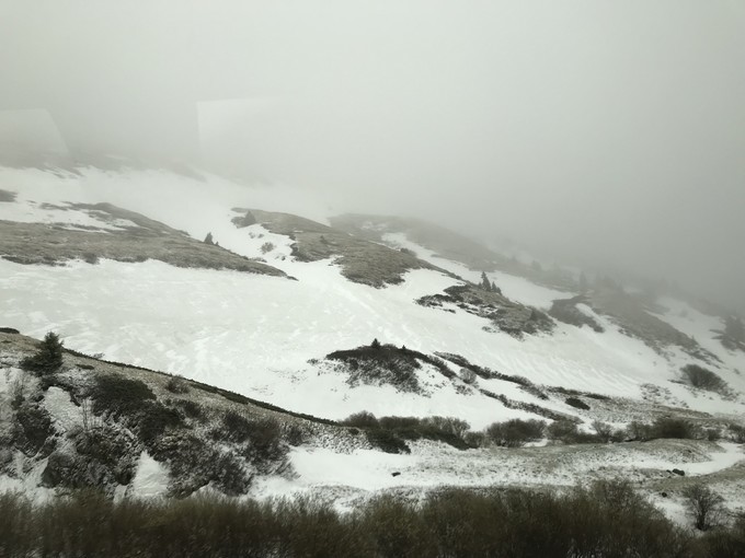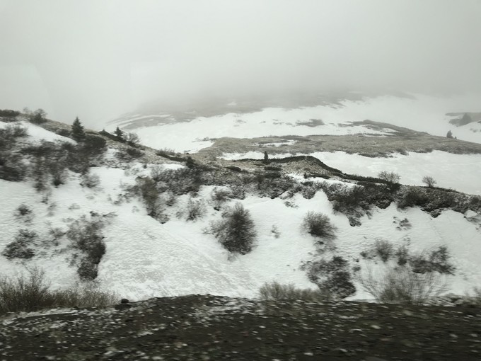 今天应该是旅途中最提心吊胆的一天了:从北疆跨天山去南疆,很可能因为天山上下雪封路而被迫原路返回,导游说上一个团就是在堵了五个小时后原路返回多走了800公里。早上起大早发现在下雨,提心吊胆的出发了!新疆交警九点半上班,赶在他们上班前上了天山,幸运的是只有货车限行,我们赶在了最后一批上了山。