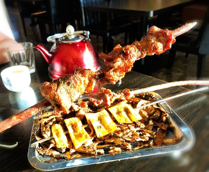 与一般烤肉不同的是,用当地生命力储水能力超棒的红柳枝取代传统的竹签,铁钳!烤肉过程中柳枝汁水会与肉汁交融…味道更香,肉更嫩飞机上为什么要写这段…饿着肚子擦擦口水继续写…