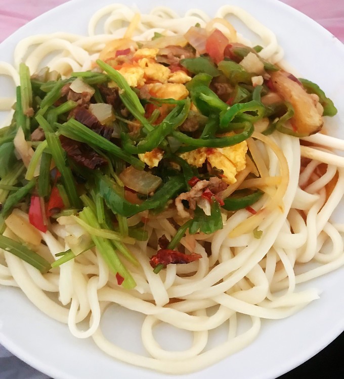 对这个食物真的是又爱又恨~爱因真好吃,恨又因赶路途中真的是总吃这玩意儿!新疆面条,拌当地传统小炒!