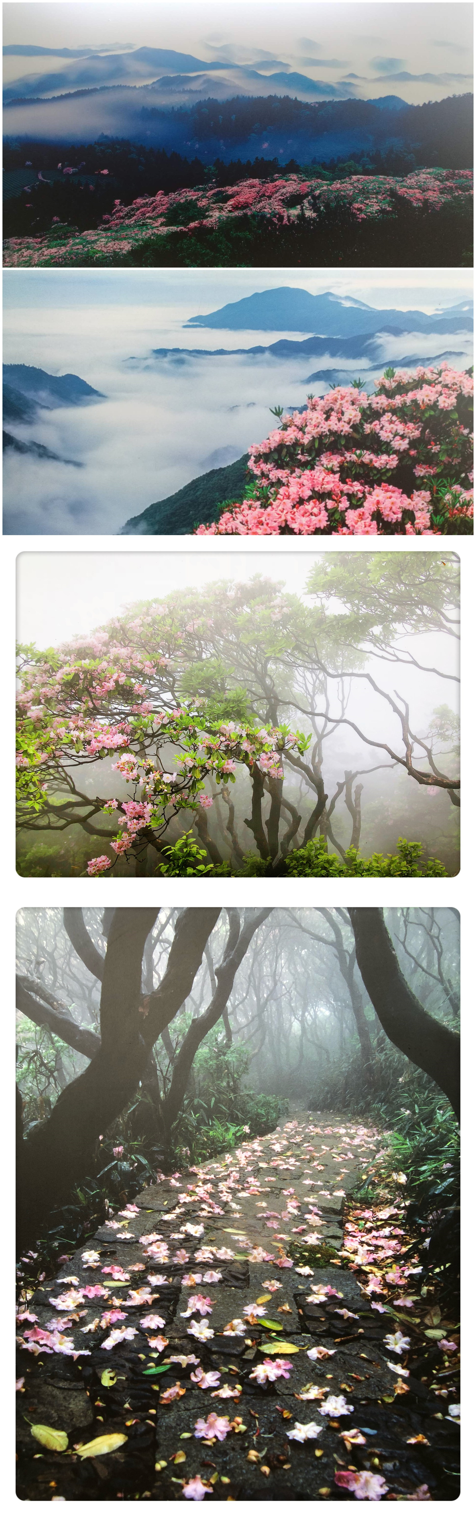 “云锦杜鹃梵语称娑罗,天台山云锦杜鹃,是一种常绿大灌木,高约四、五米,树冠浑圆平整,主干分明,旁枝逸出,叶片革质,形似枇杷叶,正面墨绿油亮,背有黄色茸毛。每年立夏过后,顶生伞状花序,待放的花苞则如荷箭。花朵盛开时,由7—13朵小花团簇一起而组成一朵朵大若碗口、妩媚无比的花团,一树千花,故又称“千花杜鹃”。一般花期在7天左右,花色有大红、粉红、白色和紫色等,间杂一起,形成一片缤纷夺目的“花海”,望之粉若芙蓉,姣若清荷,灿若云霞,闻之沁人心。其间又穿插着黄山松、柳杉、望春花等相伴而生。更显现出万绿丛中点点红的美景。人在花中游,仿佛置身一幅硕大无比、色彩鲜明、格调清新的图画中。”