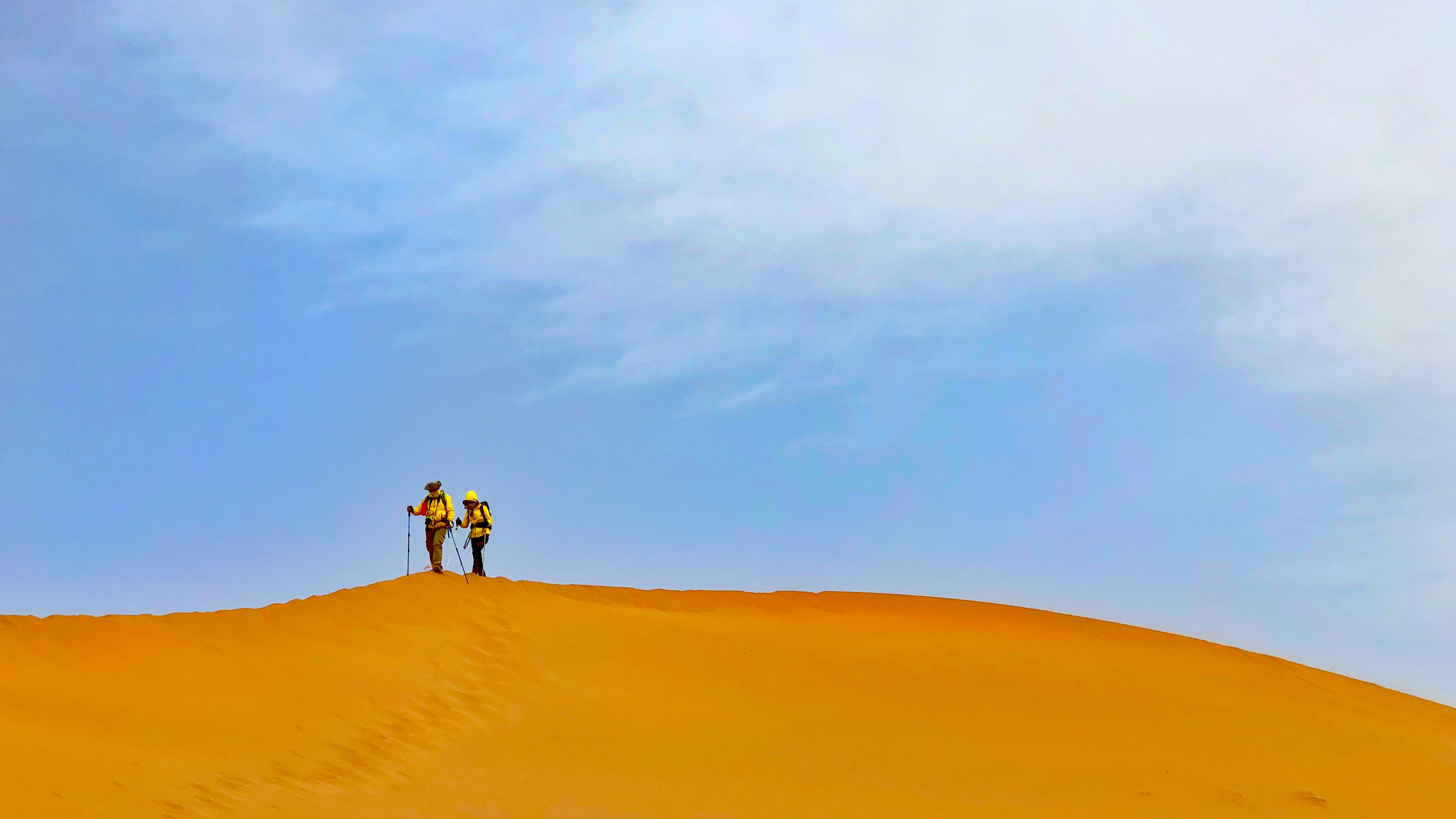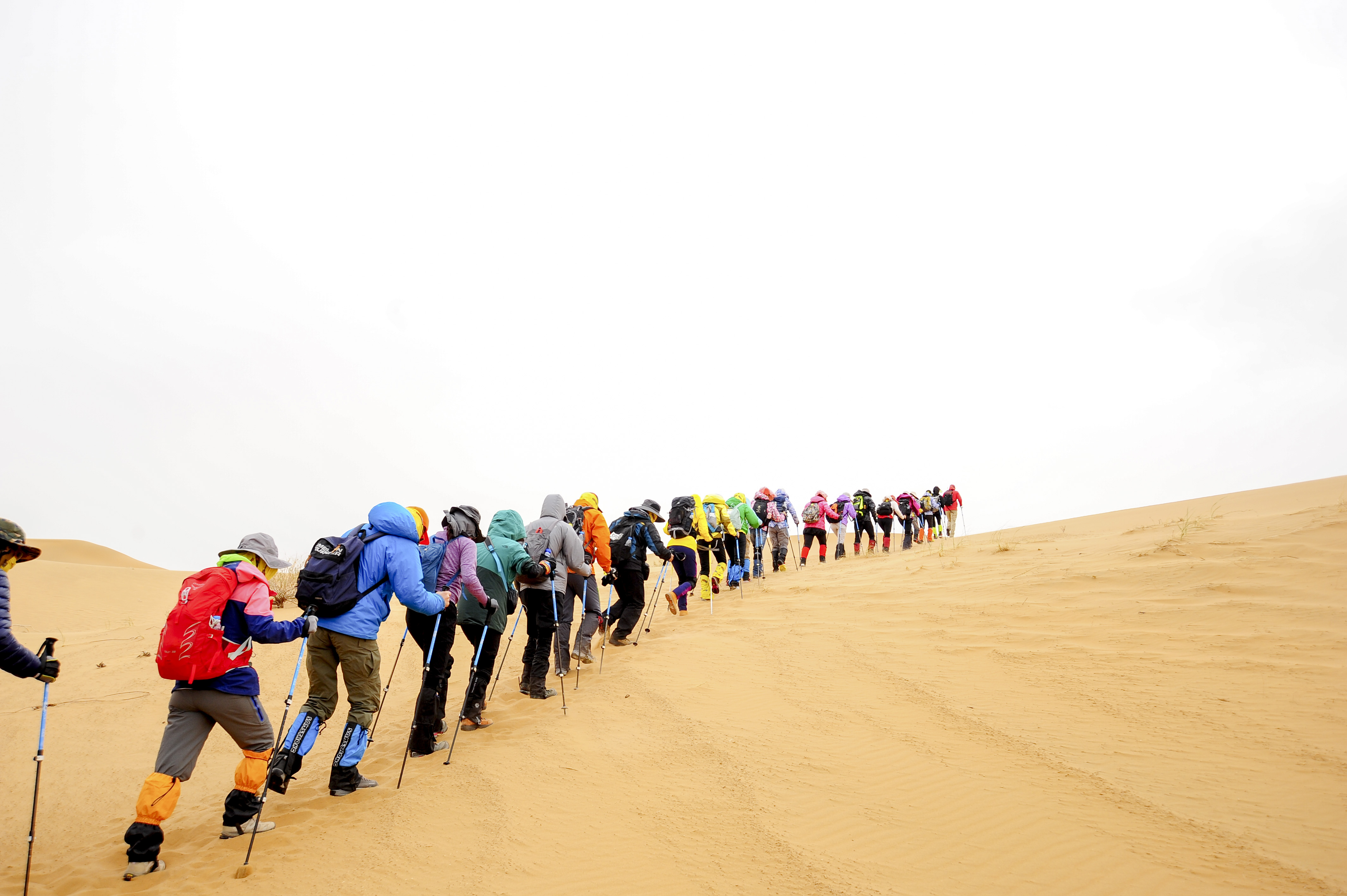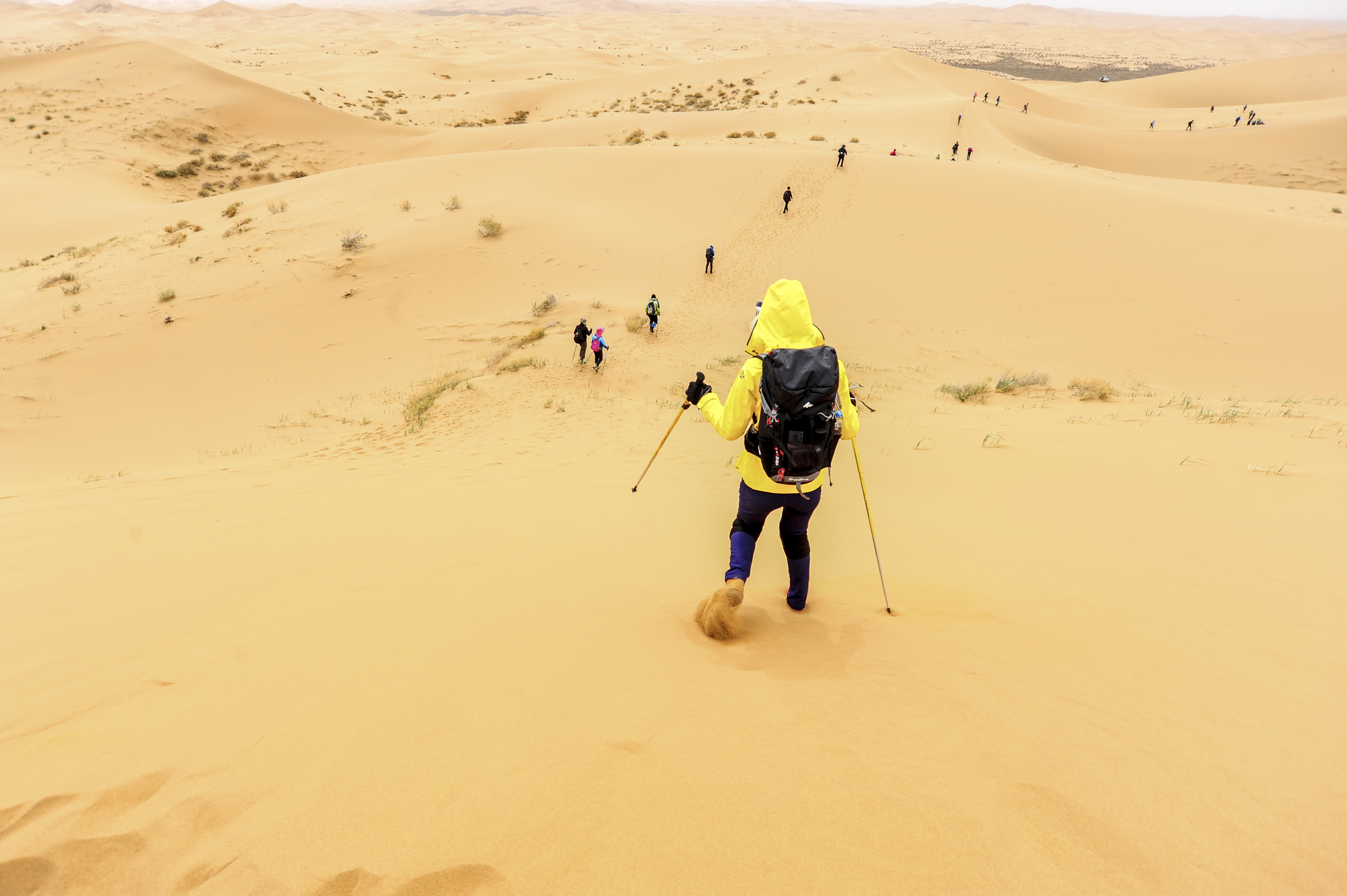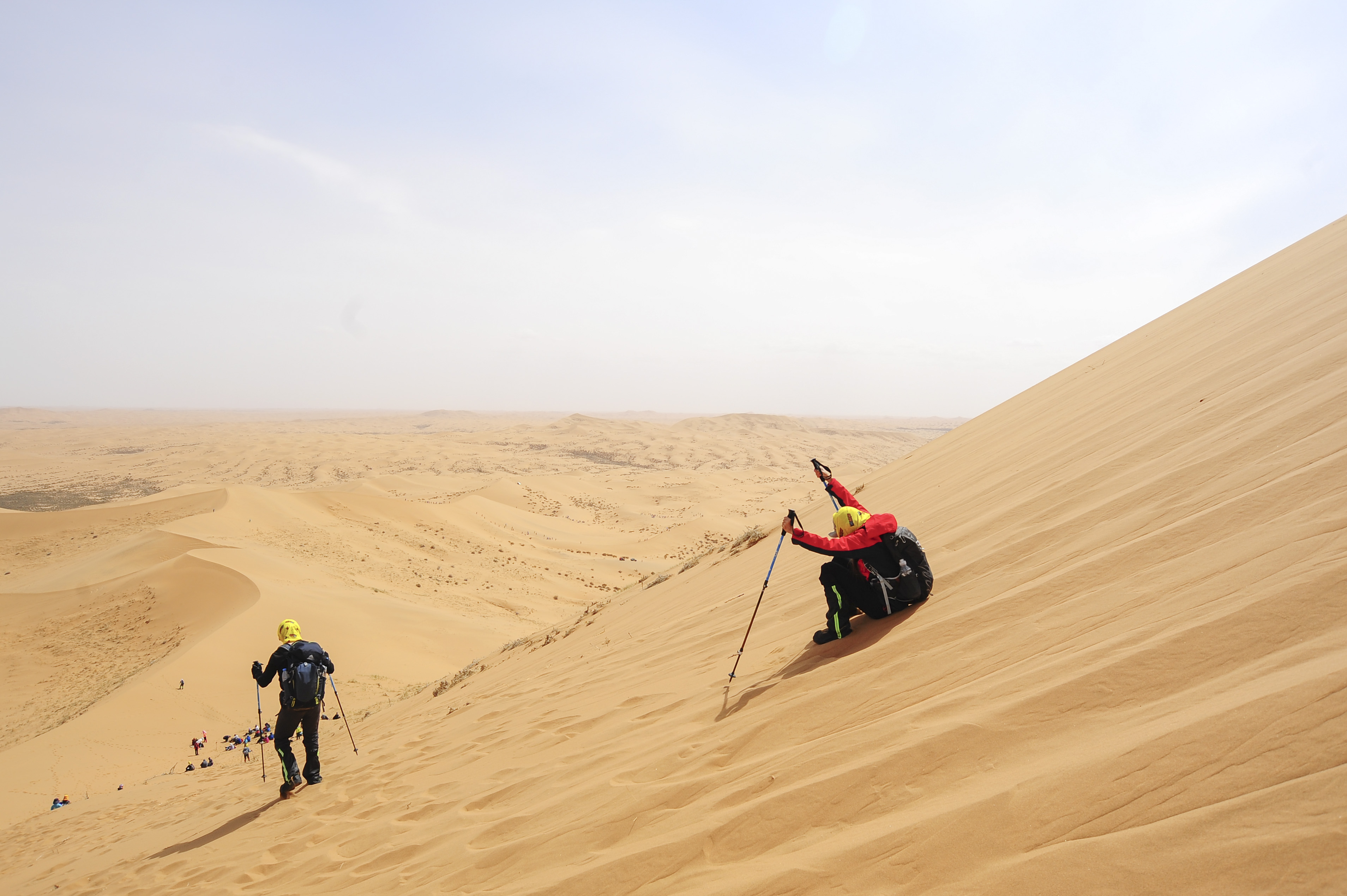 其实沙漠徒步,下坡的时候用不到登山杖,直接往下滑就可以了