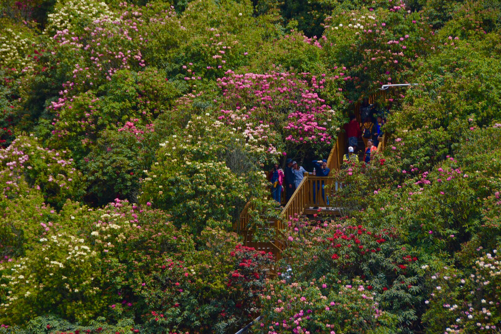 初步查明公园内有马缨杜鹃、露珠杜鹃、团花杜鹃等41个品种,囊括了世界杜鹃花5个亚属的全部。暮春3月下旬至5月各种杜鹃花竞相怒放,漫山遍野,千姿百态,铺山盖岭,五彩缤纷。今年由于极端天气,杜鹃提前凋谢了很多 ,但即使这样场面依旧壮观。