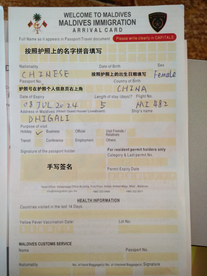 3. 在新加坡候机室等待登机时,检票的地勤会给每人发一张需要填写的入境卡。客服之前发给我模版,我就照着模版把相应的信息填写进去,然后再签名。填写好后,自己收好,等到马累过海关时,交给马累海关即可。
