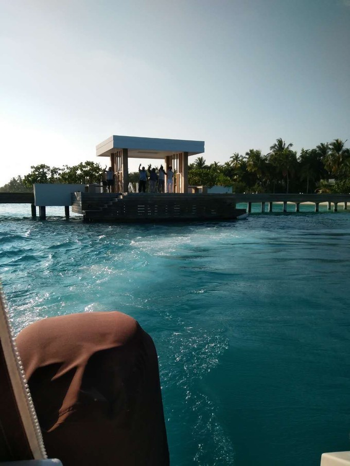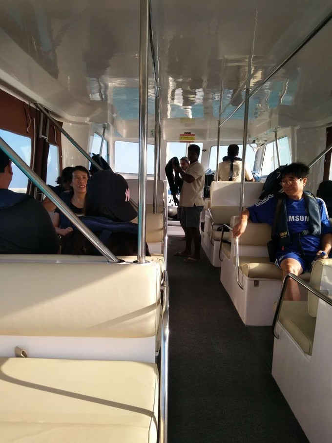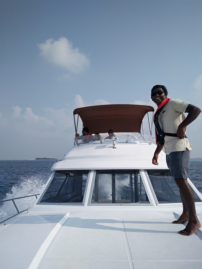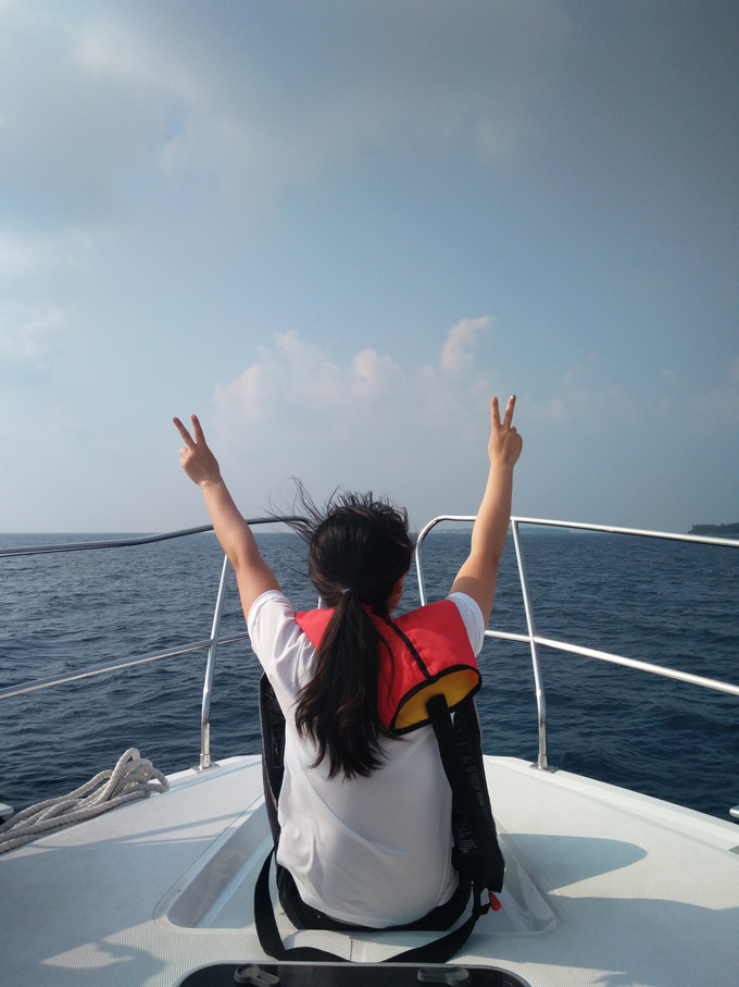 我们的接驳车停在了一搜双层的游艇前。真是幸运,每个酒店都有很多不同型号规格的船,我们正好赶上的是一艘双层游艇,有内室,二层是驾驶室。小黑很热情的问我们要不要去二层,风景更好;要不要去船头,更刺激。我们几个女孩子兴高采烈的爬到二层,然后又爬到船头体验着迎浪冲击的刺激。