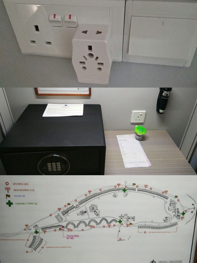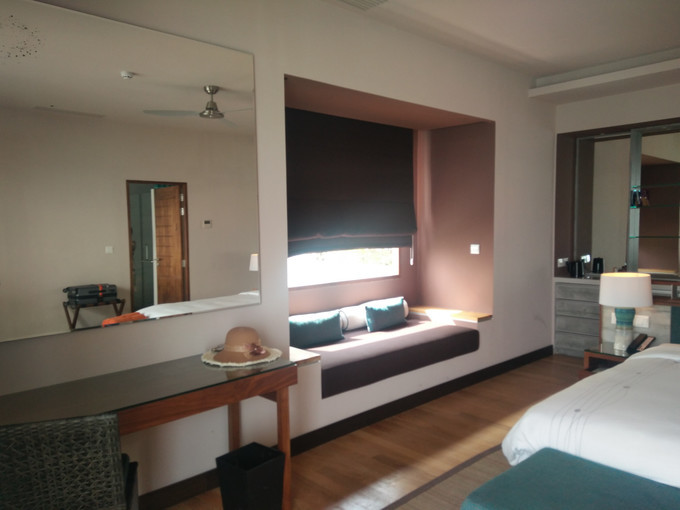 房间里有空调,风扇,电视;衣柜抽屉里有两双人字拖(全新的、可以洗澡用),两双一次性拖鞋,一个吹风机,一个保险柜,一瓶电蚊香液(但还是被蚊子咬了,一定要备花露水和清凉油)、一张此房间所在方位图、一个手电筒(晚上岛上的灯光比不了城市,建议年纪大一些的,可以带上手电筒去吃晚饭或者散步)、多个衣架、两件浴袍(我从来不用);吧台上有一个电热水壶(想喝热水,可以用来烧赠送的纯净水,不建议喝自来水);墙上一个万用转换插头;浴室里两块香皂、一瓶浴液、一瓶洗发露、一瓶护发素。