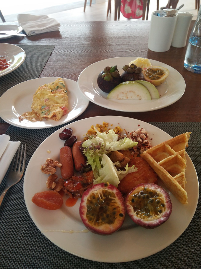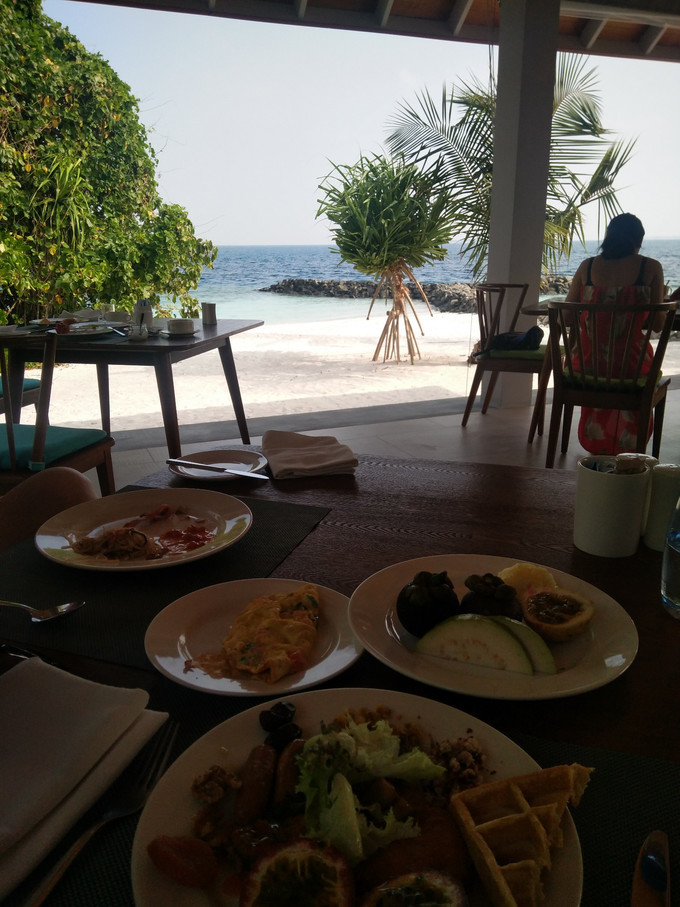 要是能带一些士力架这类热量高的零食最好,以备浮浅等运动会消耗大量体力。其次,要说说主餐厅的自助餐,来之前,都说马代的伙食超难吃,本来做好来此减肥的心理准备了,但我错了,这里的餐食超级好吃,就连我婆婆地地道道的中国胃东北胃,在这里都能吃的超嗨,可想这里饭菜的味道是什么样的了。用餐环境也是那么的亲近自然,吹着海风,听着海浪,望着碧海蓝天(晚上当然没有啦,早餐完全能够领略到),品着鲜榨果汁,吃着各式餐食、糕点、水果,真是享受呀。