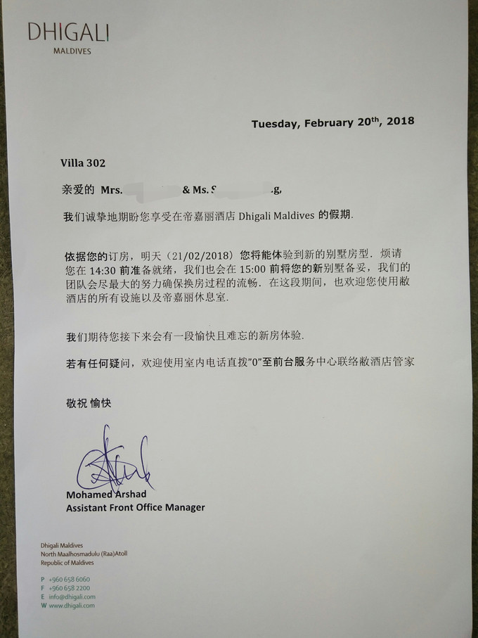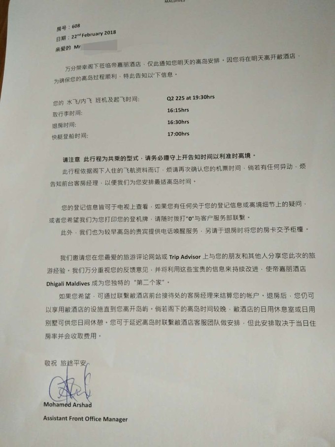 早上醒来,发现地上又来一张纸,原来是离岛通知。在怡橙假期上预订,酒店提前就掌握了我们的往返时间和乘坐的航班信息,所以大部分客人的离岛安排也是根据行程来安排。值得一说的是,来时到马累机场坐内飞坐船,回时去马累机场坐船做内飞,每一步都有酒店专门的人接送和引导。