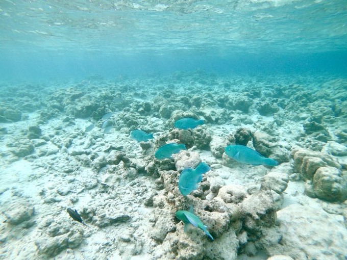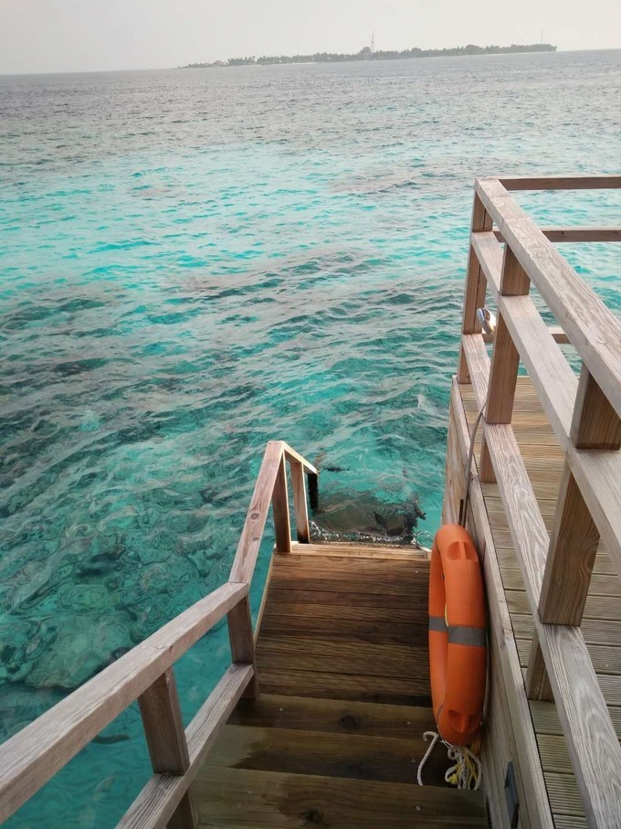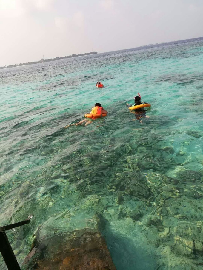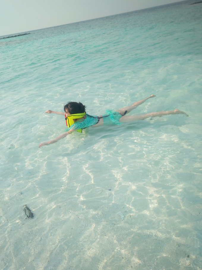 我们两个旱鸭子,虽然很向往浮潜,但考虑到安全,已经打算放弃了。一大早,邻居有个姐姐,套着游泳圈,戴着浮潜眼镜,一个人在我们屋前那片浅滩浮潜,她告诉我们她也一点不会游泳,但穿着救生衣或者套游泳圈,就能自己浮潜的,即使浅滩也是探不到底的深度,也是没有问题,只是别游到深海就可以。并且热情的说要带我们一起游一游,真是遇见贵人了。多说一句,来马代碰到不少中国人,大家还是都非常照顾彼此,都很热情,感受到了同胞的力量。然后,我来兴奋的换上泳装,开启了人生的第一次浮潜。我一定要说,来此不浮潜,一定是最大最大的遗憾。海底世界,真的美不胜收,各种颜色各种形状各种大小的鱼儿、珊瑚、海星、还有各种叫不上名字的海底小生物,甚至还能看到鳐鱼、大章鱼、小鲨鱼,让你不禁感叹这个世界的奇妙,造物主的伟大!身临其境的观看,绝对要比在电视上看到的海底更震撼、更美妙。
