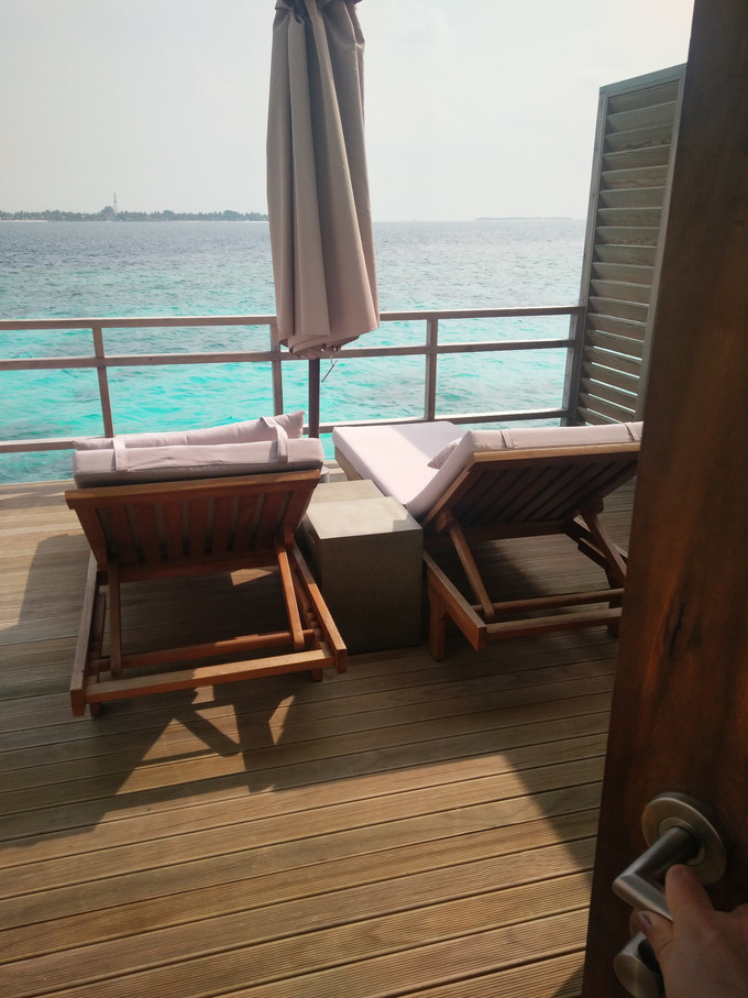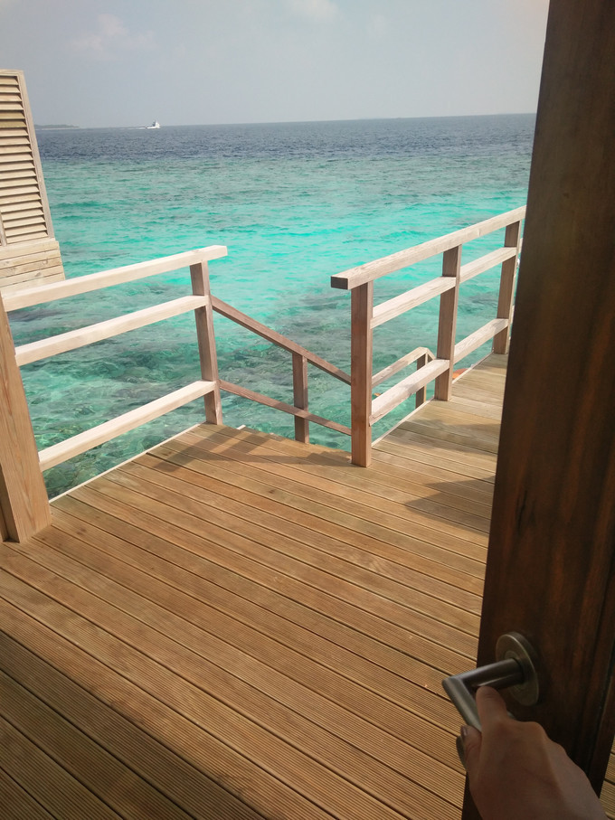 3. 下午快3点多,小黑开着电动接驳车来帮我们搬行李,并把我们带到水屋。水屋比沙屋要更高级一些,特色是房间建在海上,推开卧室门,有楼梯可以直接入海。