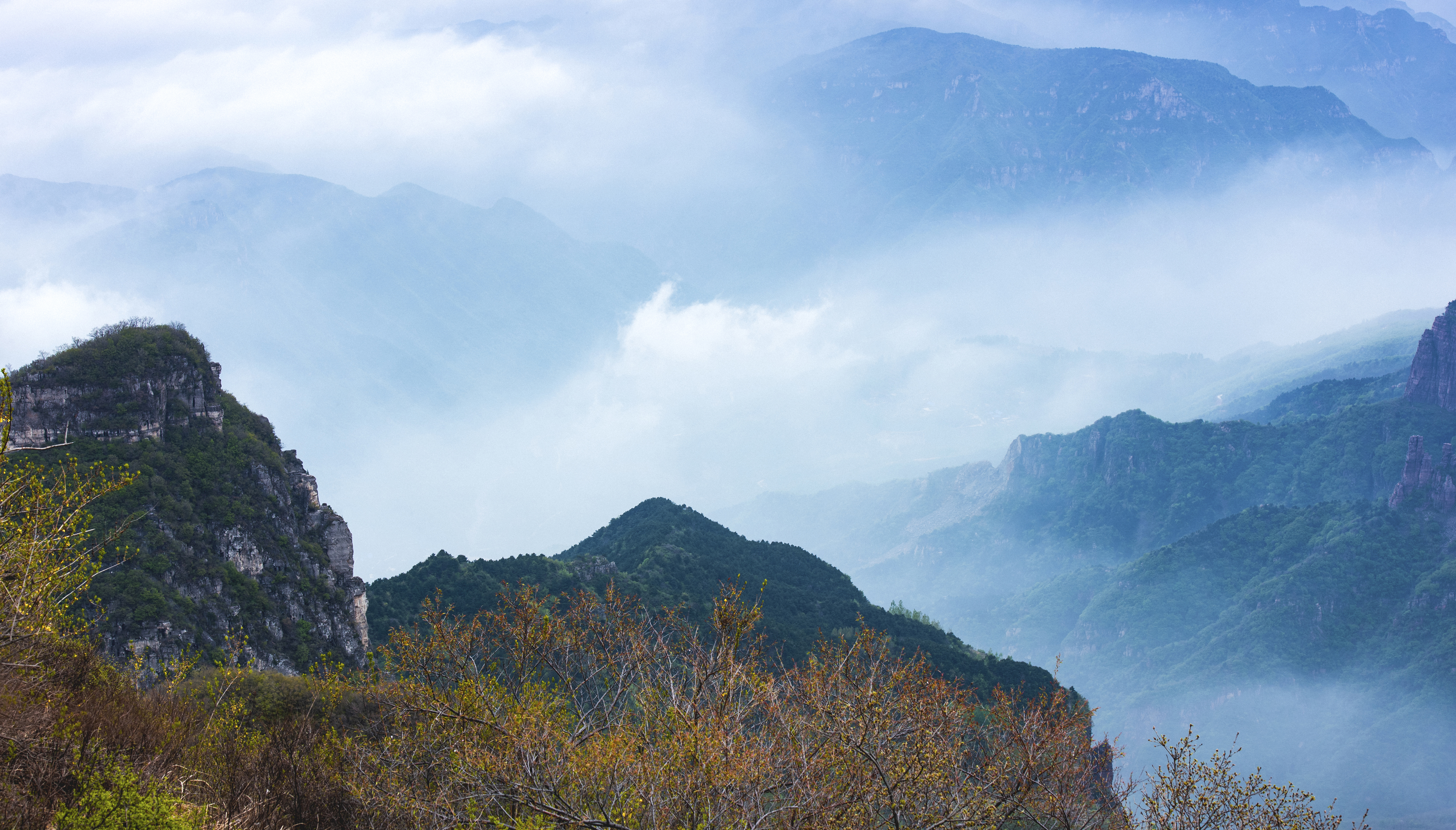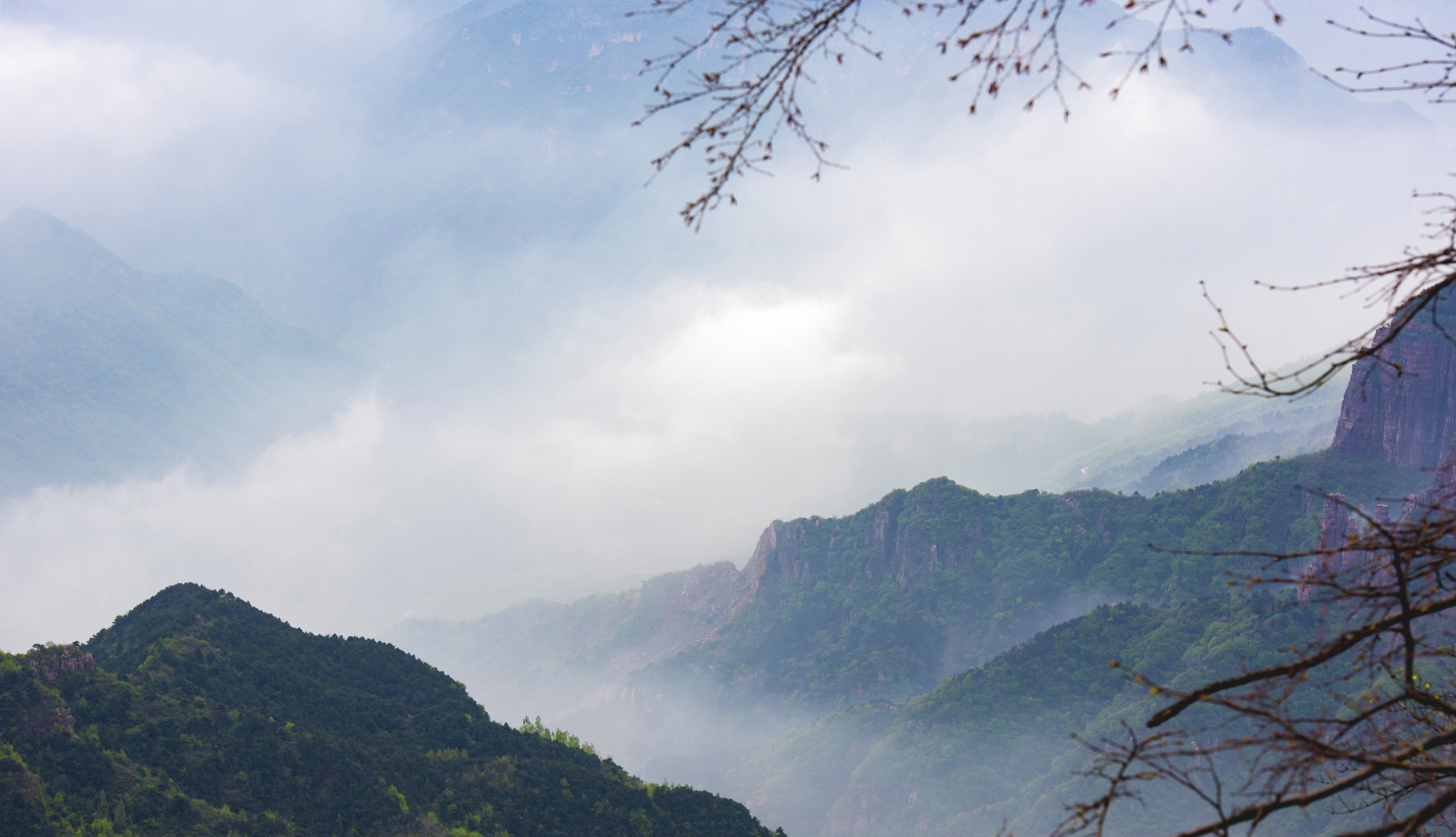 披上绿色春装的南太行,显得格外的灵秀。虽然天公不作美,但雨后太行,薄薄的云雾笼罩着山峰,云雾缭绕宛若仙景。