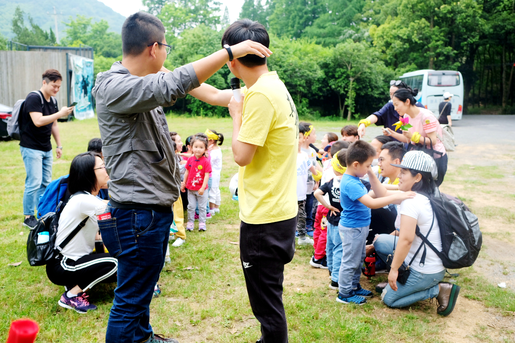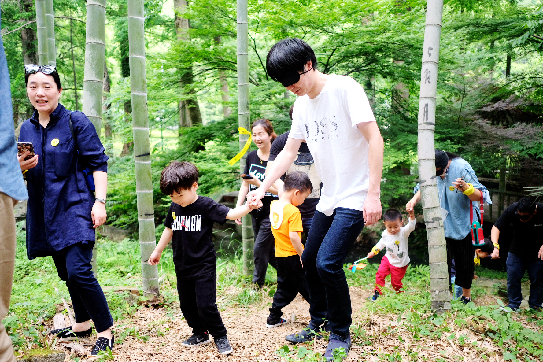 中间交换角色的时候,孩子们还未拆开眼罩