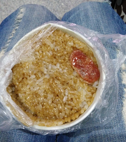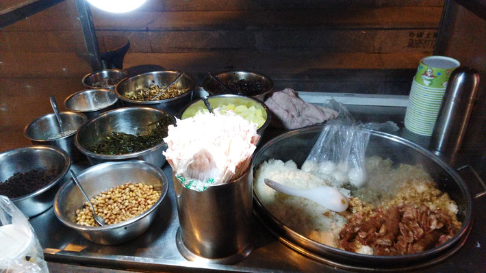 5块钱一份的糯米饭和里丝毫不含糊:海带、土豆、黑洋酥、香肠、花生、黄豆、鱼腥草,各种香料:红糖,辣子等等。而豆浆的味道却与平日习惯的不同,有股油腻味,有点咸。