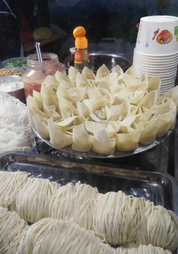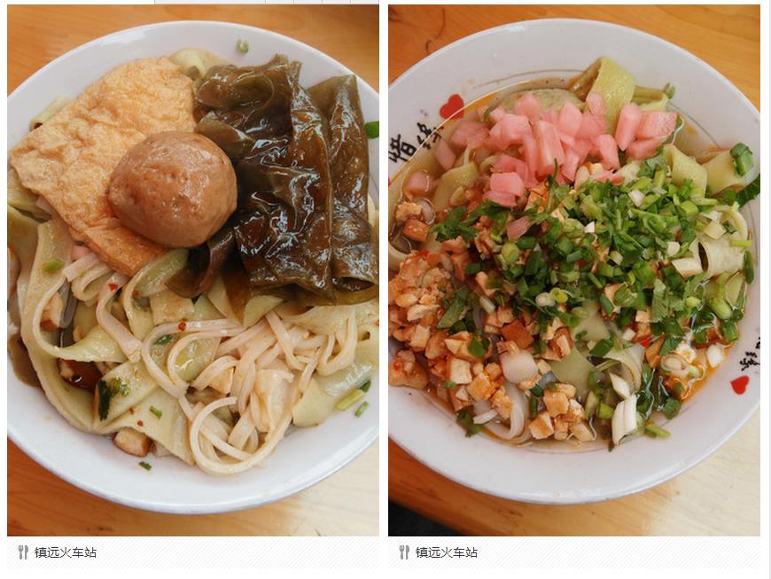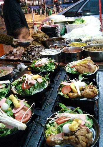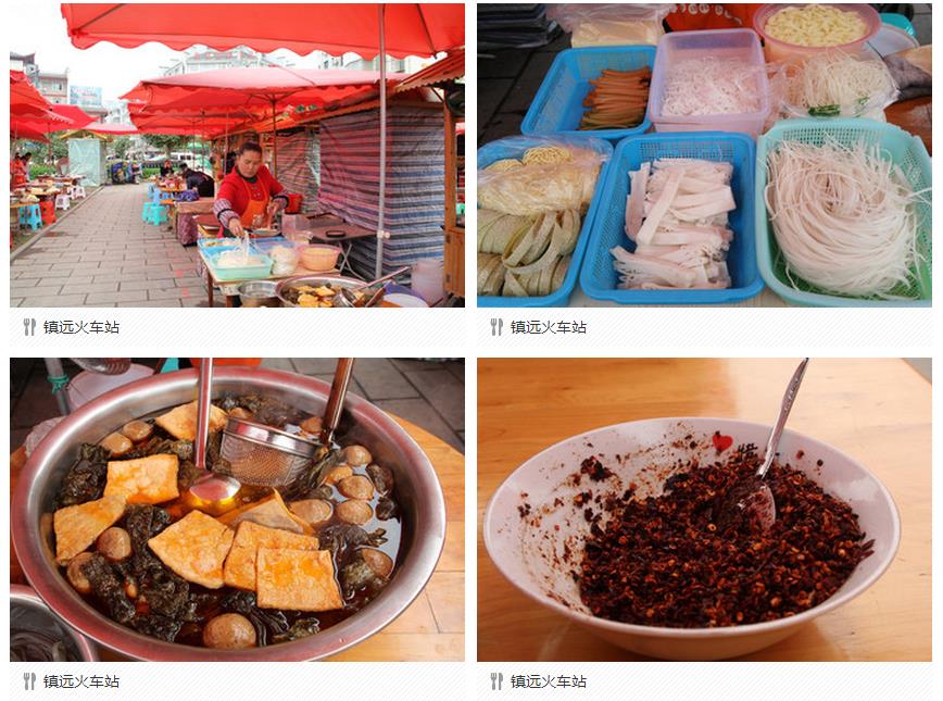 在房间里整顿完毕后,准备出发觅食了。火车站前有一块区域,小摊整齐划一的排成两排,统一的橱柜,统一的蓬顶。没有过多的选择,基本上都是吃粉。转了一圈后,选定一家桌子比较大且干净的坐了下来。面对种类繁多的粉,我最终的决定是每样都来一点,也够贪心的了。总结下来,宽的那种比细的要软。价格也不贵,一碗就7块钱,你要想再加块豆腐干,牛肉丸什么的另算,2元一份。