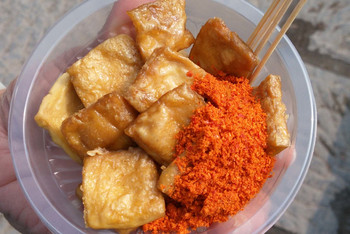 老爸去青龙洞了,我和老妈两个人在岸边找各种角度拍照,尝试了自称是镇远最有特色的豆干,然而感觉并无有太特别,反倒是看着小贩用筷子将切的很薄的豆腐一片一片地夹到烤架上倒是挺有意思的。