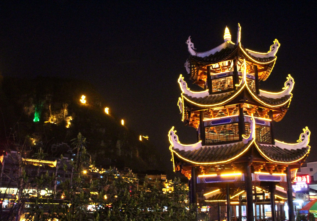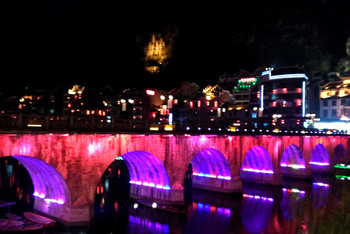 出饭馆后已是亮灯时分,绚丽的灯光将古镇点缀的分外妖娆。