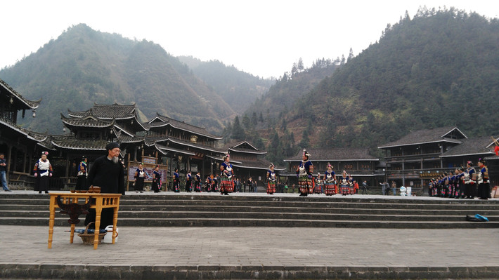 景区前的广场很大,两排穿苗服的当地妇人迈着简单的踱步(或暂且叫”舞步“吧)迎接游客,中间区域的是穿盛装的。正前方是貌似寨子里德高望重的长者招呼游客喝迎宾酒(也就是米酒)。
