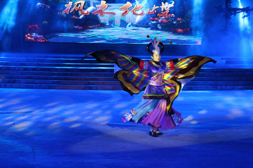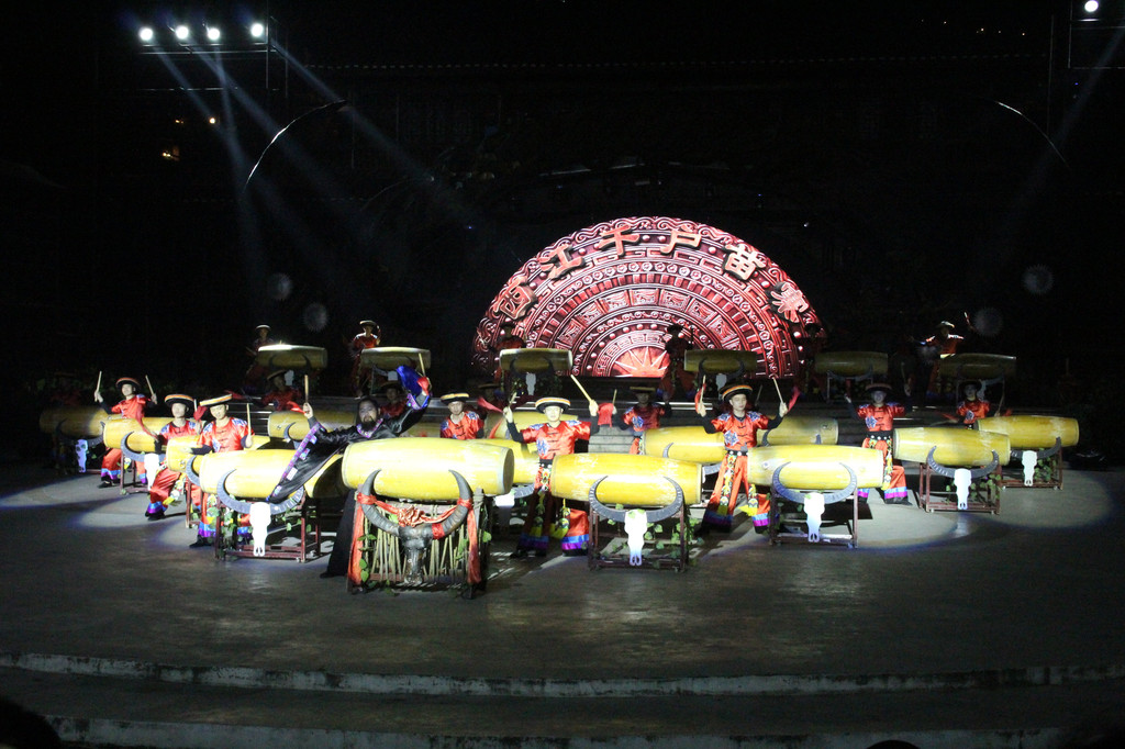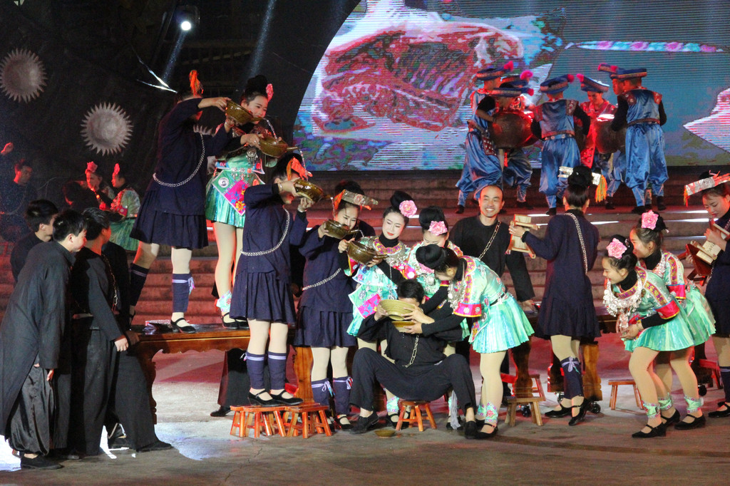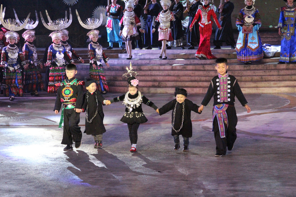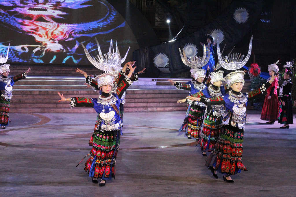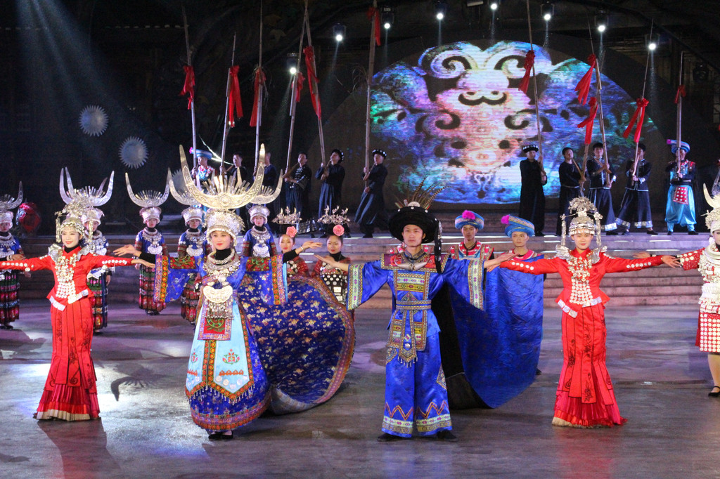 演出不仅仅只是歌舞,还融合了苗族的发展历史,风俗传统,最后还有服装展示。出场的服饰越发隆重,观众赞叹不已,而当苗王庙后的服饰出场后,人们再次惊叹。此时演出已近尾声,演员在蒙蒙细雨中丝毫不减热情,逐一向观众谢幕,观众们虽早已穿上雨衣却也一直在凉意中坚持着。