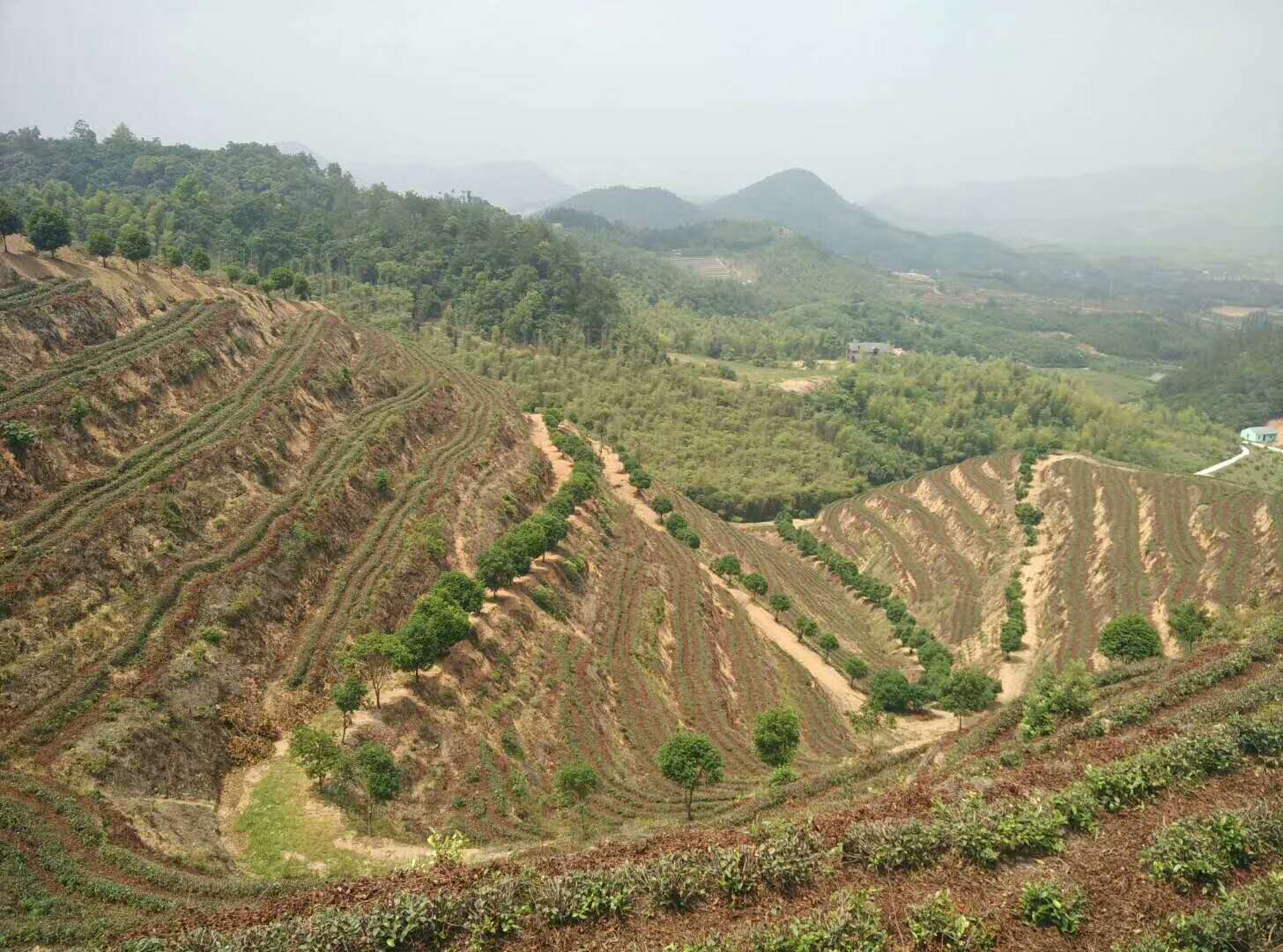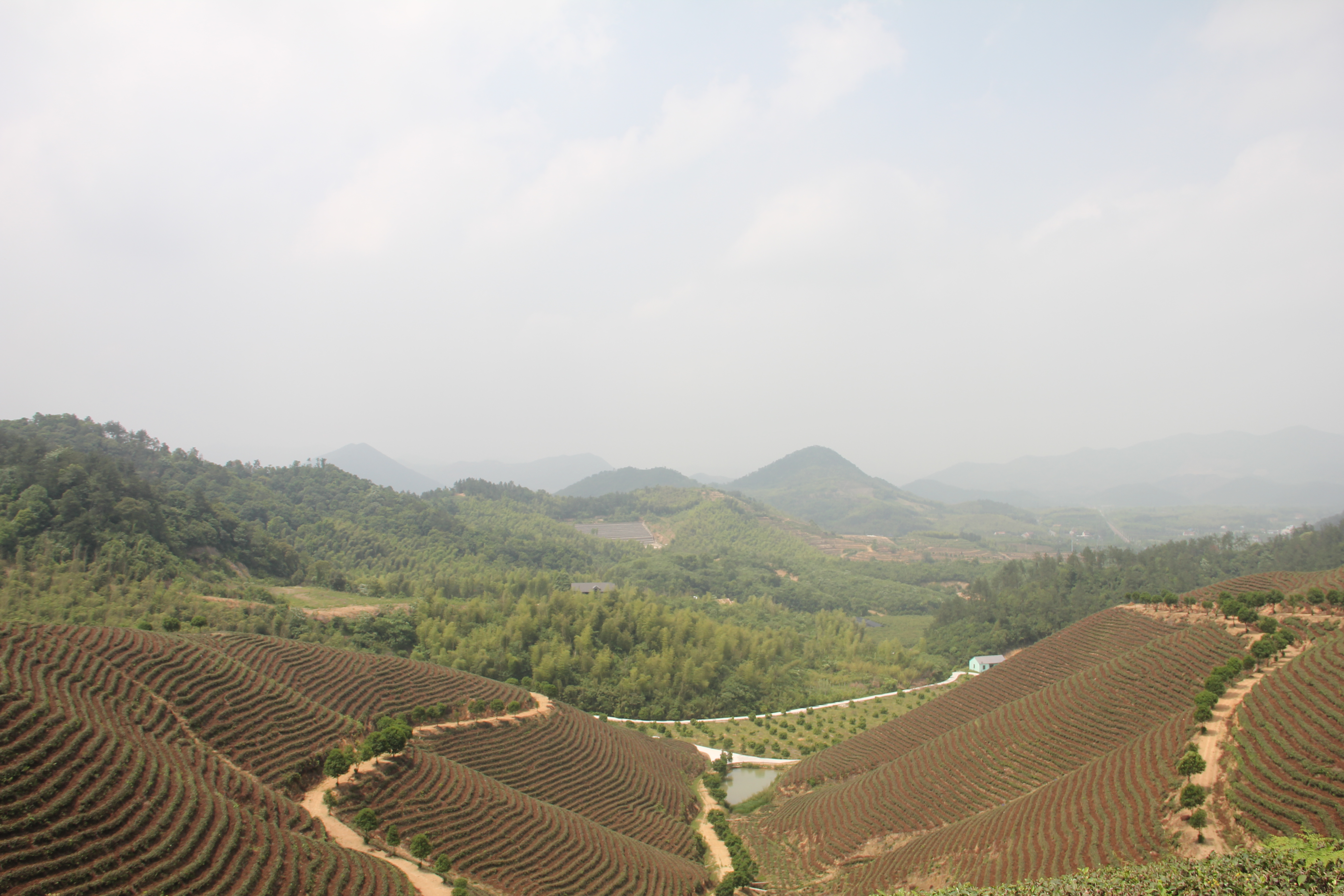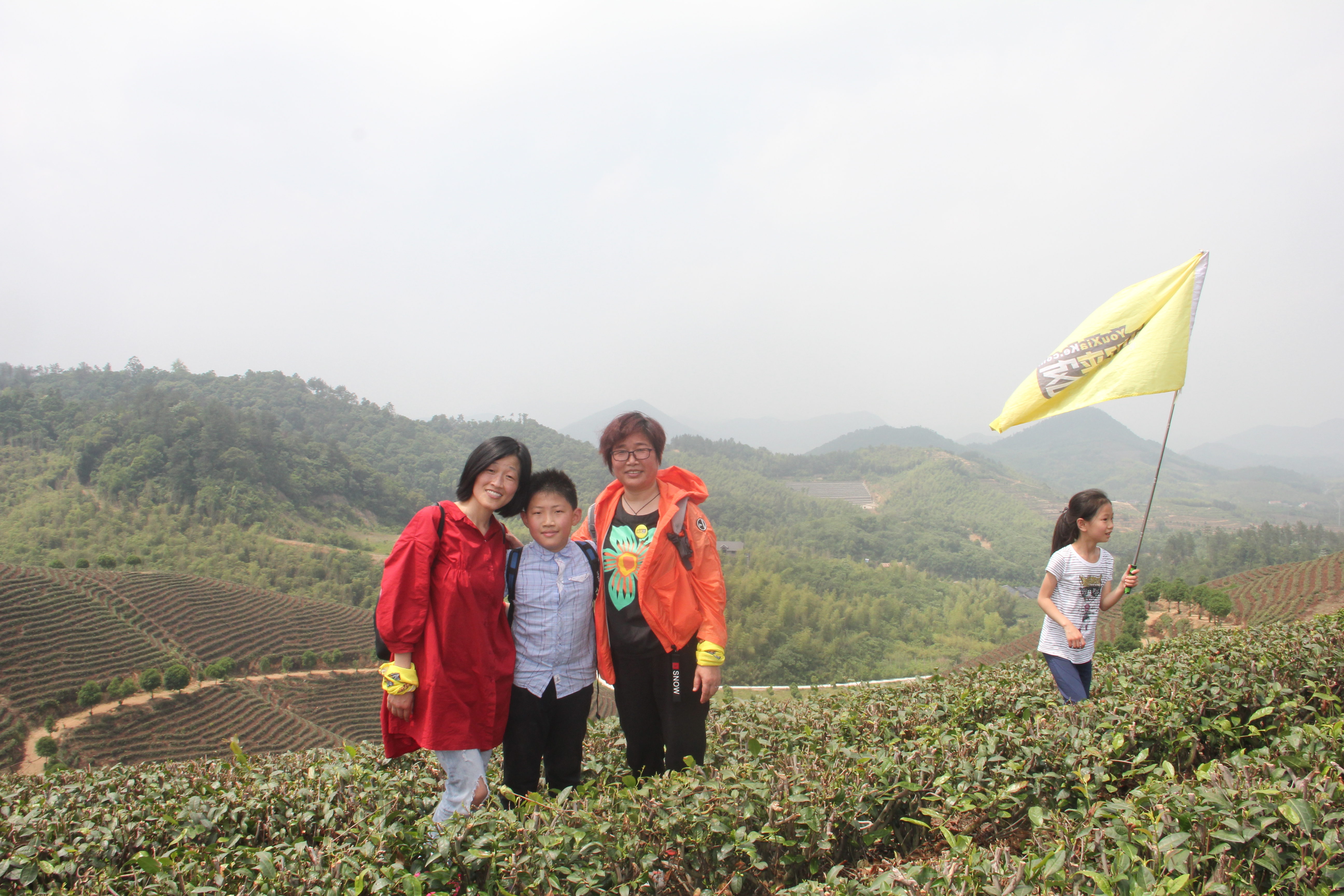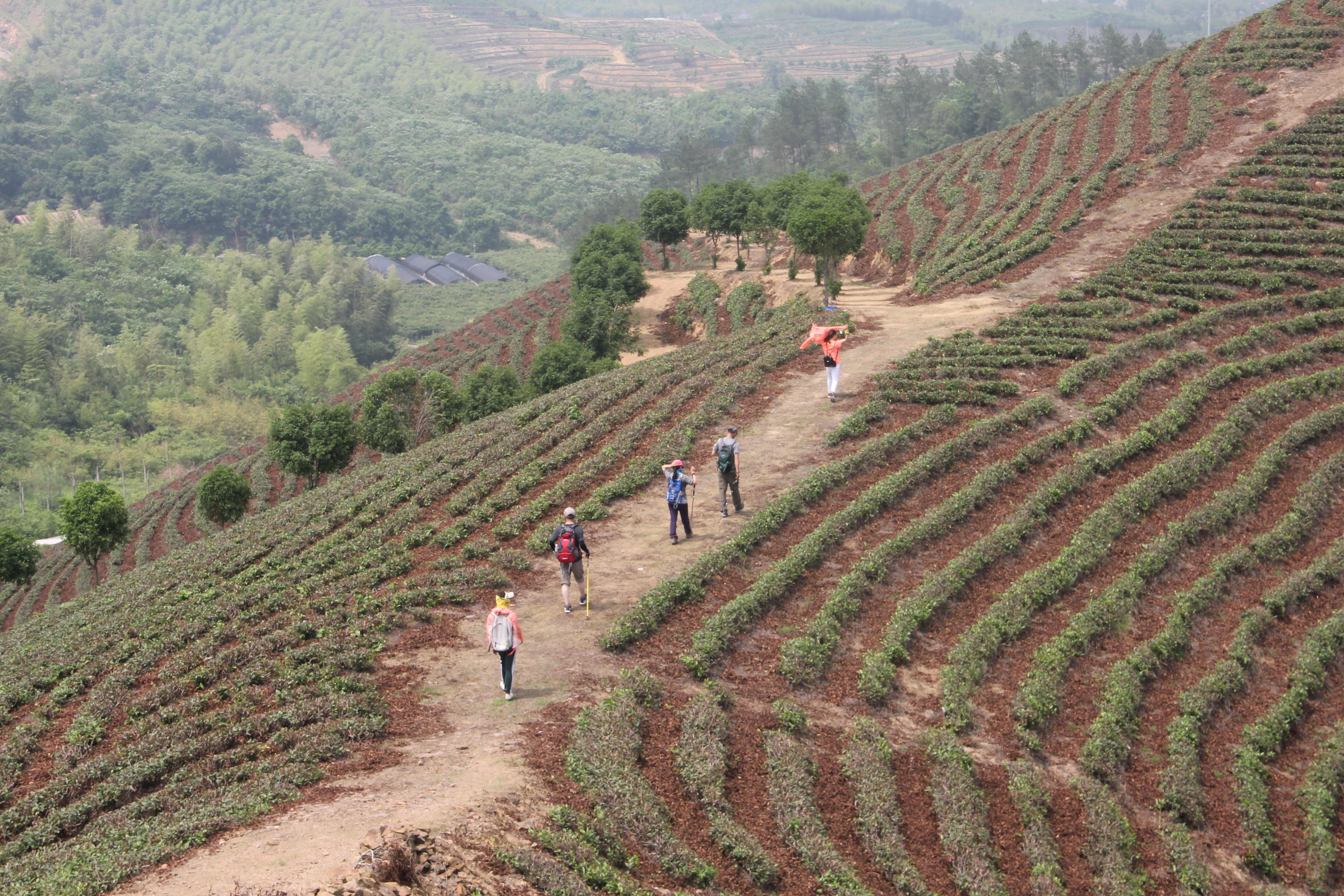 在炎炎烈日下, 当大家走的精疲力尽时, 忽然闯入眼帘的 大片茶田与远处连绵不绝的山头 ,又给大伙无形的加了把油, !