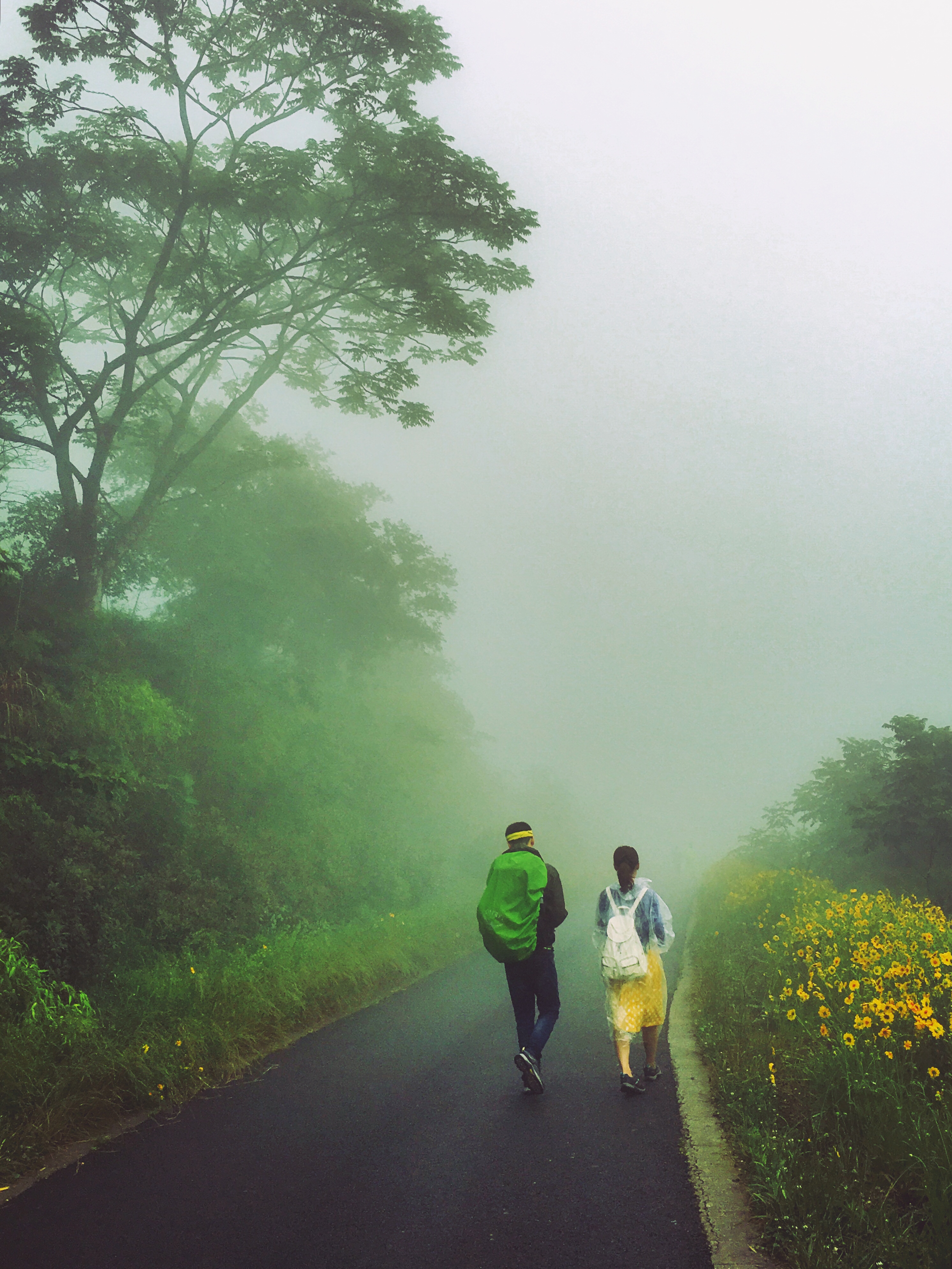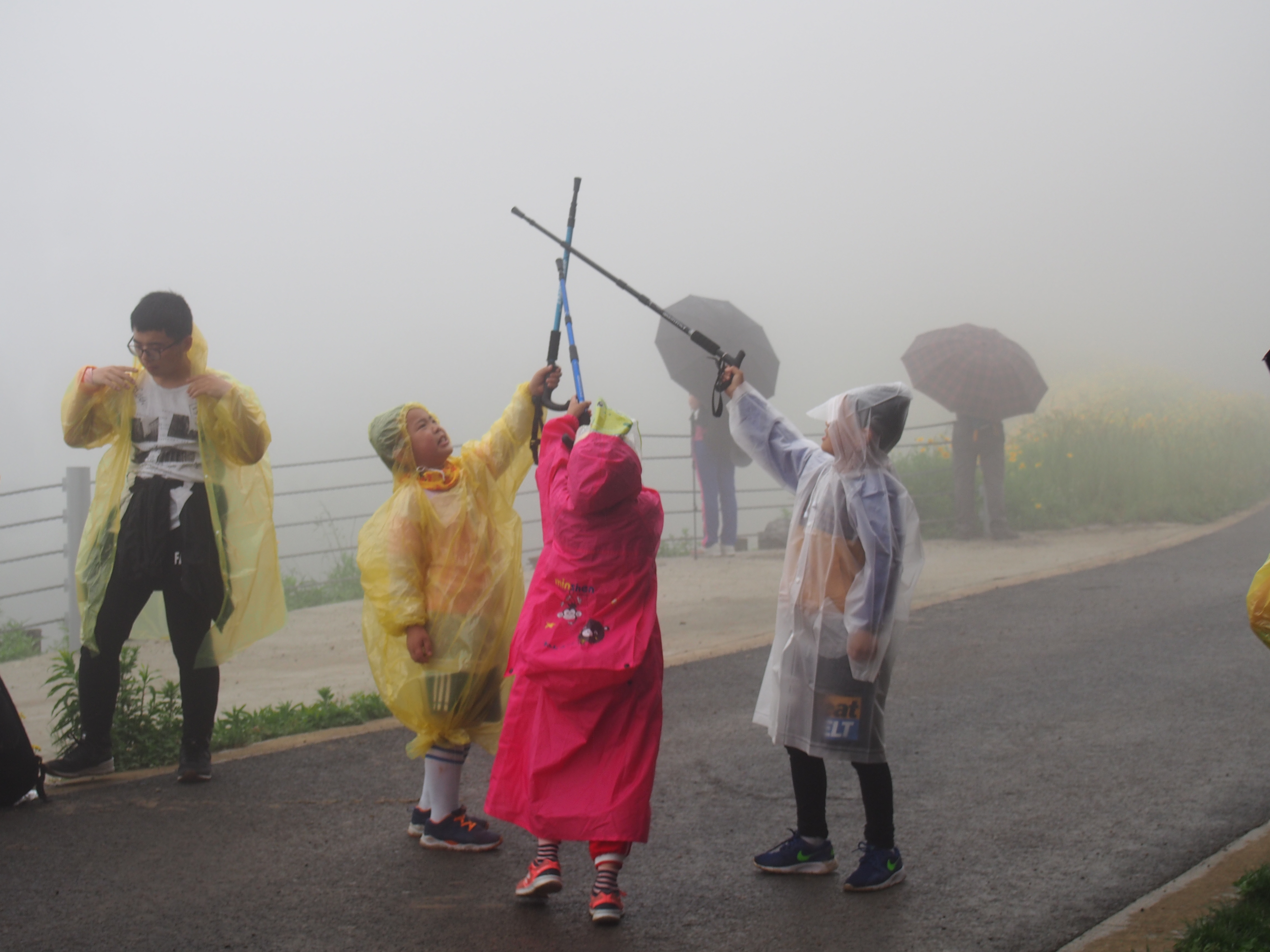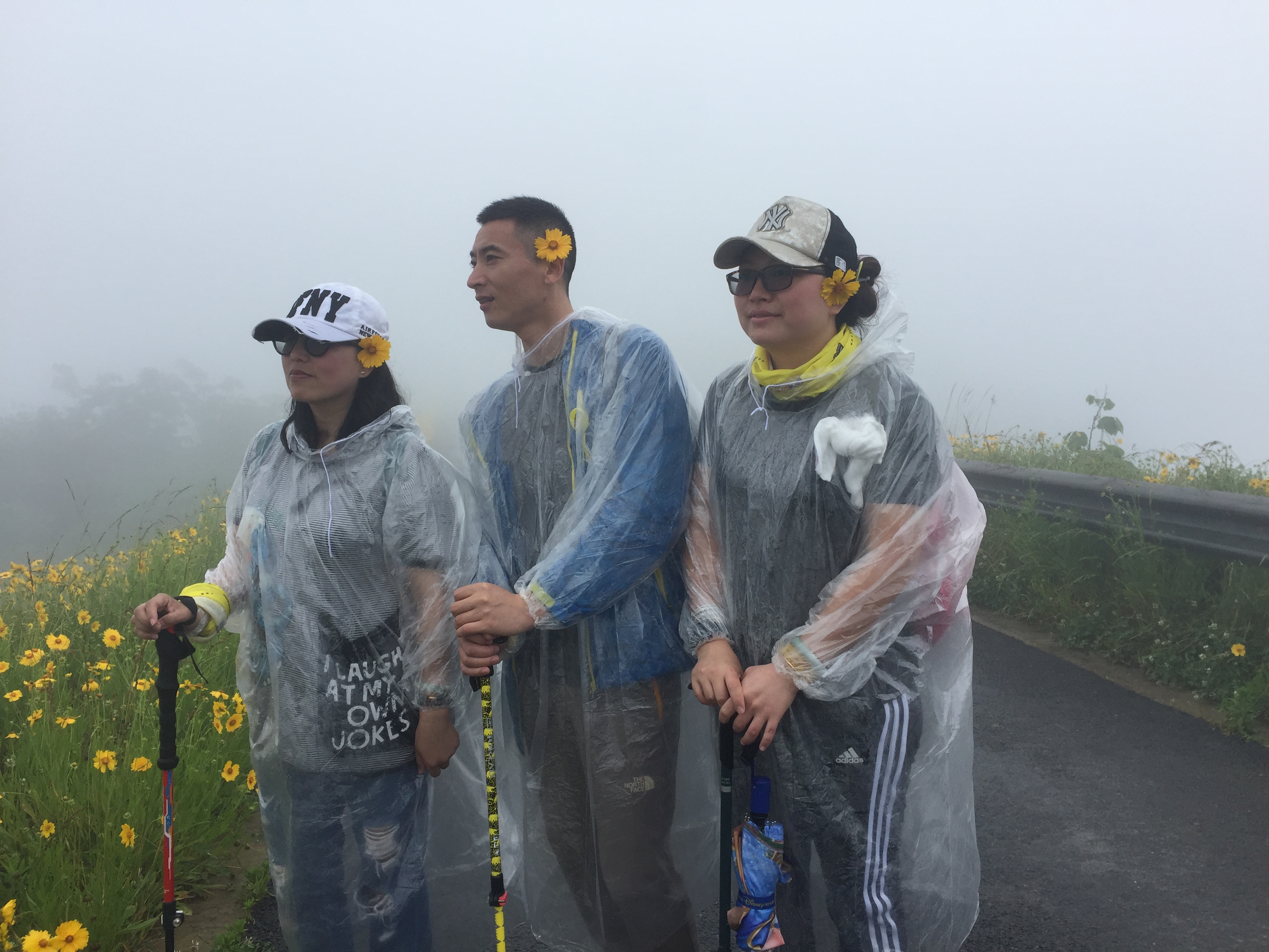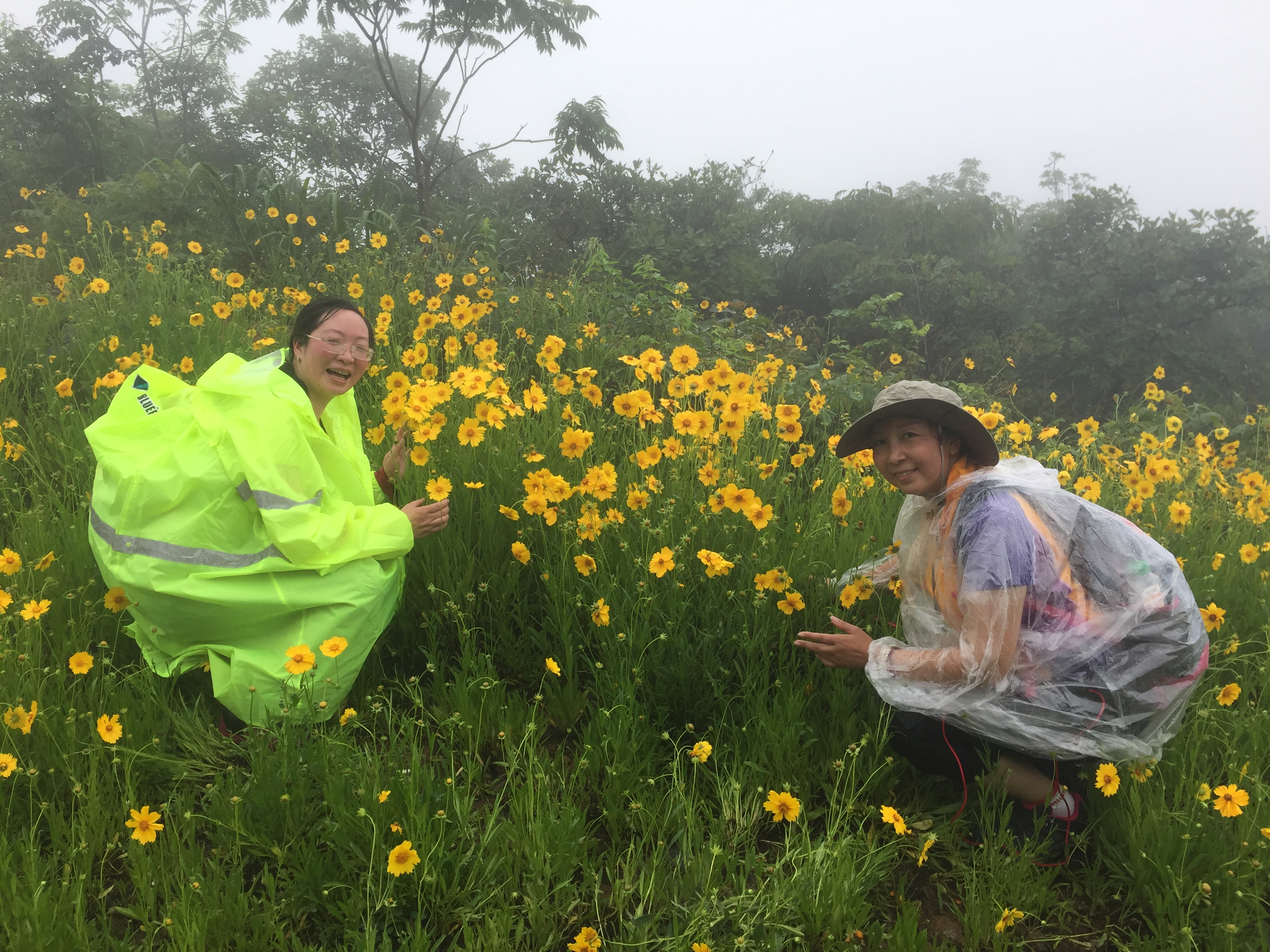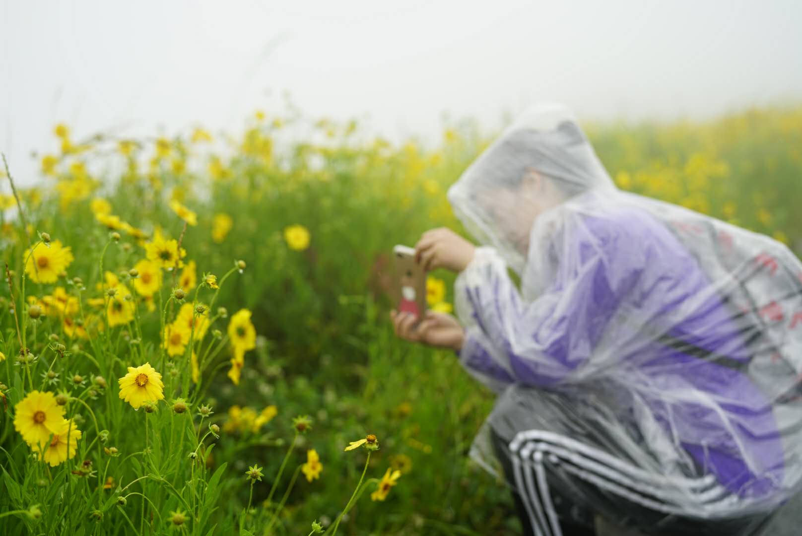 雨衣穿起来,照片拍起来喽!下雨也阻挡不了大家拍照的热情,满眼的波斯菊太美了!