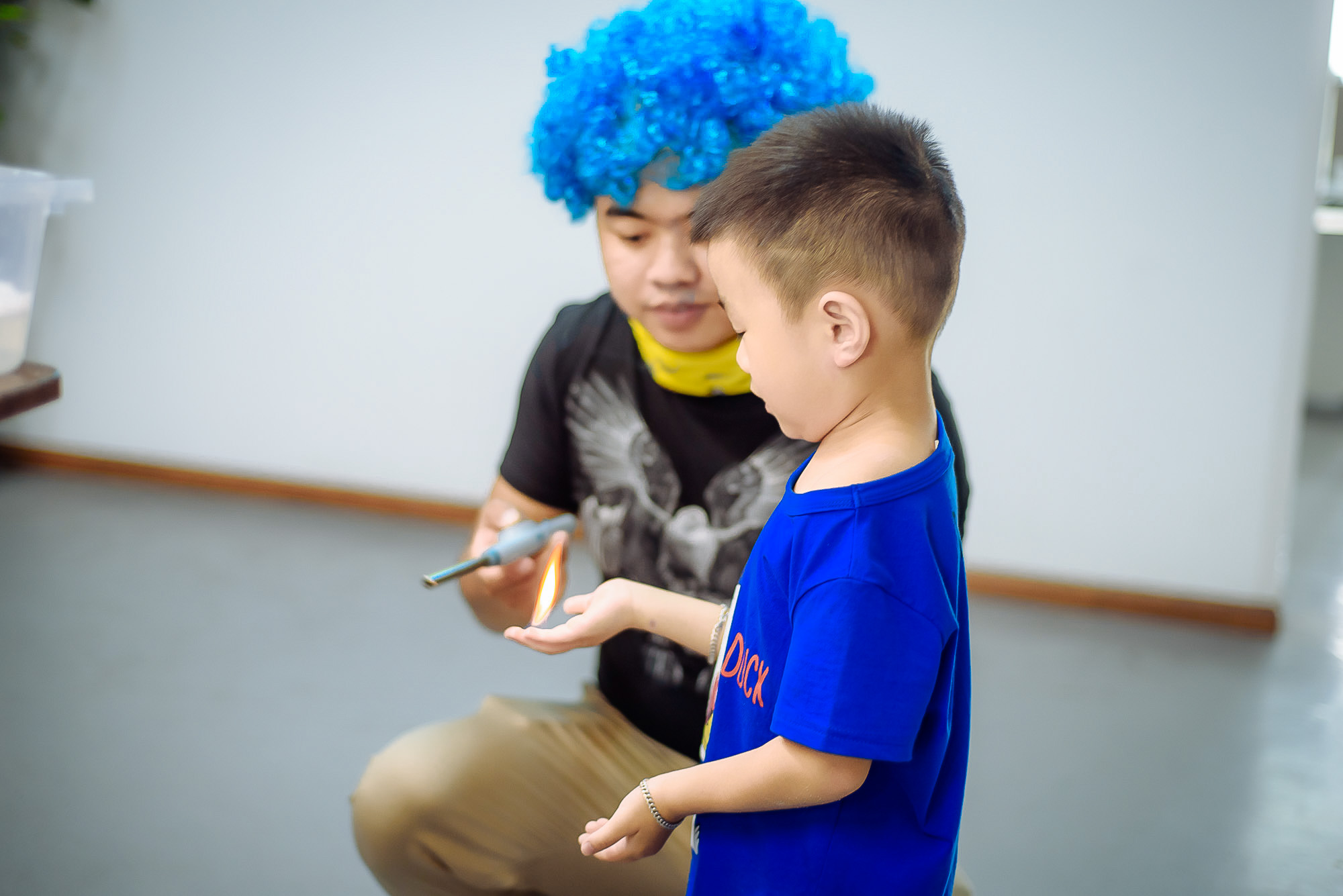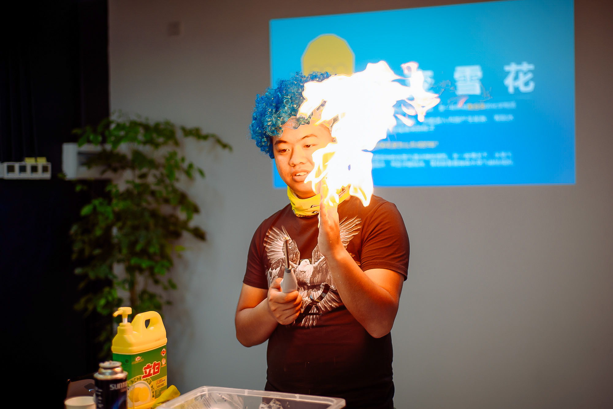 最后一个就是最惊险刺激的火焰掌了,话说这个火焰掌失传已久,只有有勇气的人才能修成正果哦!其实被点燃的是气泡里的丁烷,燃烧时手表面的水蒸发会带走热量,当丁烷燃尽后火焰就消失了,所以短暂的燃烧并不会烧到手的哦~我们的小小科学家们,都非常的有勇气,纷纷要求上来体验,他们说:“太刺激了”哈哈哈