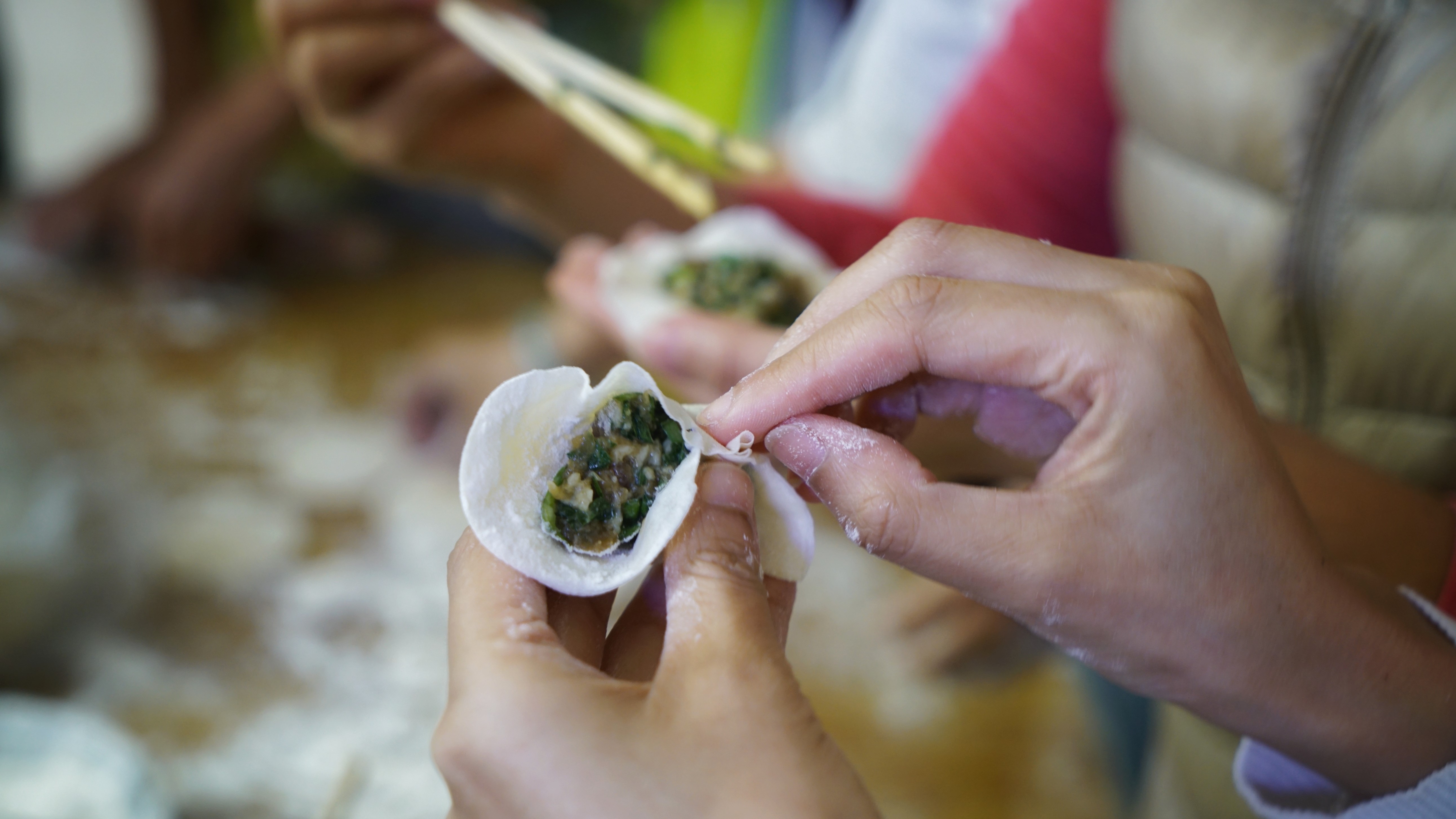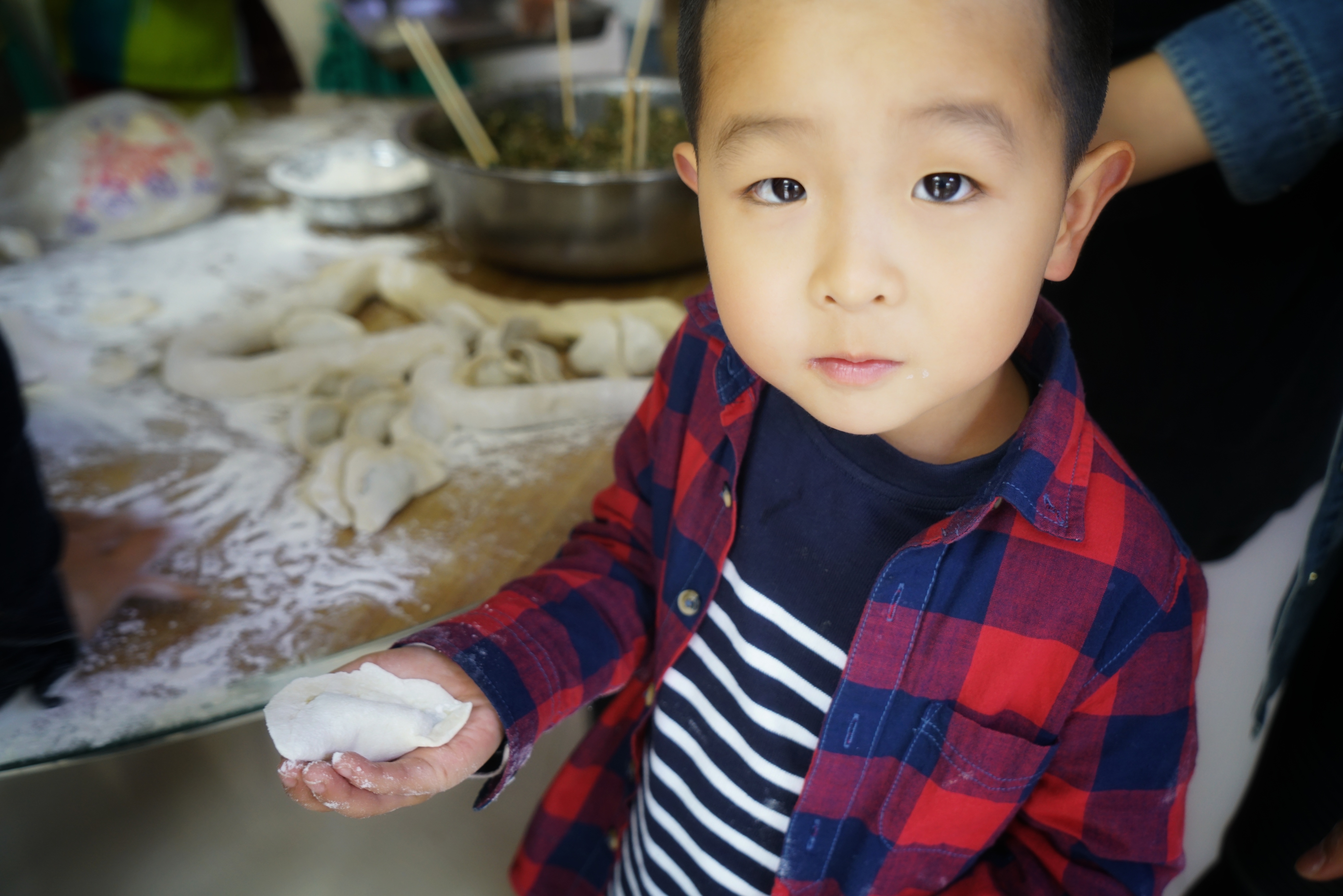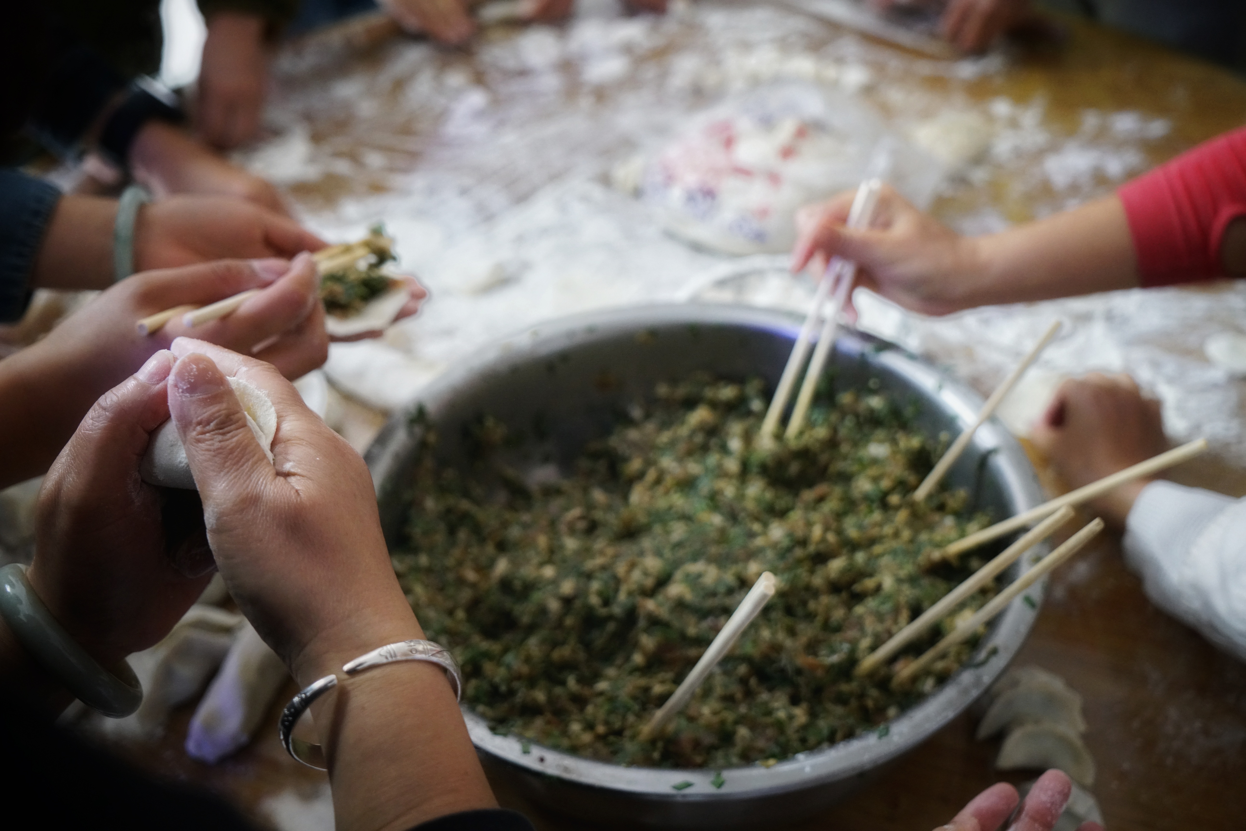 大家围作一团,从擀饺皮开始做起。有孤独的高手,也有现学现卖的学徒。气氛热闹得如同过节,一扫因为天气带来的失落。