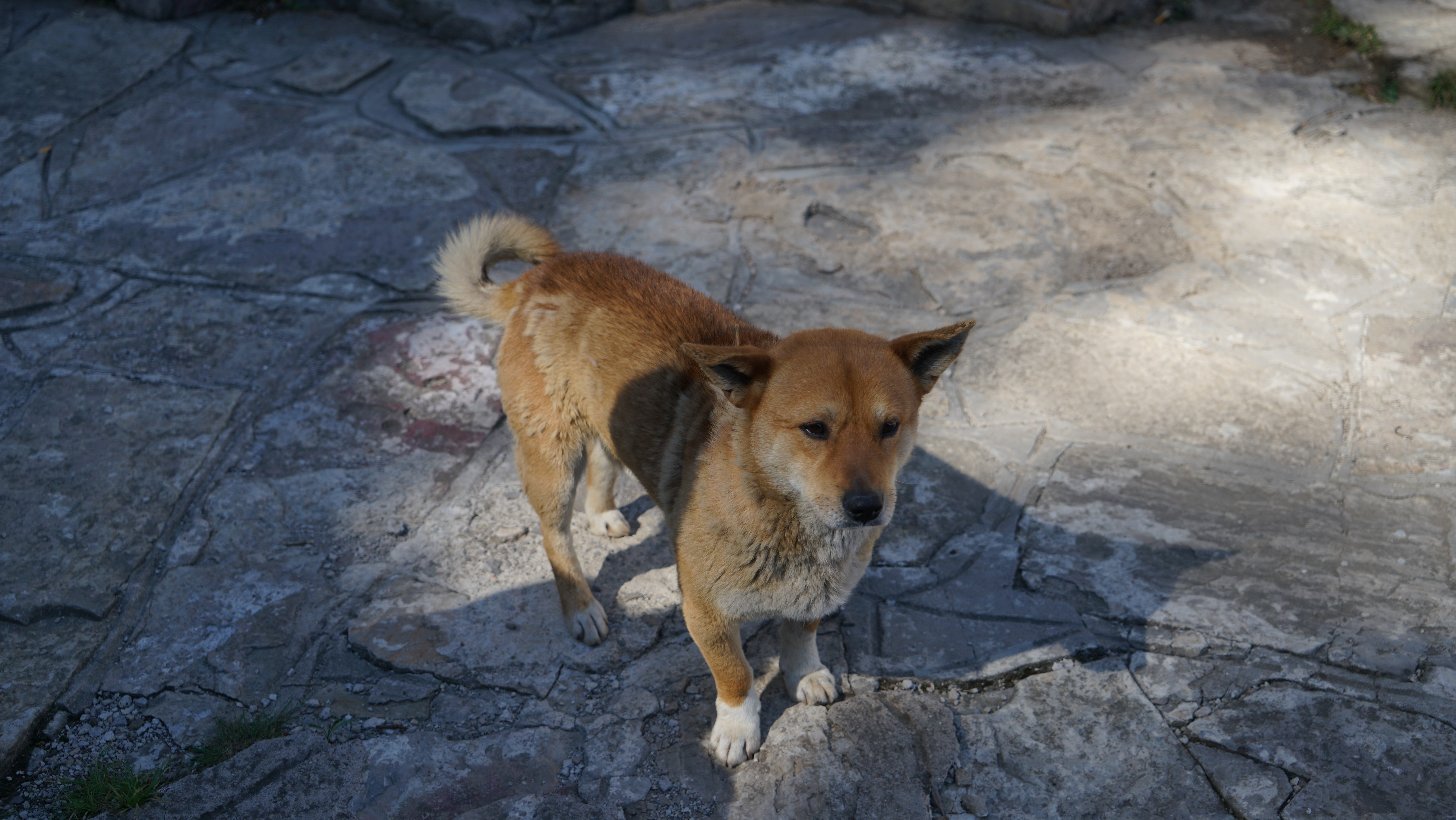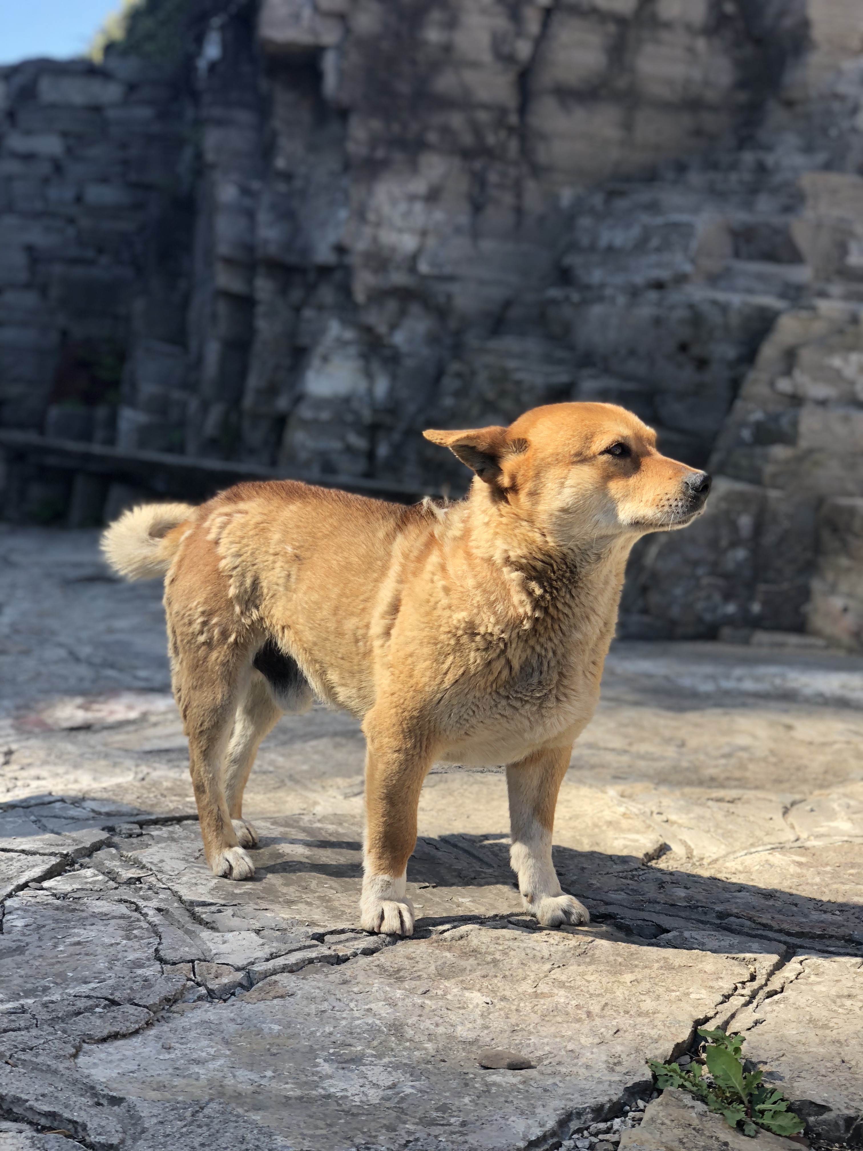 这次沿途认识了一只常年驻守在王莽岭上的狗,叫黄黄。主人说它吃得很少,但是很安静也很听话。几乎每个领队带队经过这里都会遇见它,流水的过客,铁打的黄黄,觉得阳光下的它有点帅。