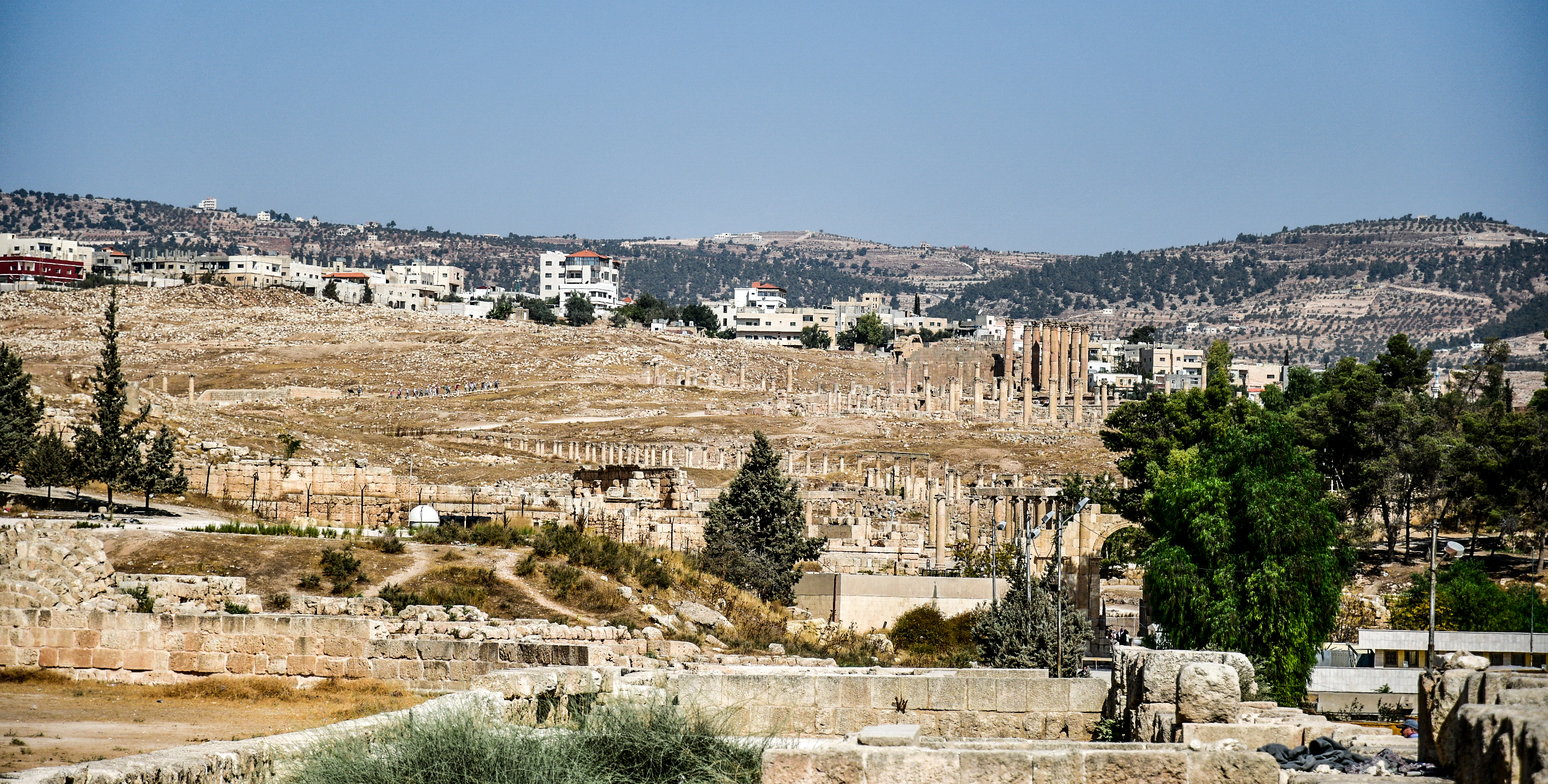 站在山坡顶上俯看整个杰拉什古城废墟——罗马的旧时光辉