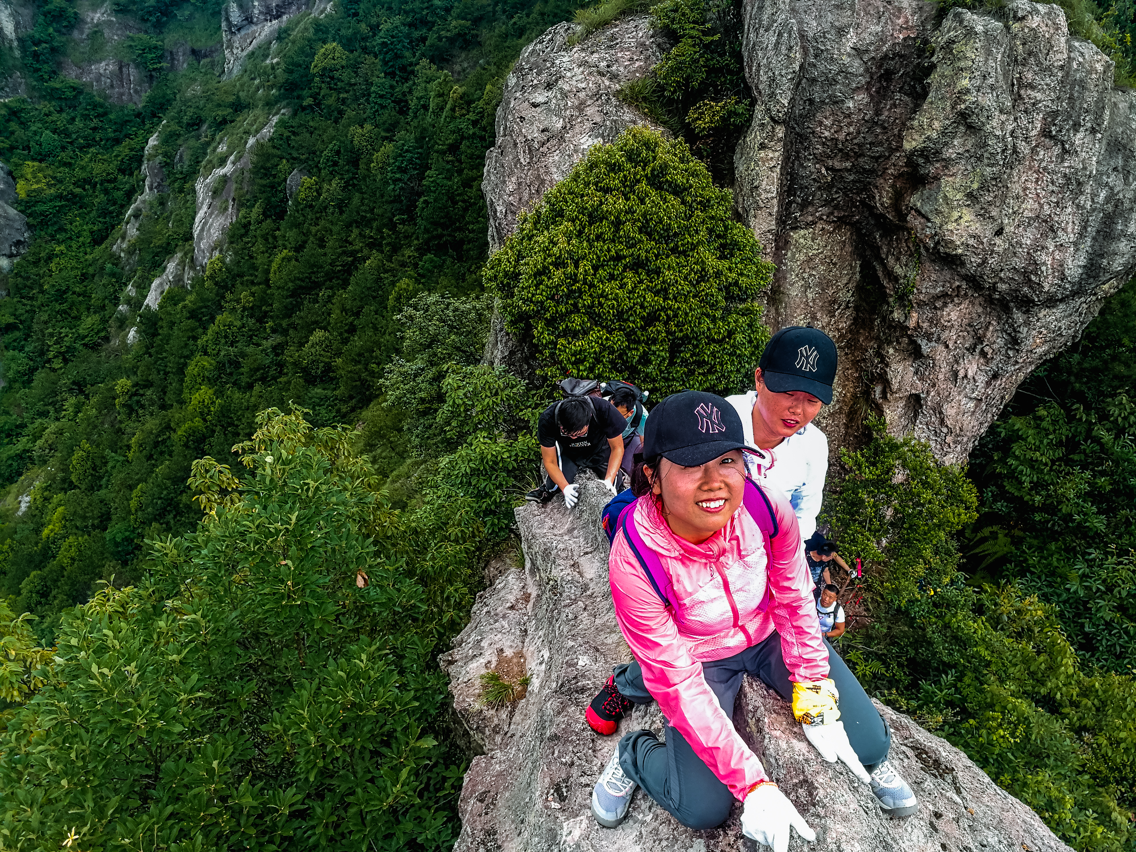 刀脊背,山体上高点的一段狭窄崖壁,光是近距离的照片是无法体会到现场的情形,两边都是陡峭的悬崖,只顶部一段十来米长的隆起崖壁,过来时需两脚踩着一脚宽的山体,伏在隆起山体上慢慢前行,这里的险峻只有亲临者才能切身体会,上海四人组一起过来,还玩起了千手观音的造型!
