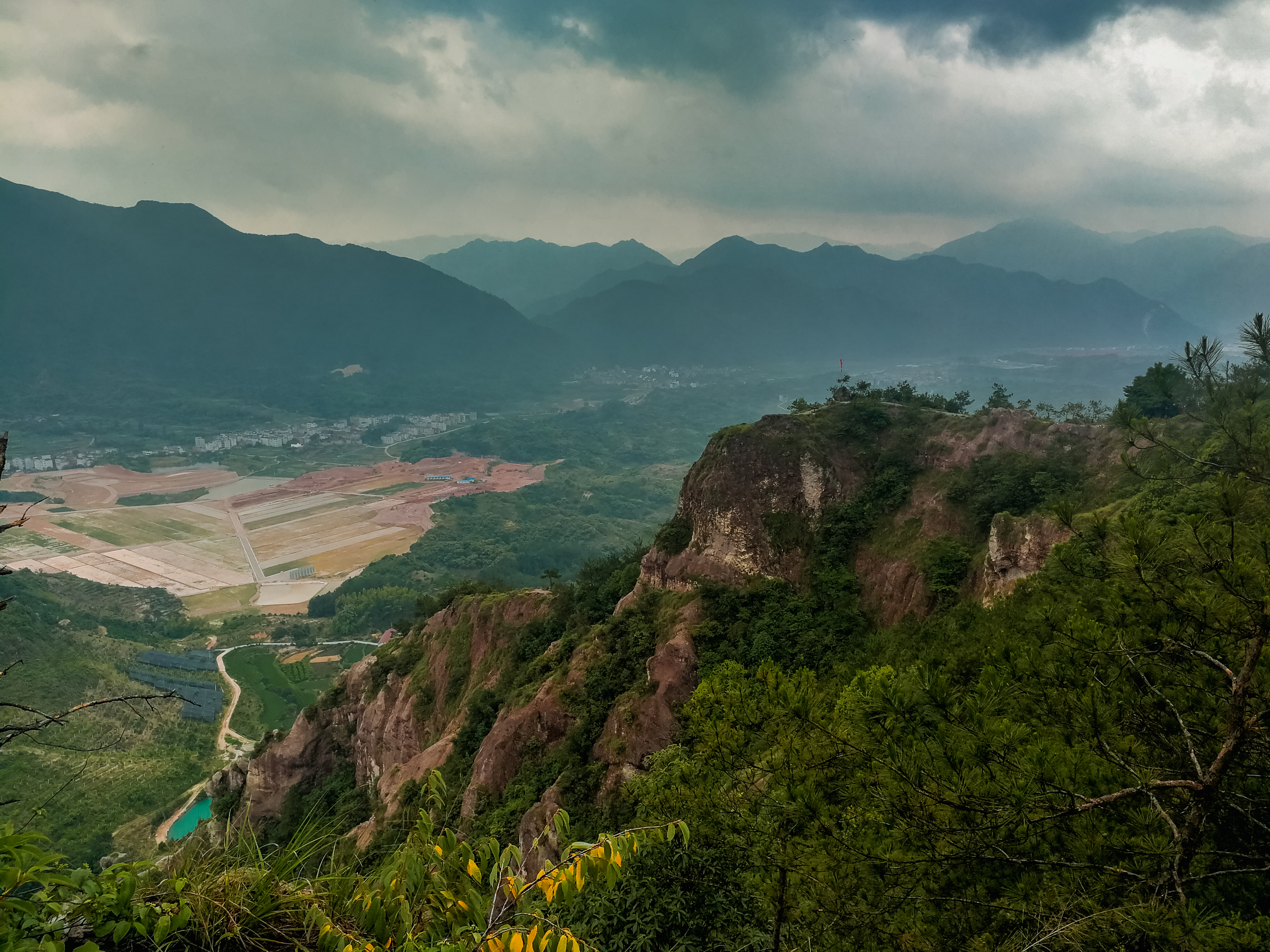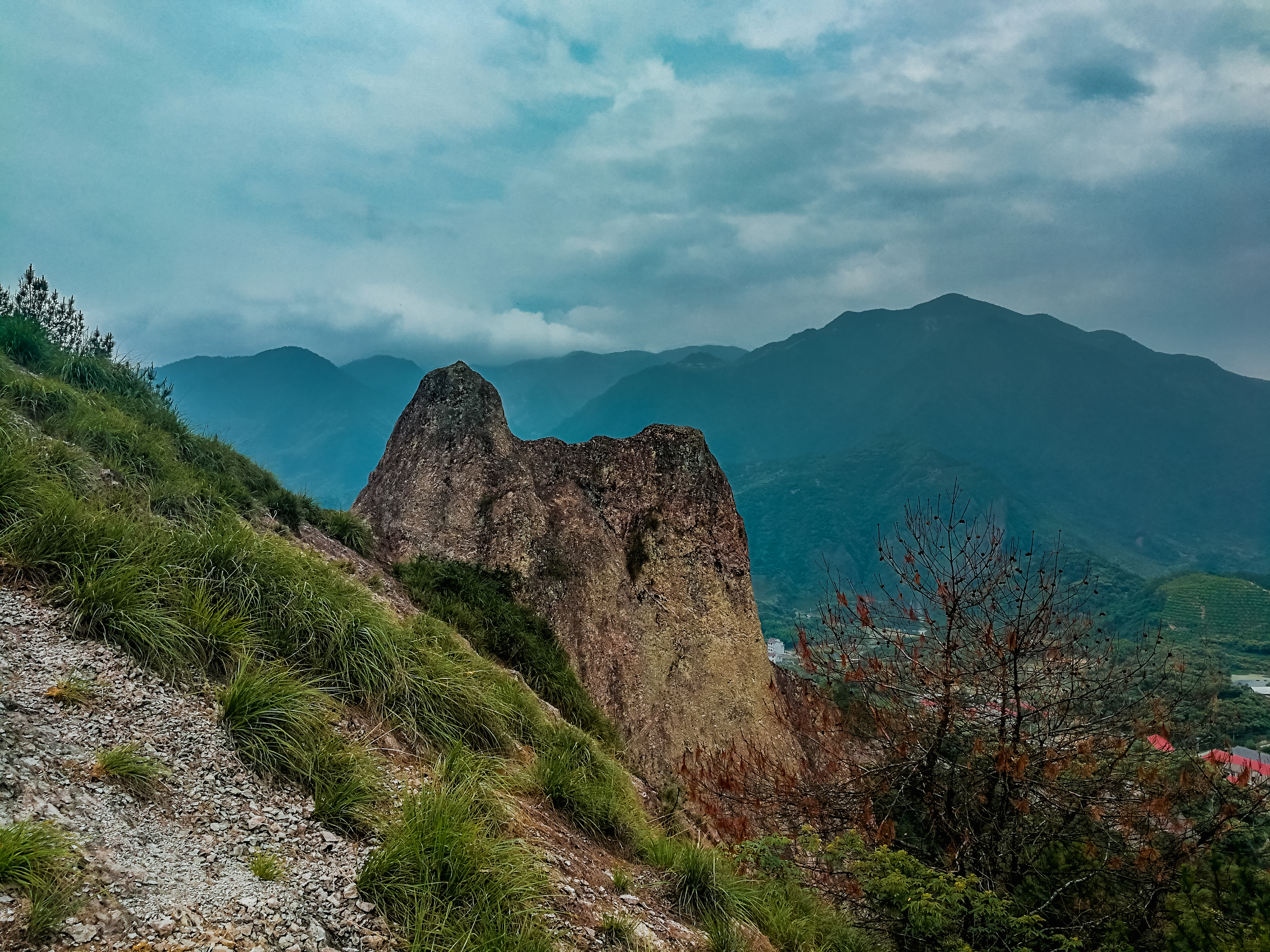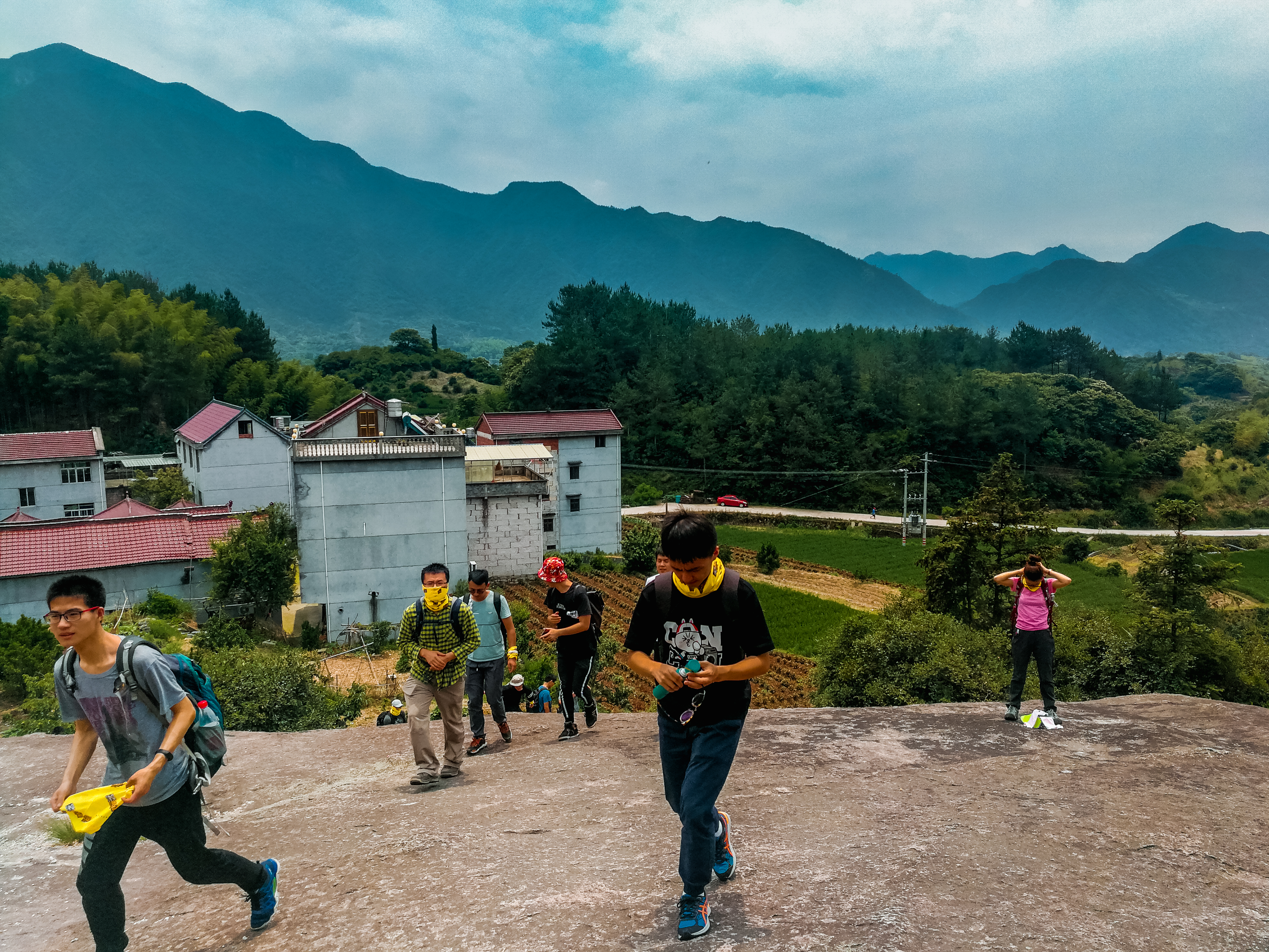 2018年5月26日,这一天之前,我们这个队伍中的每个人,都在期待着,马鞍岩,怎么听都是一个有趣的地方,充满着未知,关于马鞍岩的那些数字,是枯燥的无味的,比起切身体验走过的路,这些数字的确毫无意义,马鞍岩线路,路程6公里左右,落差300余米,似乎会有很多人特别在意这个,然而在一次次的行走以后就会发现,这些数字只是个象征的意义,对于一次行走来说没有什么用处。春末夏初,天气变幻无常,刚刚有过连续4天的突破35度,又迎来一阵疾风骤雨,所有从网络里查到的天气预报都在说,26日,肯定有雨,而最新的,甚至是在26日清晨发布的24小时预报里,这天的上午和下午都会有至少两小时左右的雷阵雨时候,对于一条包含崖壁攀爬路段的行走活动来说,下雨总是影响最大的,甚至会让我们不得不临时调整路线,放弃绝大部分崖壁的攀爬,而改为好走的小路,近观或远眺那些亿万年前形成的天然崖壁。这天,我们出发,这天,从徒步开始到结束,只是在离开山野来到机耕路的平地上才迎来一阵急雨,仿佛是来为我们洗去征尘 ,小水库边满坡的桃树,绿叶红果分外显眼,就一个字:鲜!上海来的四人组,有活跃有激情有造型,小马老马父子两,7岁的孩子照样跟我们一起抓着钢索攀岩而上,向导老丁,65岁根本看不出,攀山崖走野路跟走平路一样,不由心生佩服,新晋领队犀牛,心细如发,又一次背着西瓜上来,在山巅处为我们献上一顿最适合不过的美餐!
