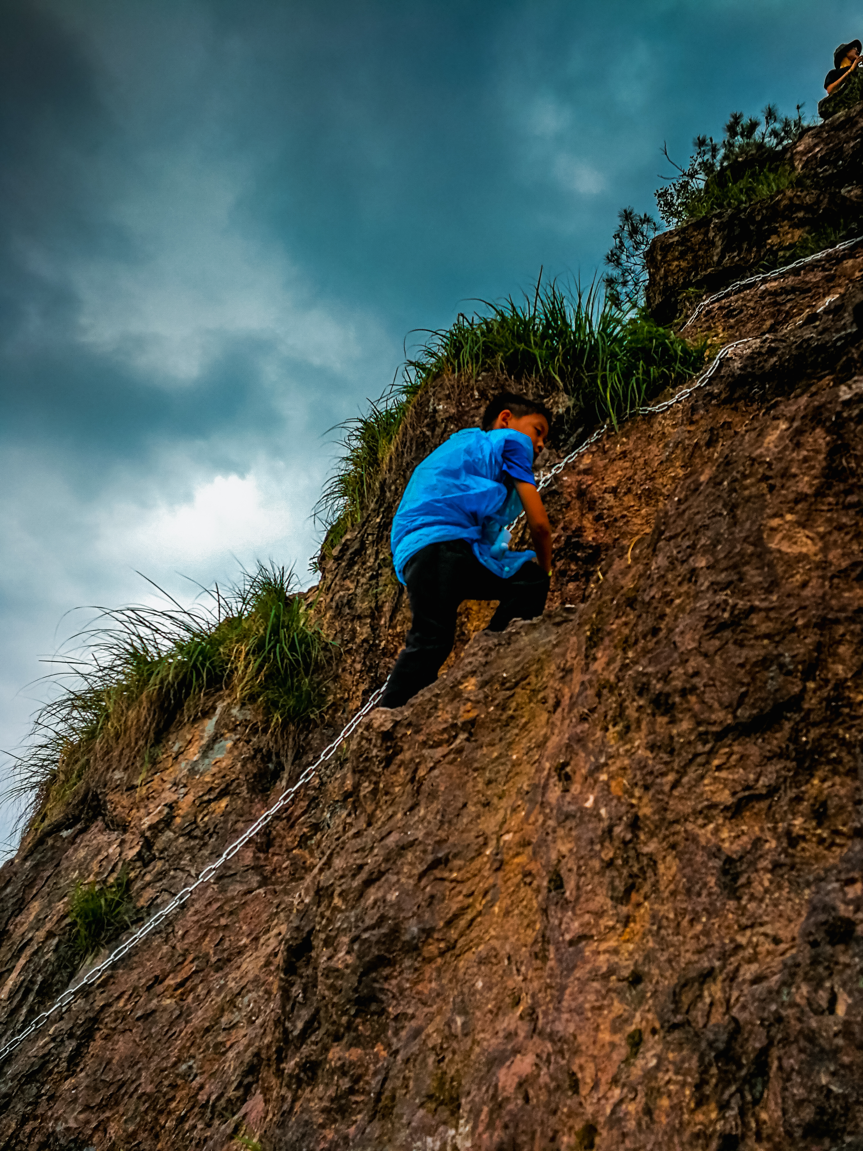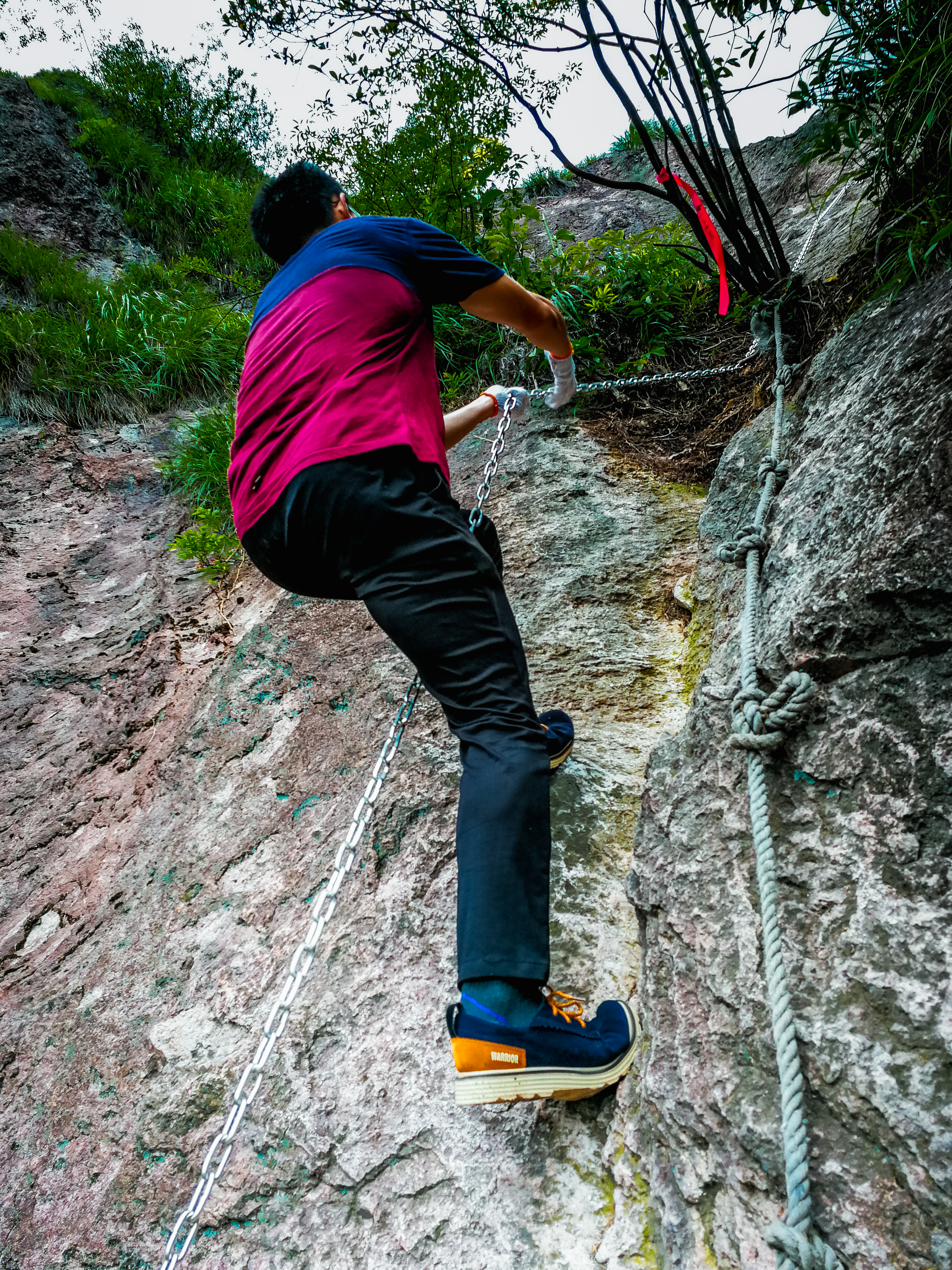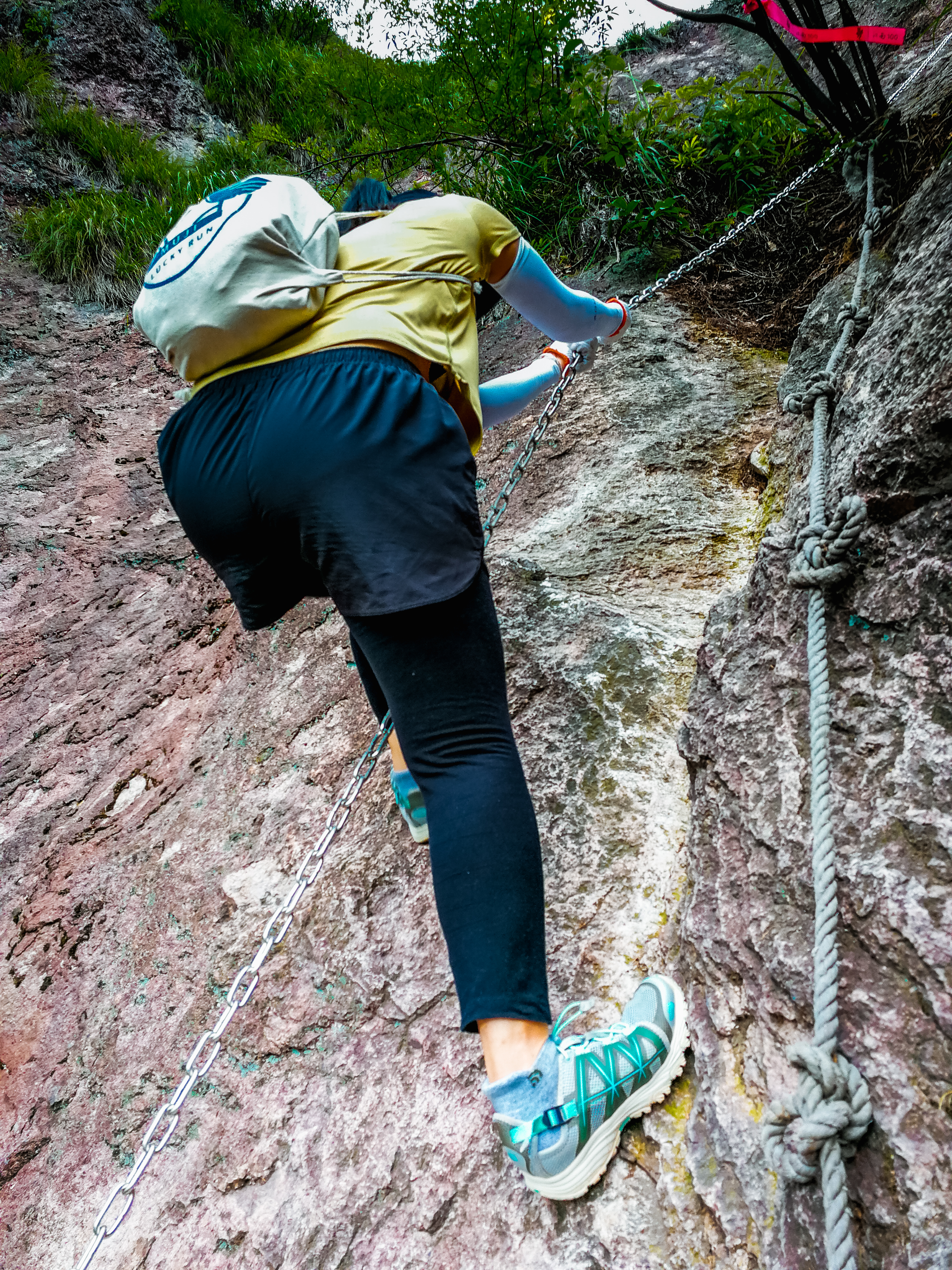 这里的崖壁,都是稳定的岩体,这段路坡度达到60多度,纵使这里的崖壁表面比较粗糙,摩擦力大,很适宜攀爬,但考虑到这个坡度对于绝大多数人来说还是难于攀登这里现在设置了方便抓握的钢索,攀爬而上的感觉,人人都兴奋不已