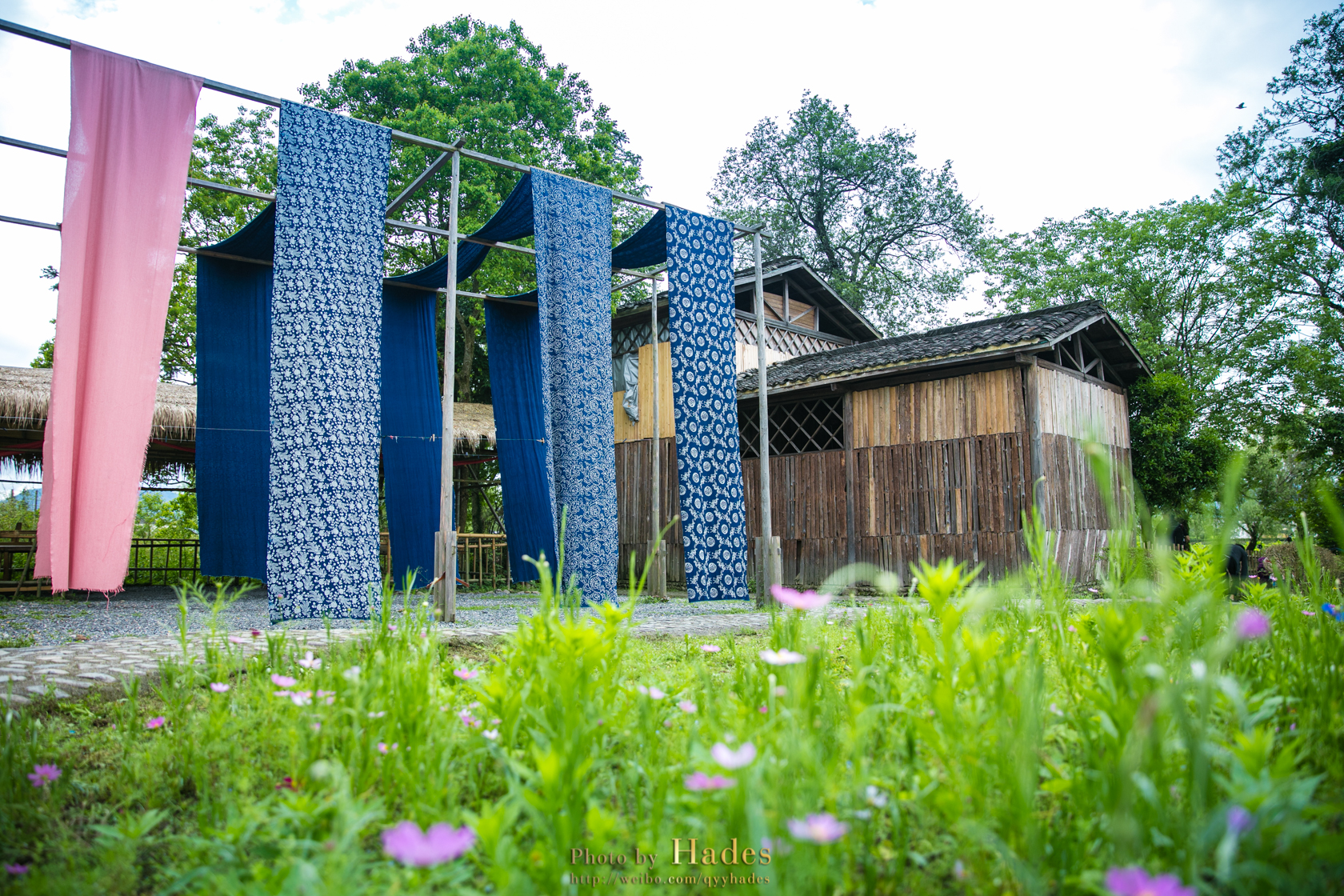 跨过古朴的石桥,在林木掩映之中,隐约可以看到高架上随风飘动的蓝布。这样的架子,这样的靛蓝色,不禁让人想到了乌镇的蜡染。没错,这就是一座染坊。
