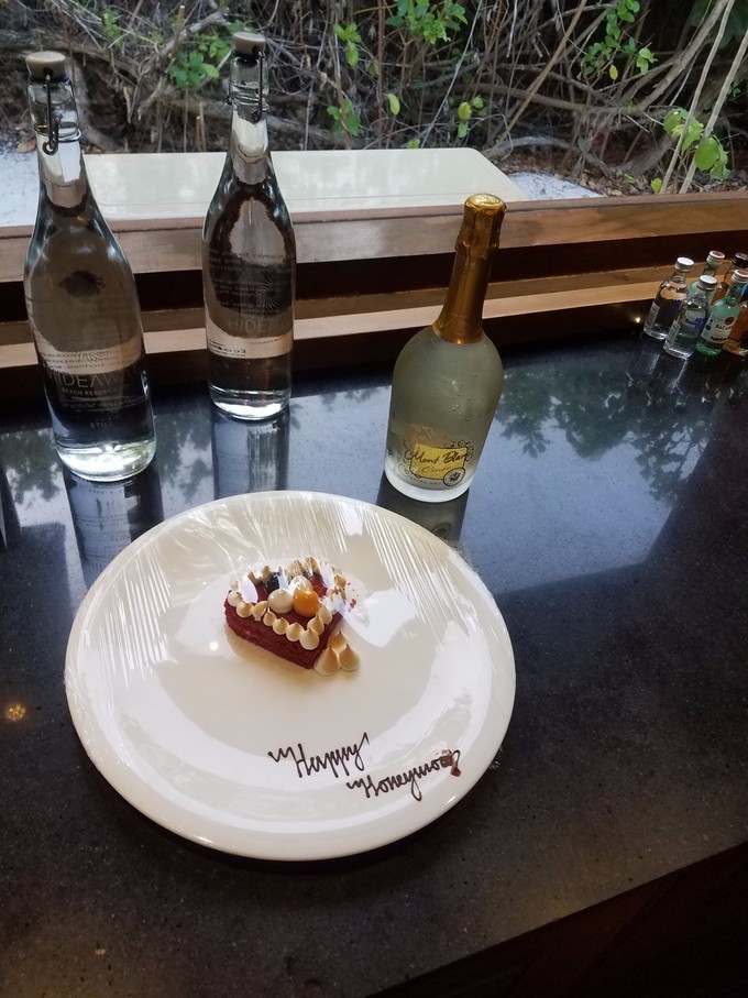 酒店铺的蜜月房,照片顺序可能有颠倒,抱歉.关于申请蜜月套餐这里要讲一下,你从哪里订,就可以要求哪里的工作人员给你申请,一般是半年以内的结婚证。当然我五月领的证,十二月去曼德芙享受了,3月去神仙珊瑚也有享受,自己P一下就行,酒店那里一般是不需要证件提供的,只要你的客服给你申请了,基本都有,每个岛的福利也不同,曼德芙和神仙珊瑚是一样的,就是一瓶香槟一份蛋糕一个铺床,神仙的香槟好,但是曼德芙是个大蛋糕,神仙是个很抠门的小甜品