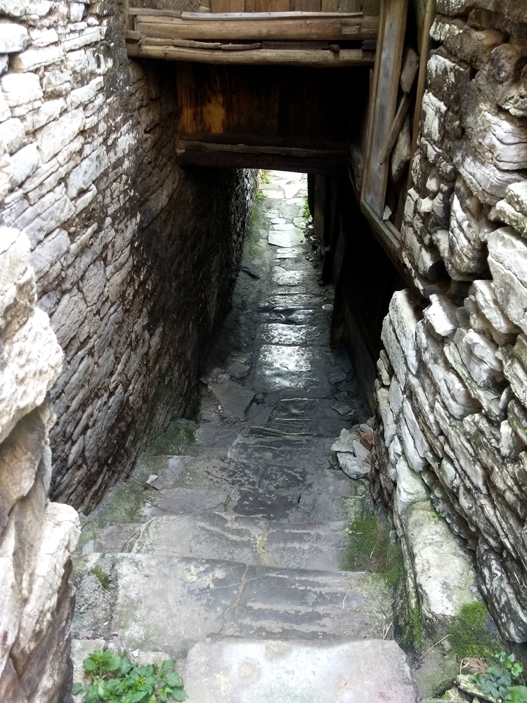 这是从"九道坎"拐到入另一巷道的“拐角”:厚厚的石板墙、一摞碎石板。。。真正的攻守兼备啊!