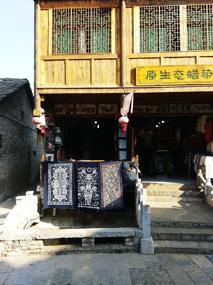 卖蜡染画的摊子:仔细看画作品非常漂亮、很有特色。。。