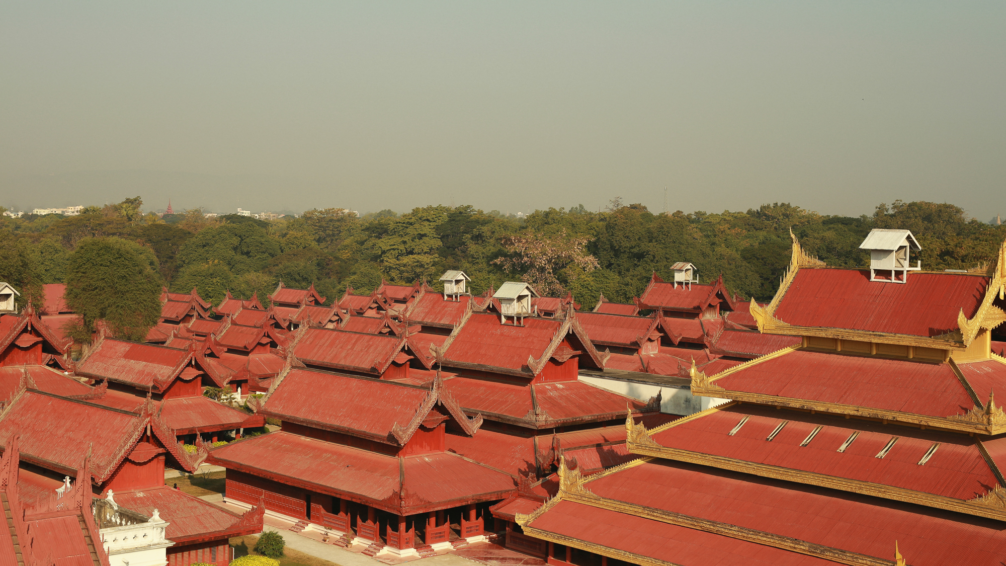 曼德勒皇宫,皇宫有两个地方必定要到,一个是高三十三公尺的瞭望塔,爬上一百二十一级楼梯后,便会鸟瞰整个皇宫及曼德勒市的景色。