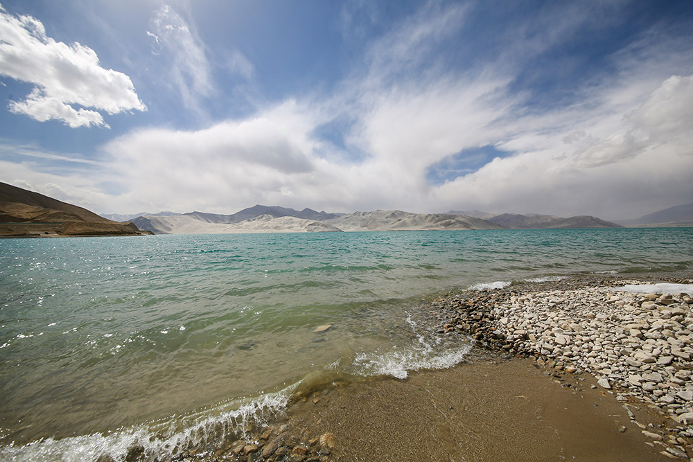 午餐后继续攀升,海拔逐步提高,沿途眺望有“南疆火焰山”之称的奥依塔克红山。到达盖孜检查站接受检查,继续前行到达布伦口白沙湖,下车拍摄白沙湖幻境奇观和白沙山,但天气不给力。